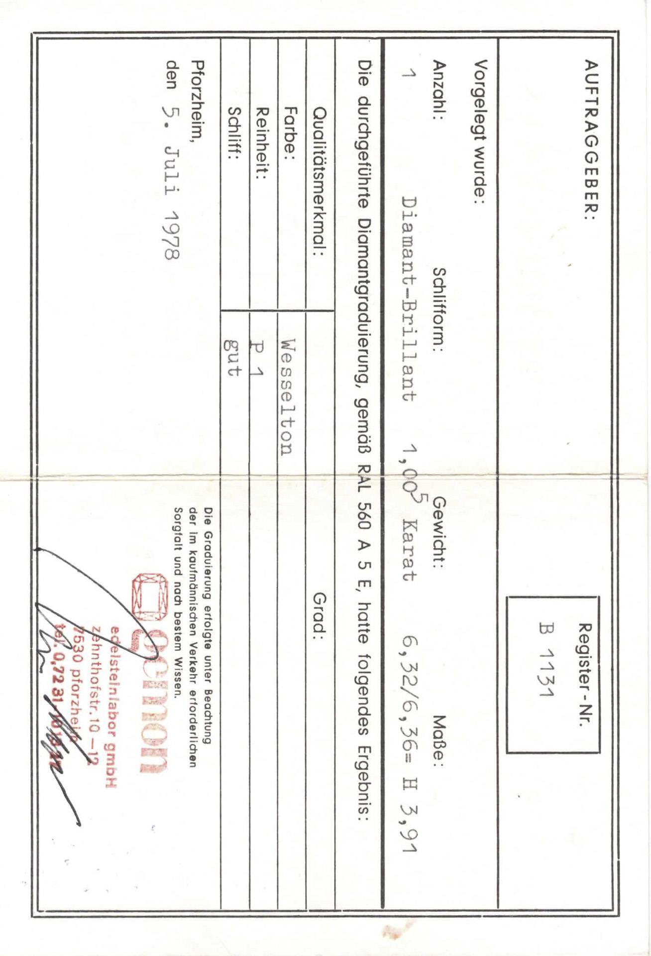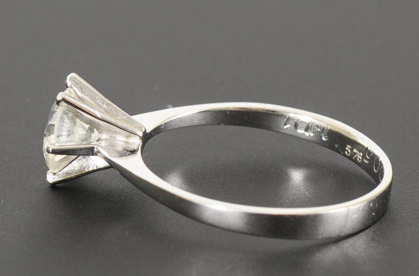 Weißgold 585 gestempelt. Ringgröße 54, der Brillant laut Gravur und Gutachten 1,005 ct, Farbe weiß/PI. 1,9 g.