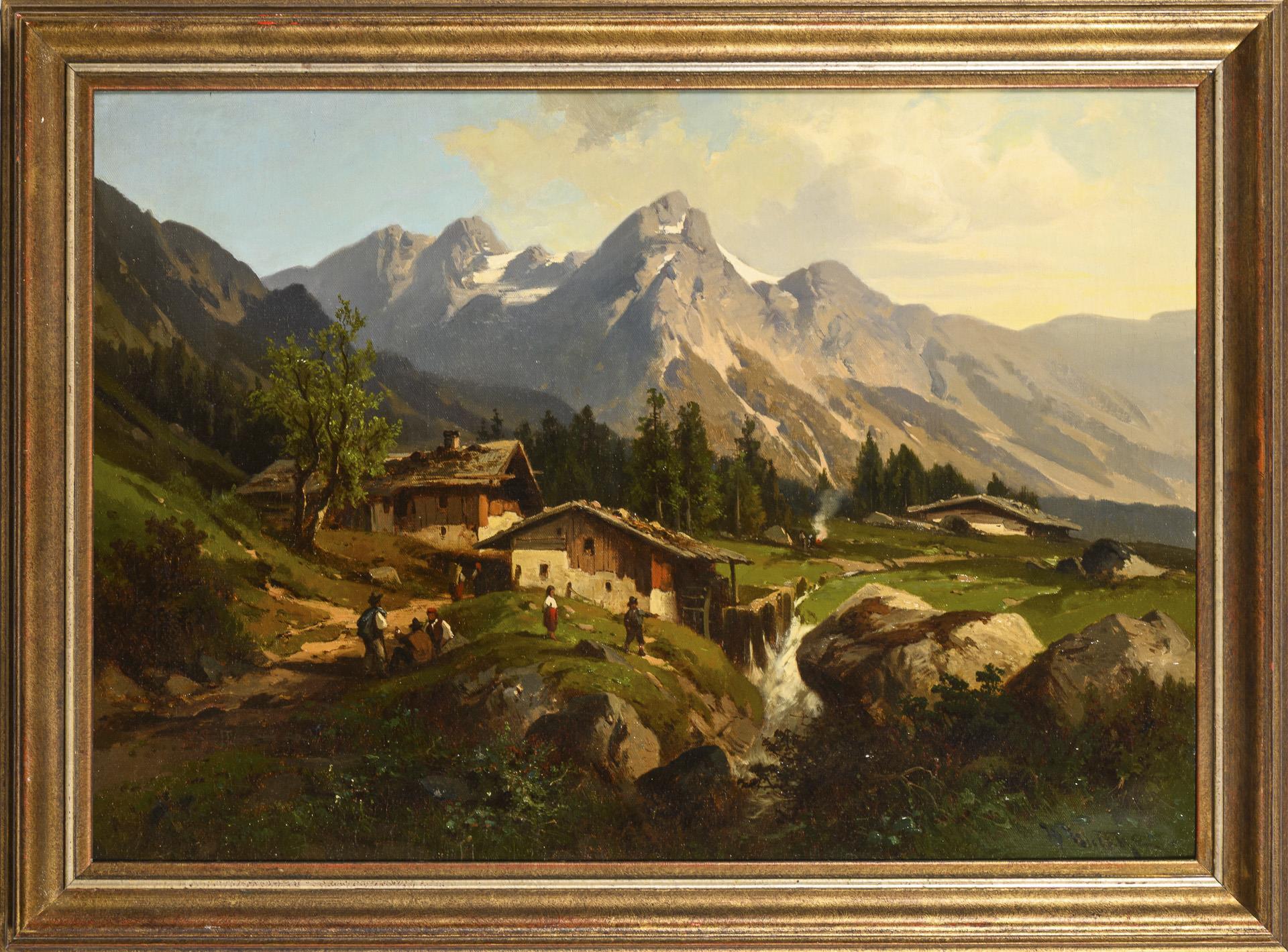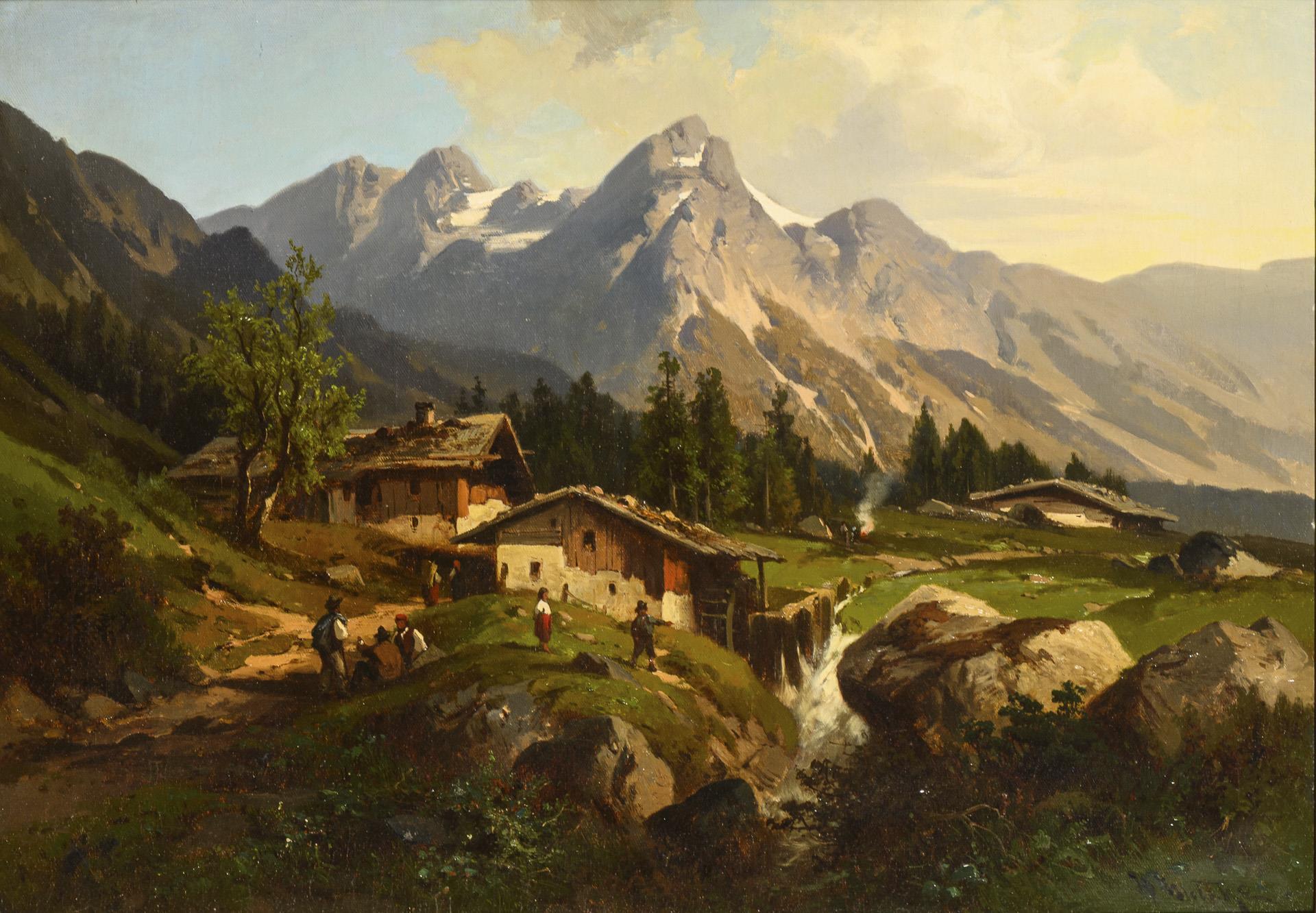 Staffagefiguren vor der Wassermühle im Sonnenschein mit Blick zum Gebirgszug am Horizont. Eine restaurierte Stelle mit Hinterklebung.