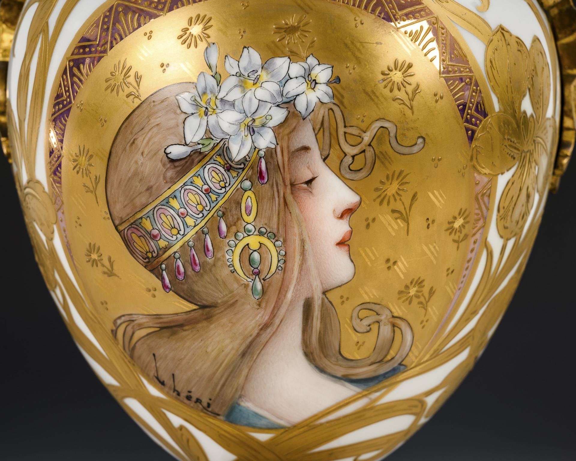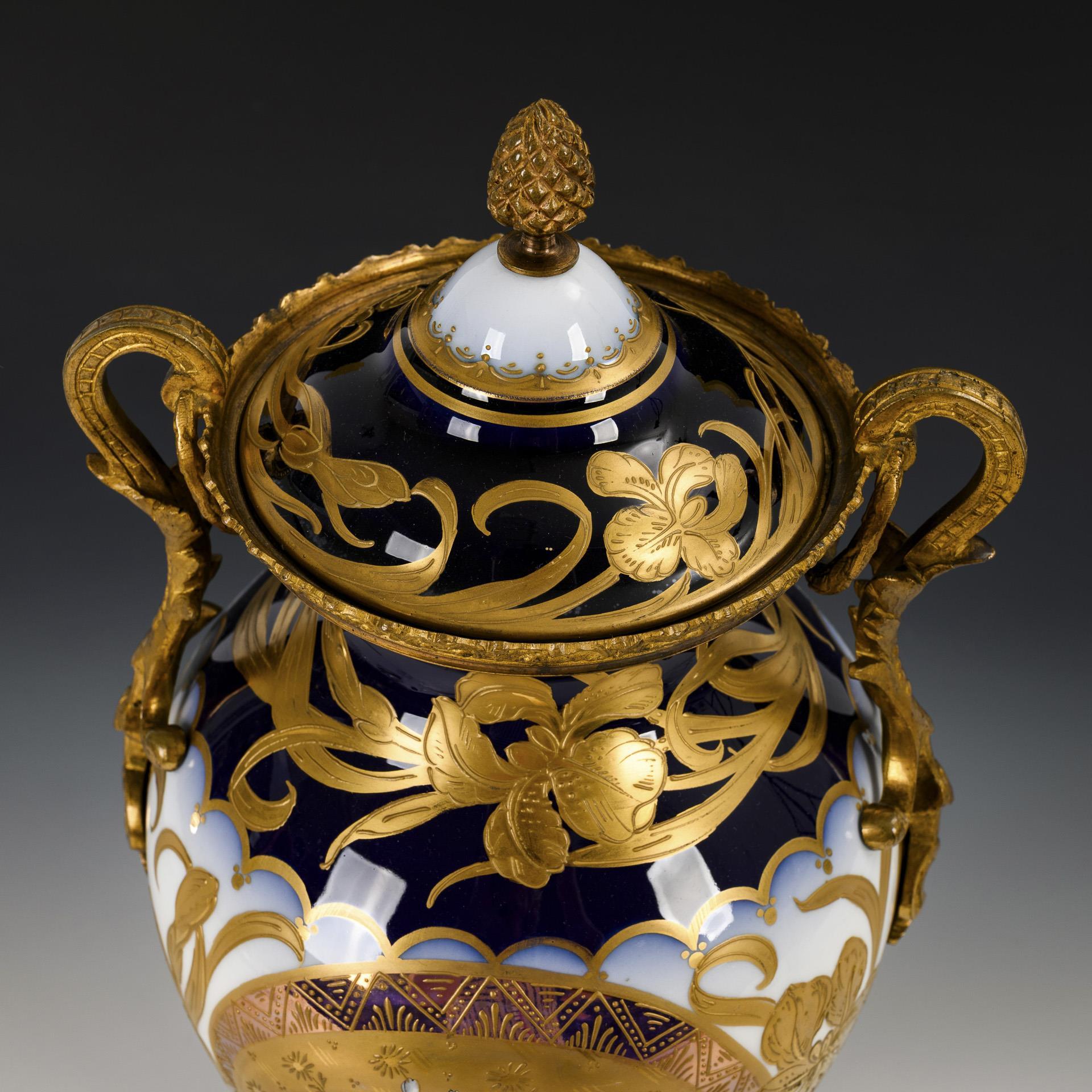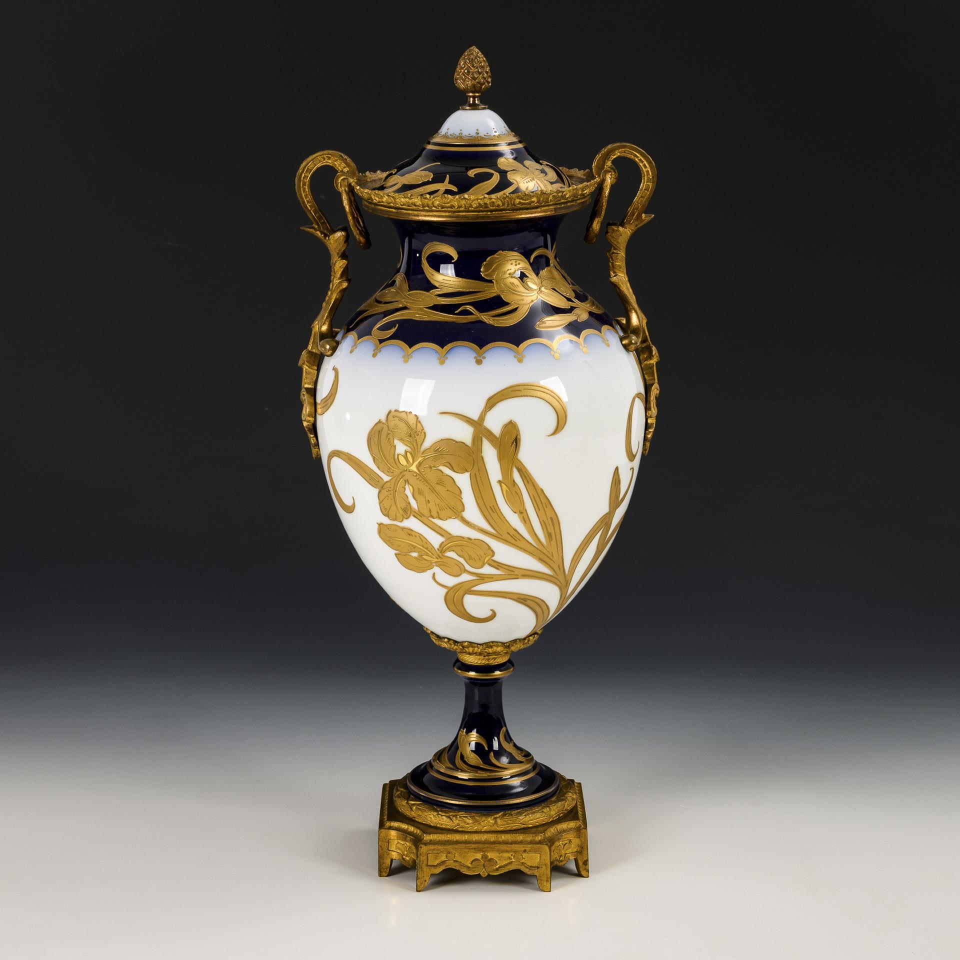Ovoider Korpus mit Knaufdeckel und Rundfuß, bronzemontierten Henkeln, Rand, Knauf und Sockel. Kobaltblauer Teilfond, auf der Wandung goldreliefgemalte Schwertlilien, schauseitig die Malerei eines Jugendstil-Frauenkopfes vor Goldfond.