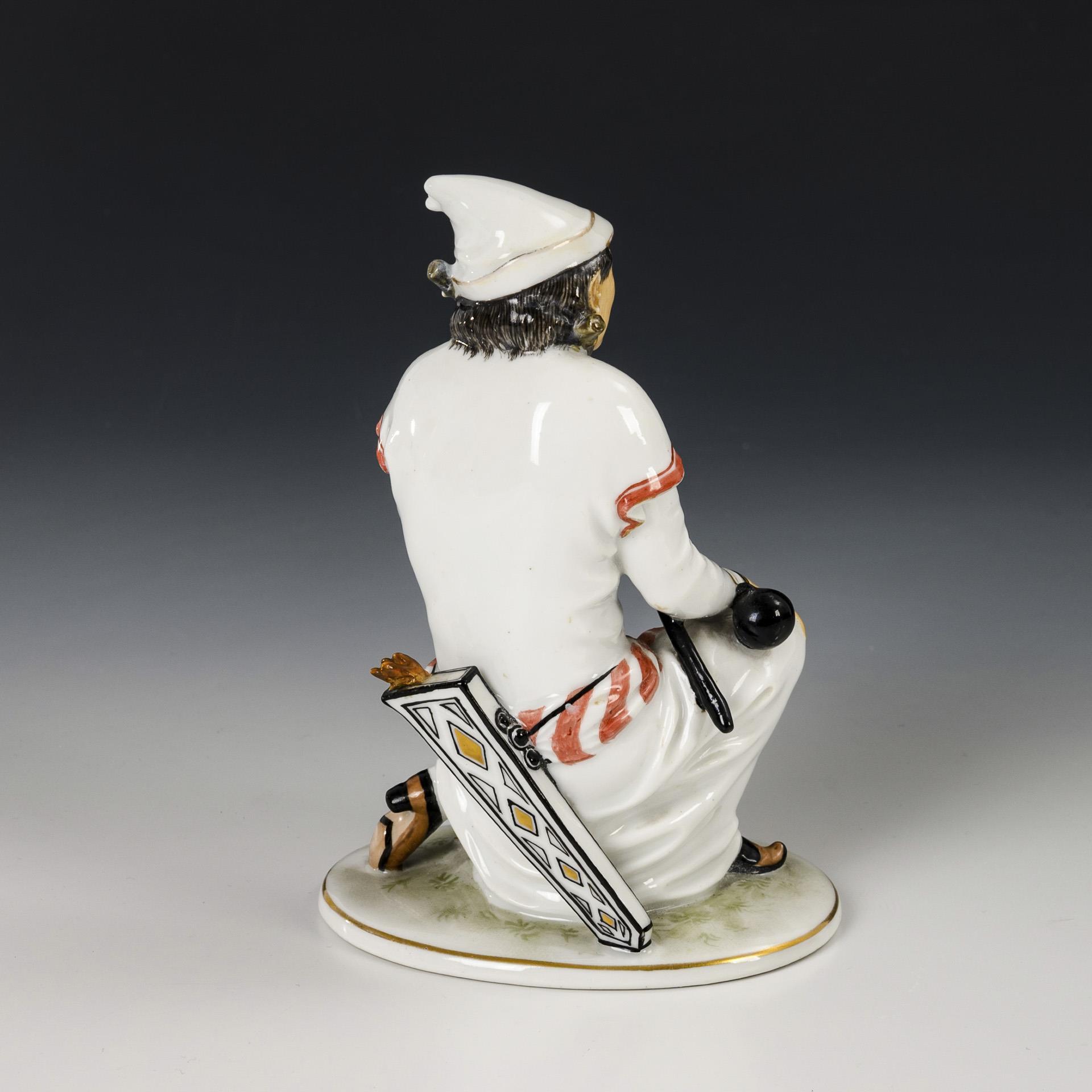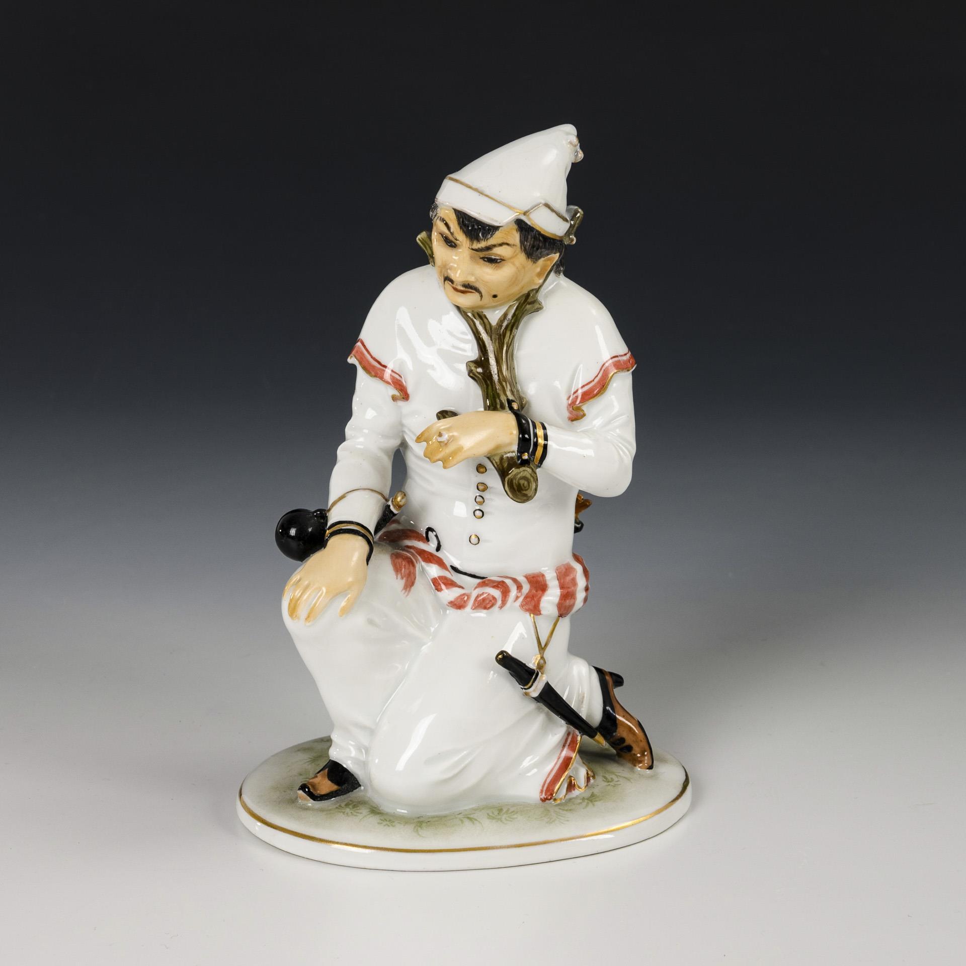 Figur eines knienden Mannes mit Fesseln. Stock, 1 Astende und Pfeilenden restauriert.