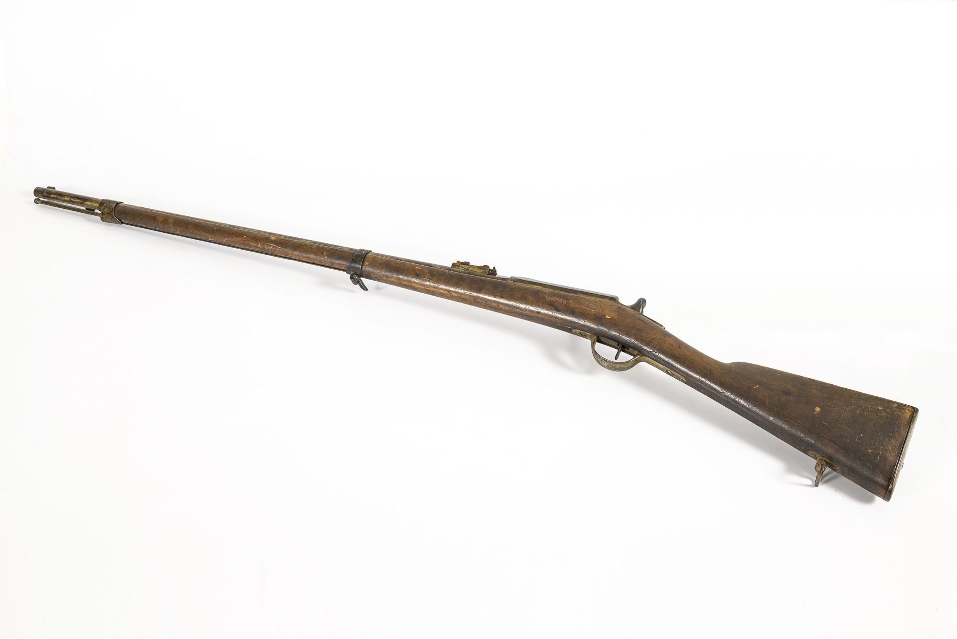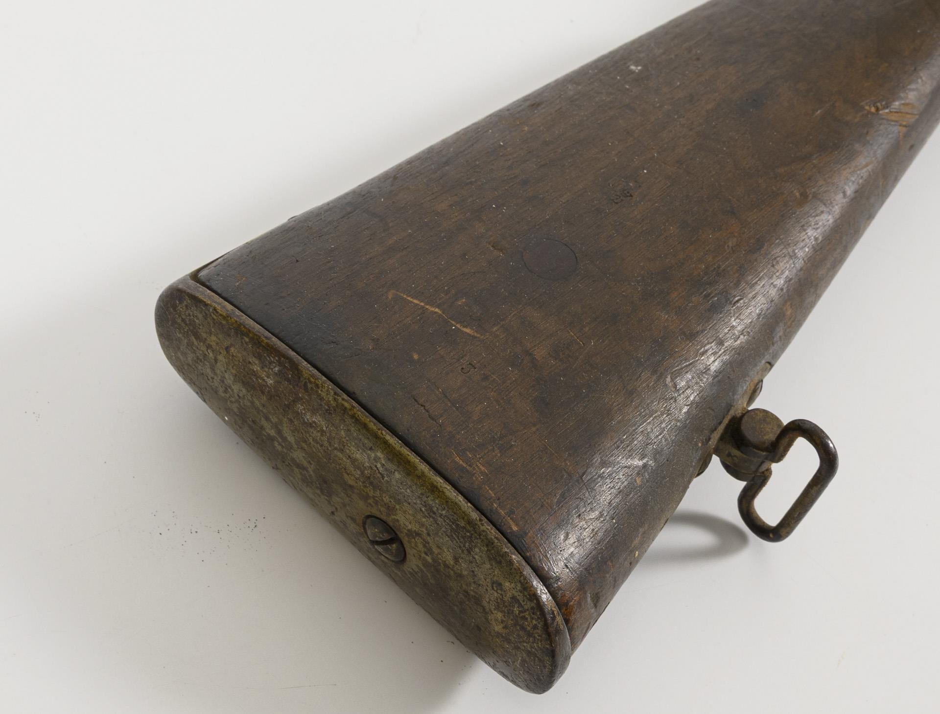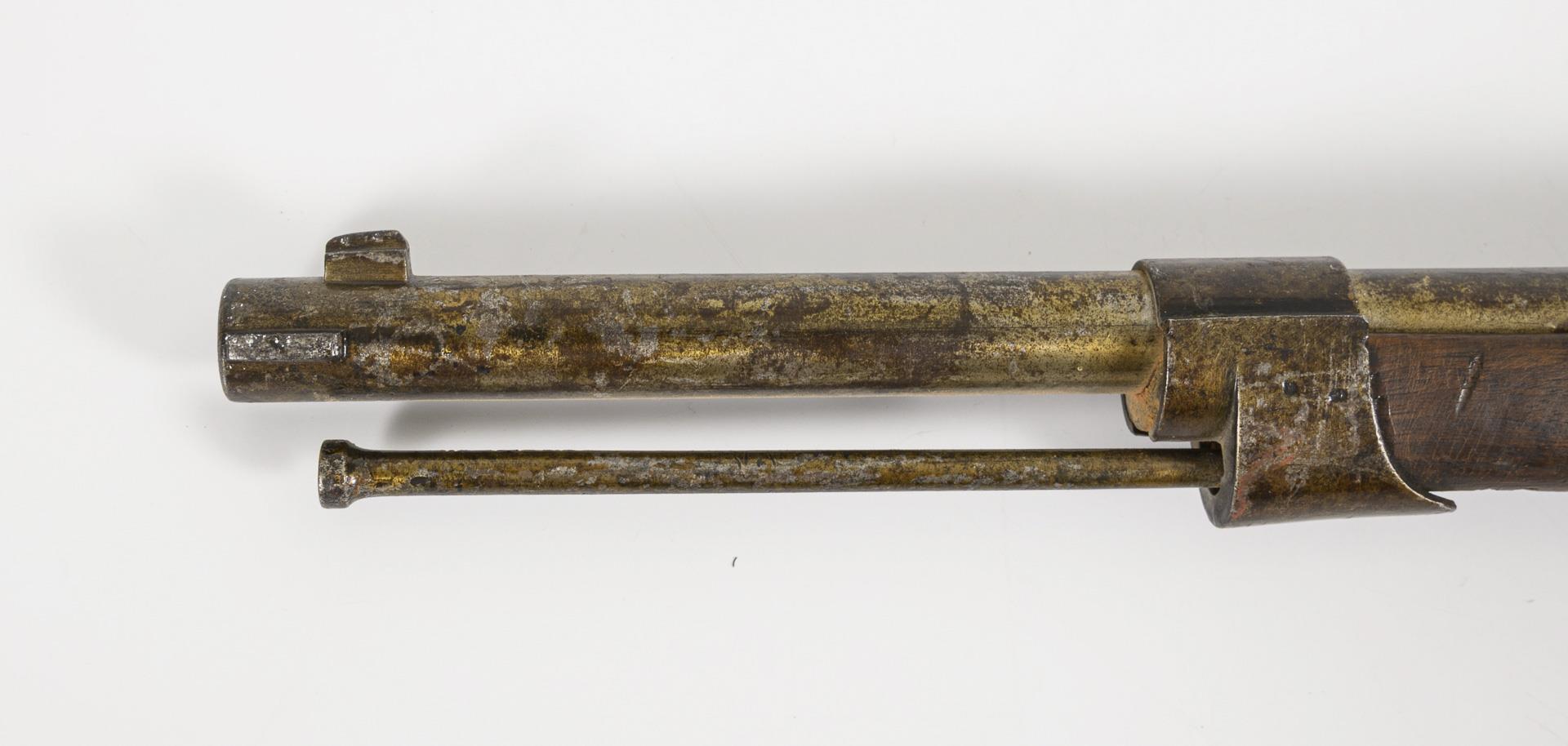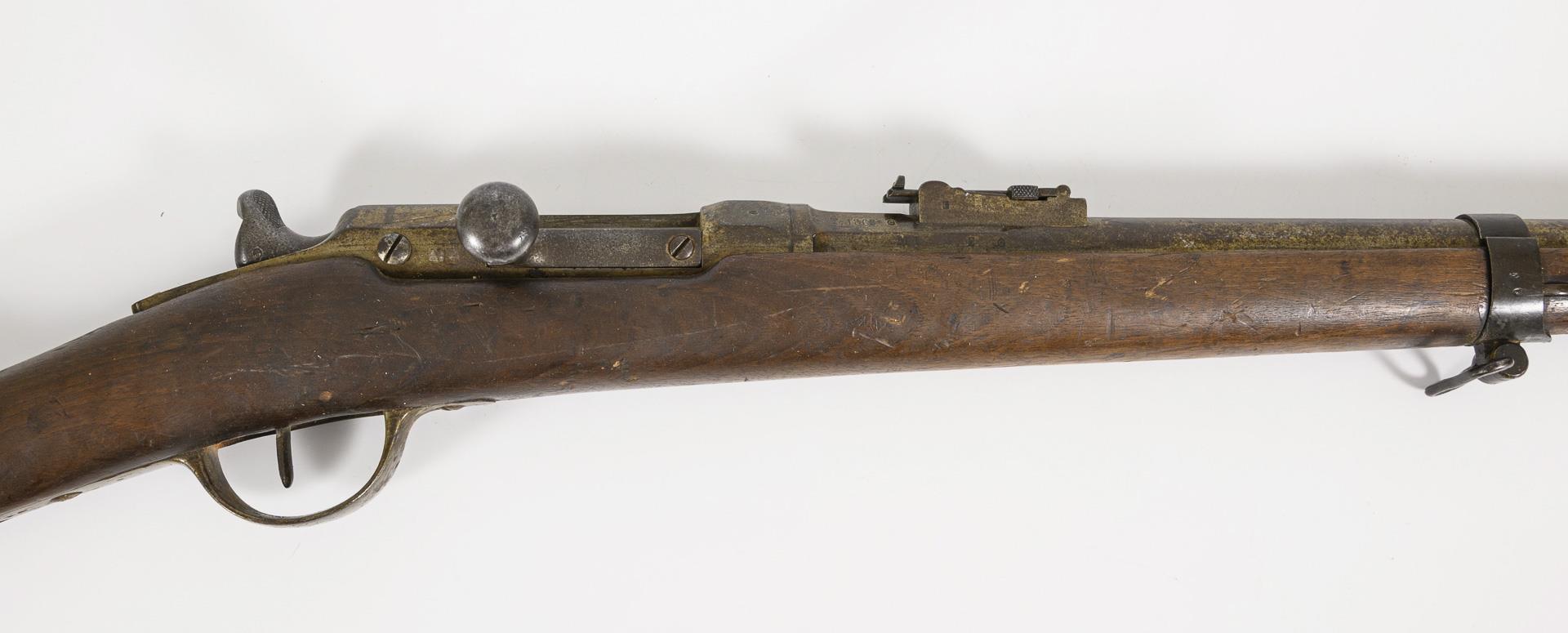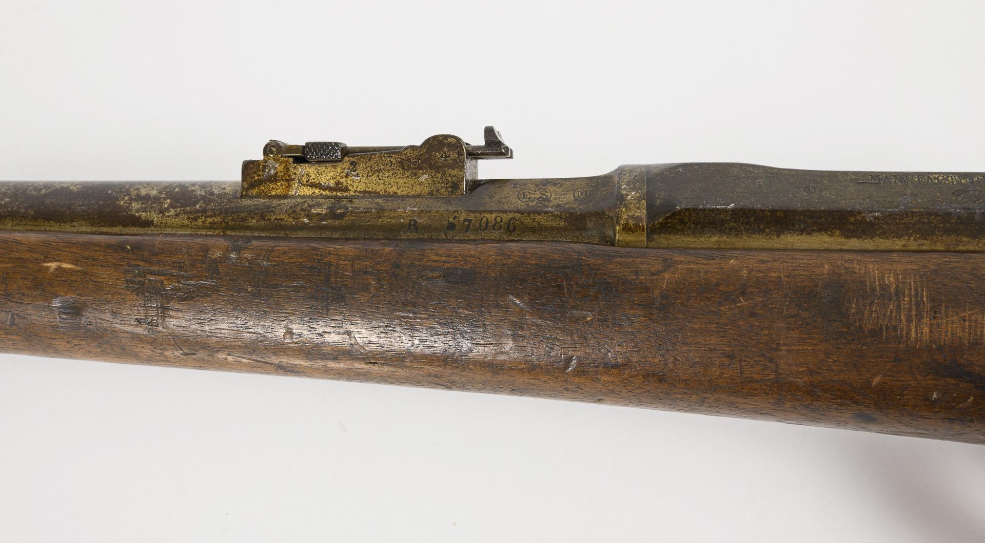 Langer, glatter Lauf mit kleinem Kaliber, einfacher Holzschaft. Truppenabnahmestempel 1868. Verschiedene Punzen, auf dem Lauf: "ES" im Doppelkreis; "M" im Kreis; "T 1868"; "G"; auf dem Bolzen: "G 70249"; Schaft: "K 40450" und stempelartiger Abdruck "MARS MA 18..". Konservierte Alters- und Gebrauchsspuren. Bolzen beweglich. Zieleinrichtung.