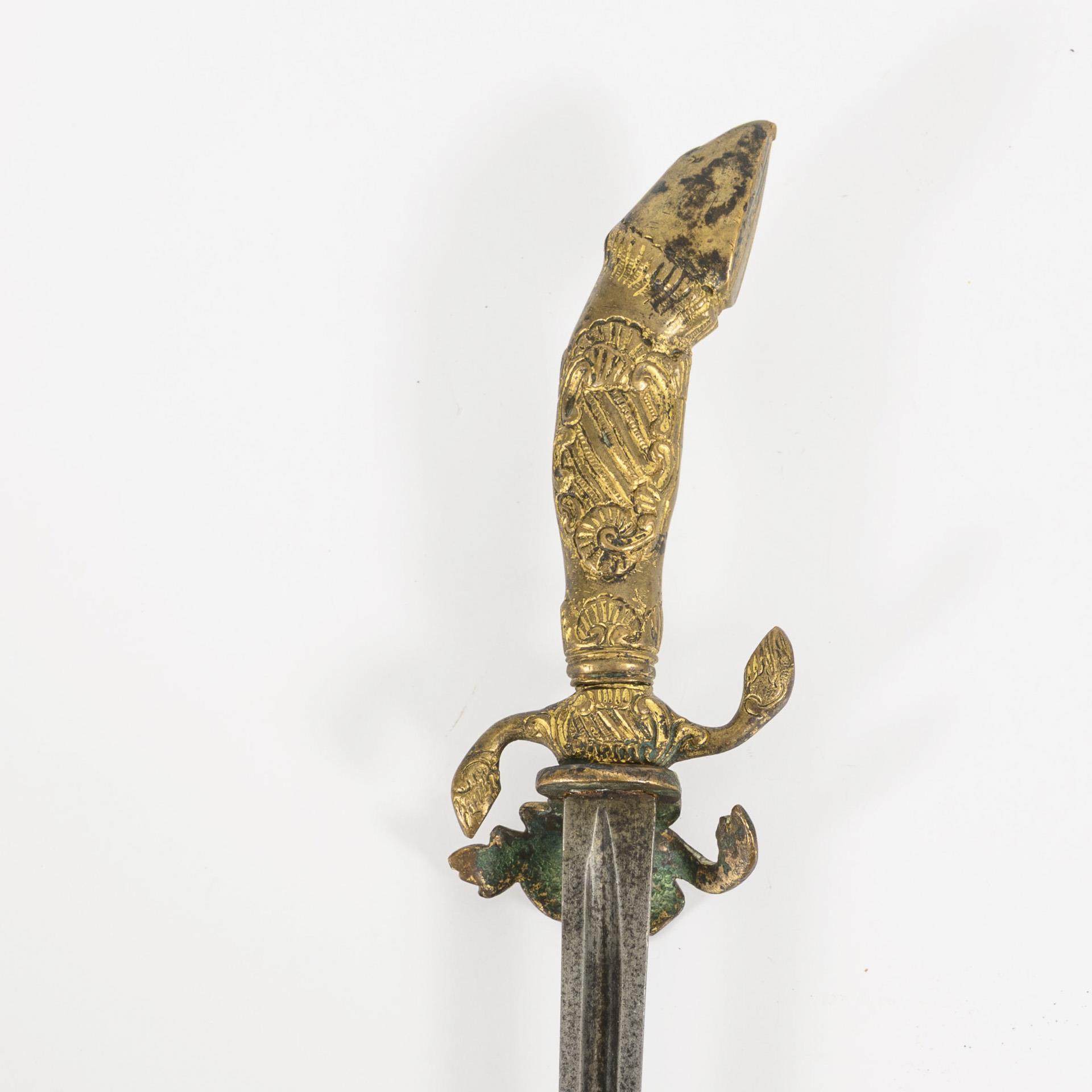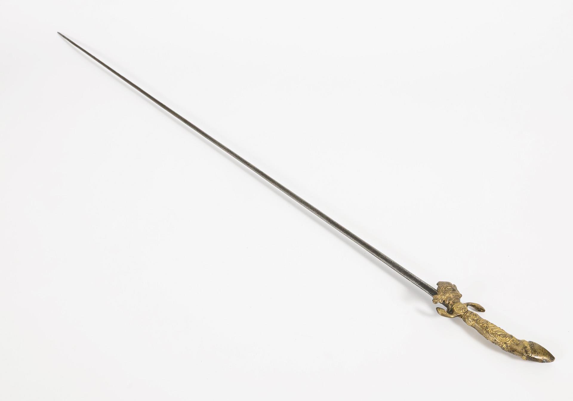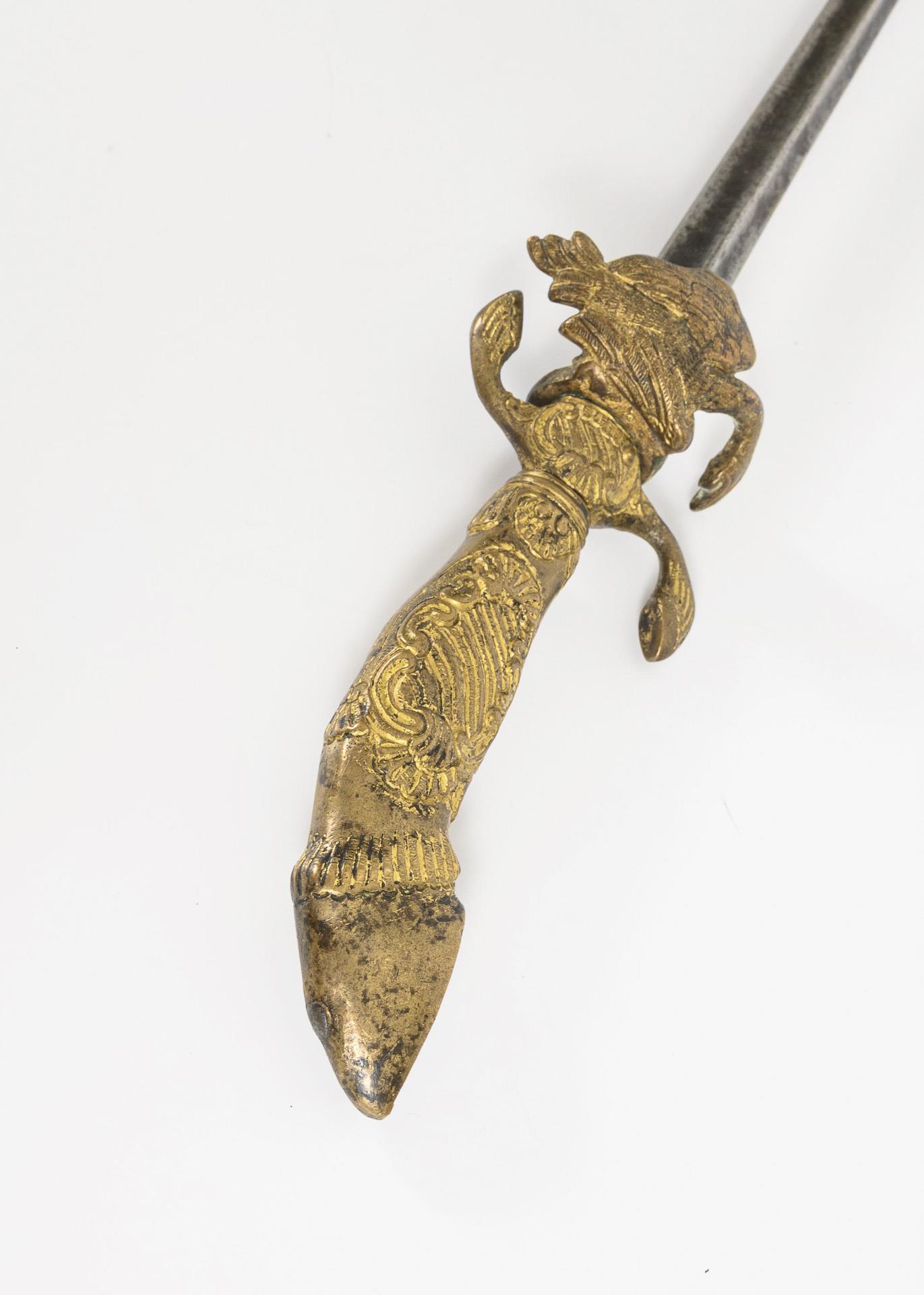 Jagdplaute bzw. Hirschfänger mit Griff in Form eines ornamental in barocker Form reliefierten Hirschbeines, geschwungene Parierstange in Form von Hufen, Stichblatt in Form eines Vogels oder Drachens. Ungeschliffene Dreikantklinge mit Winkelquerschnitt, einseitig mit tiefer Nut. Dadurch trotz der Länge stabile Klinge. Geringe Alters-/Gebrauchsspuren.