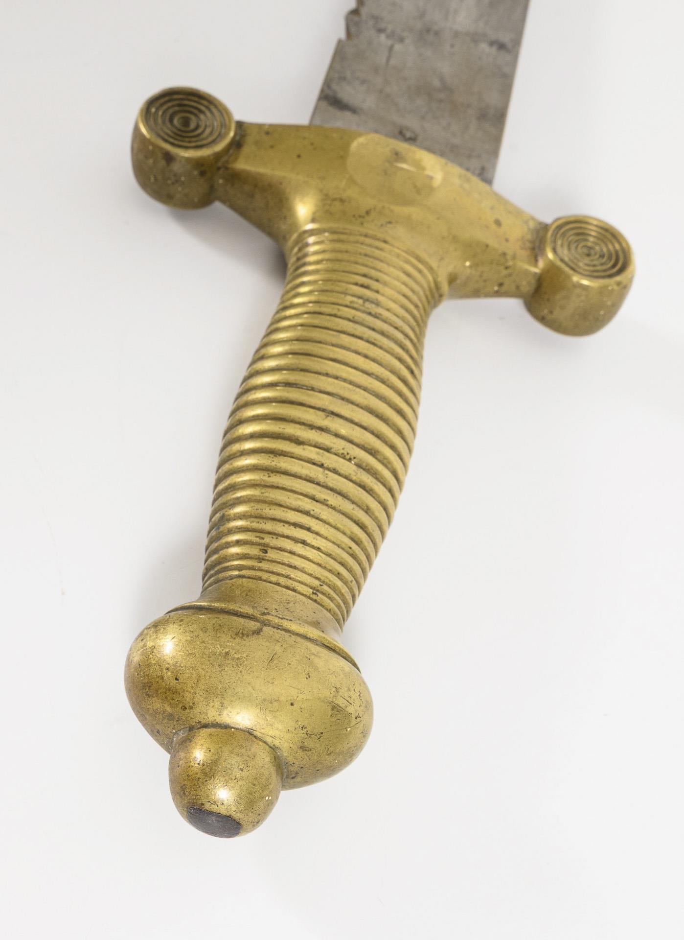 Massiver Messinggriff mit geriffelter Hilze und Rotellen an der geraden Parierstange, Klinge mit Sägerücken und Mittelort. Einige Alters-/Gebrauchsspuren.