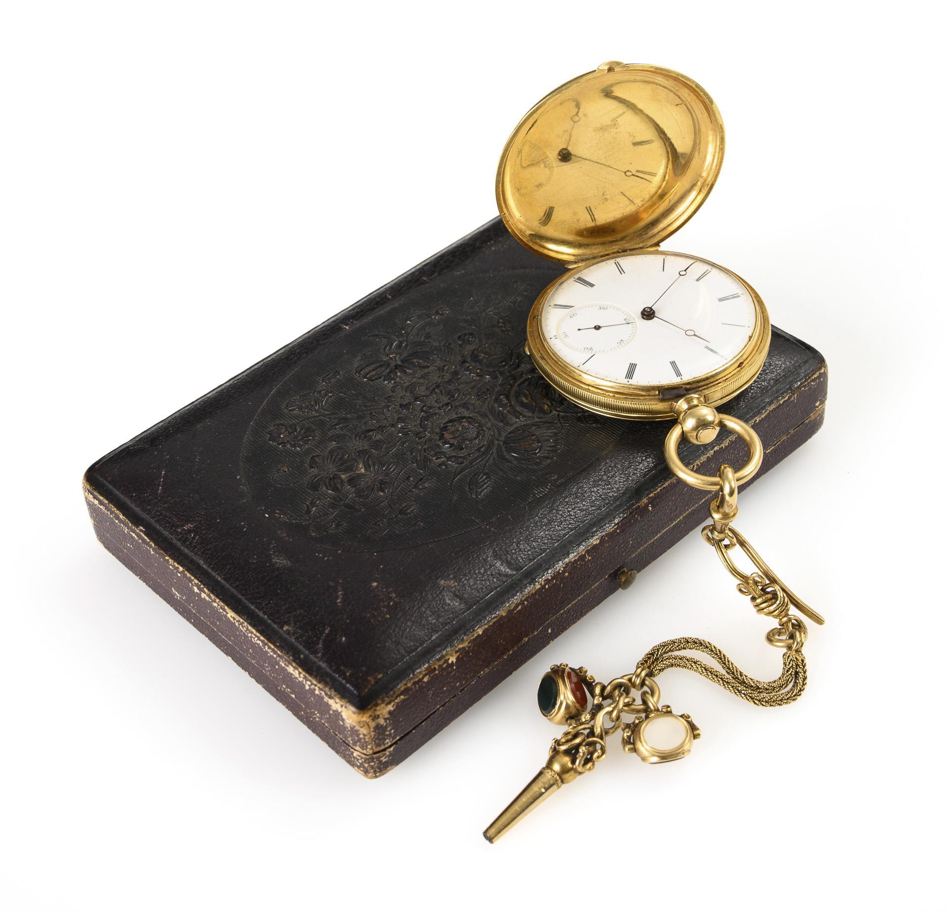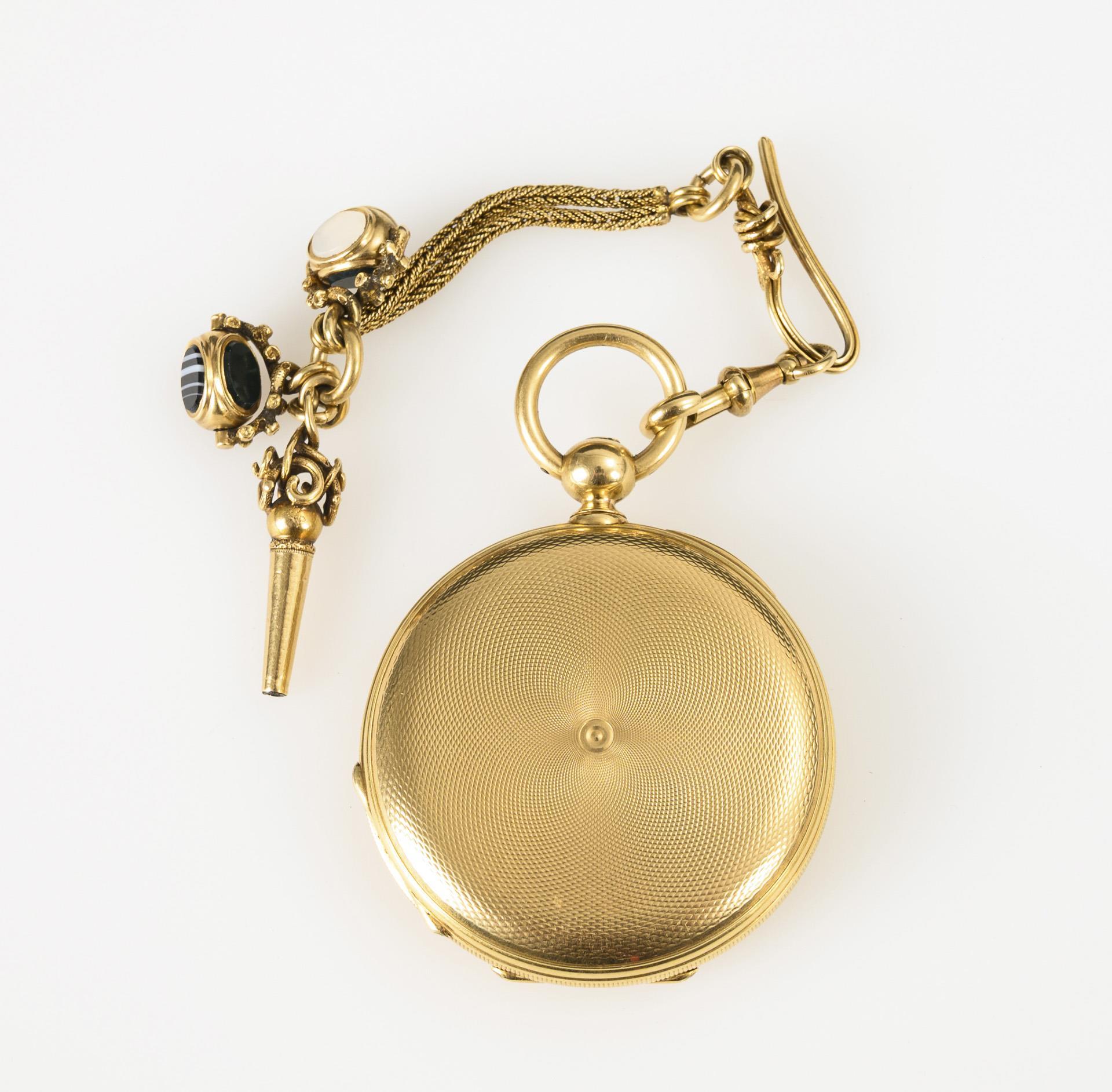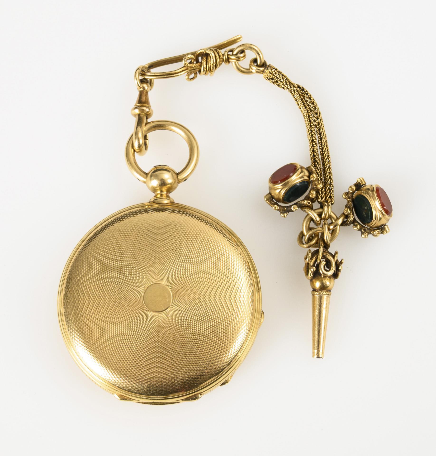 Sprungdeckeluhr mit guillochierten Deckeln und geriffeltem Rand. Goldener Uhrenanhänger in Art einer Châtelaine mit Rockhaken und Karabiner, kurzer Kette, Uhrenschlüssel und Zieranhänger mit verschiedenen Steinen (u.a. Karneol, Heliotrop). Minimale Alters- und Gebrauchsspuren, Kratzspuren.