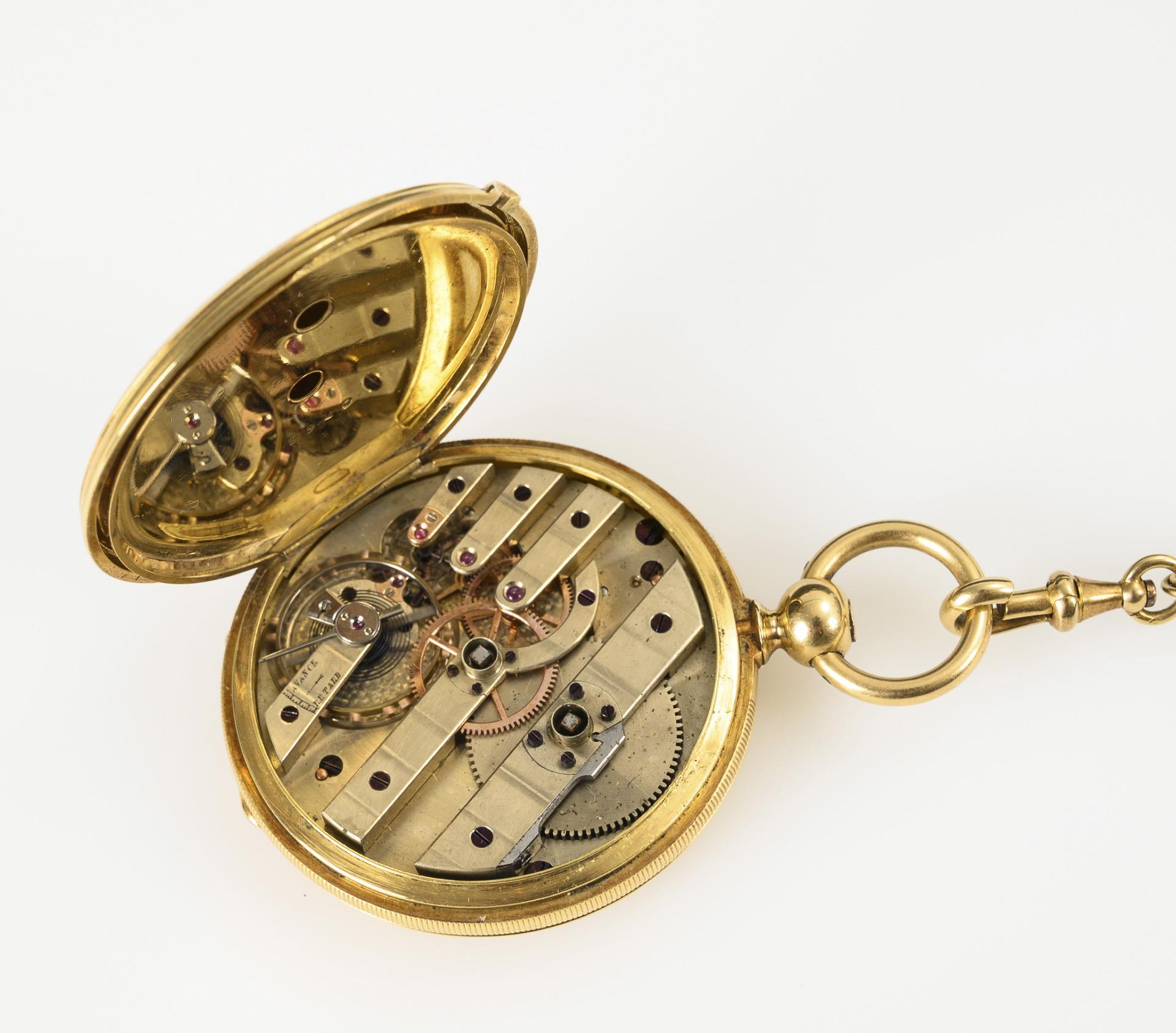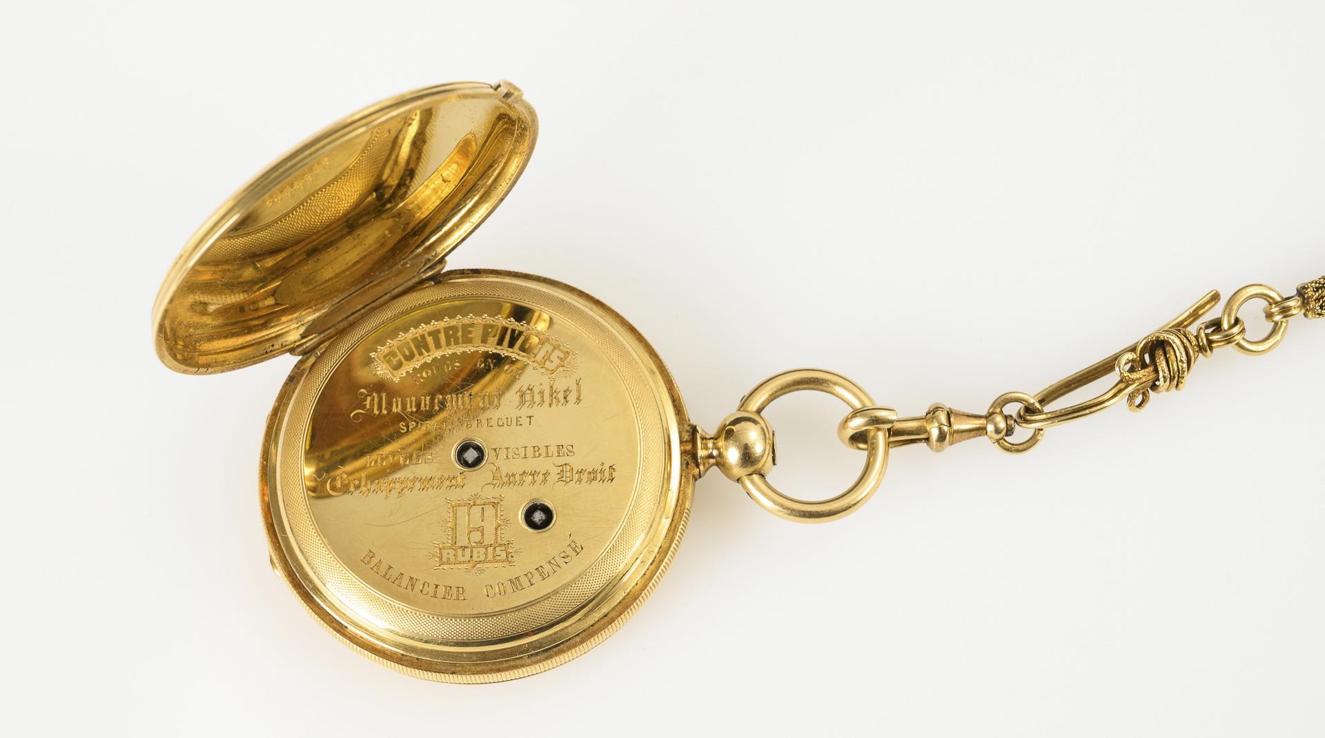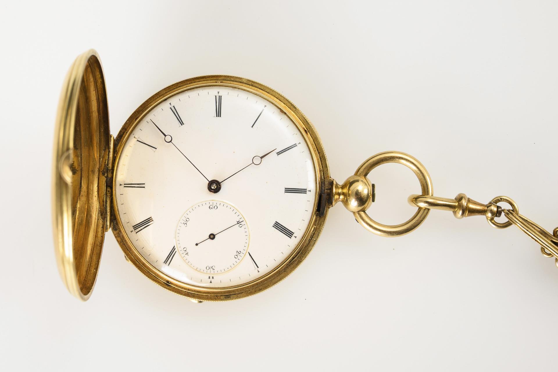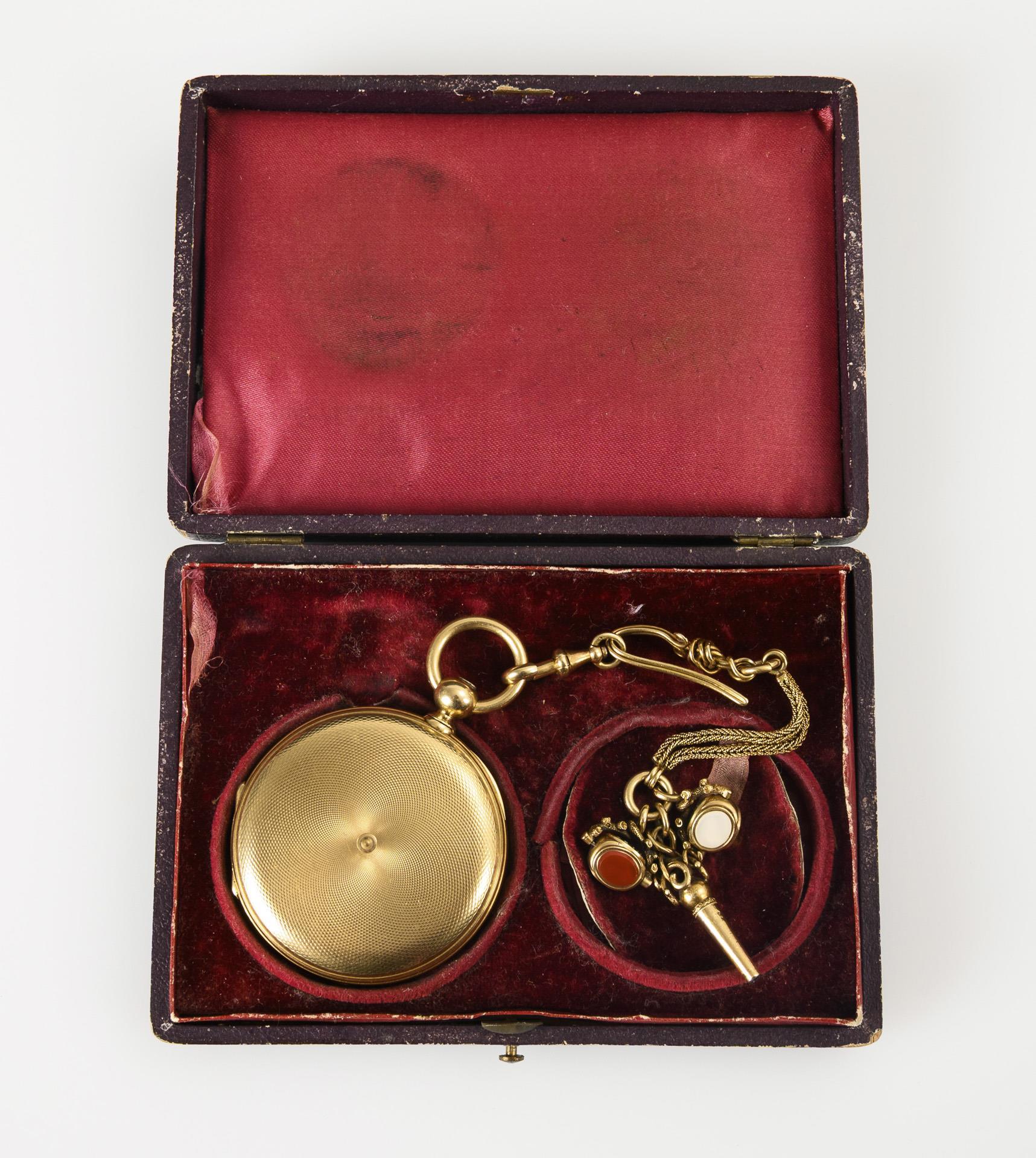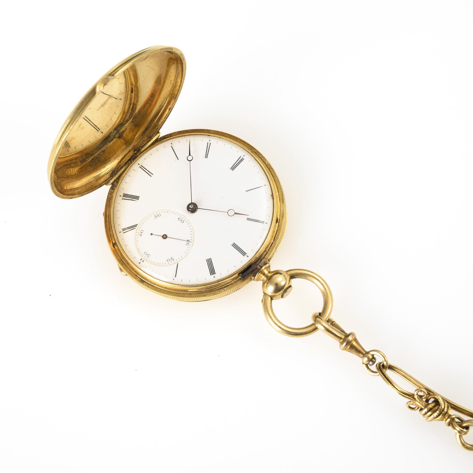 Ungepunzt, 750 Gold geprüft, bezeichneter Staubdeckel aus Gold. Ø 4,7 cm. Uhr 83 g, Châtelaine 17 g.