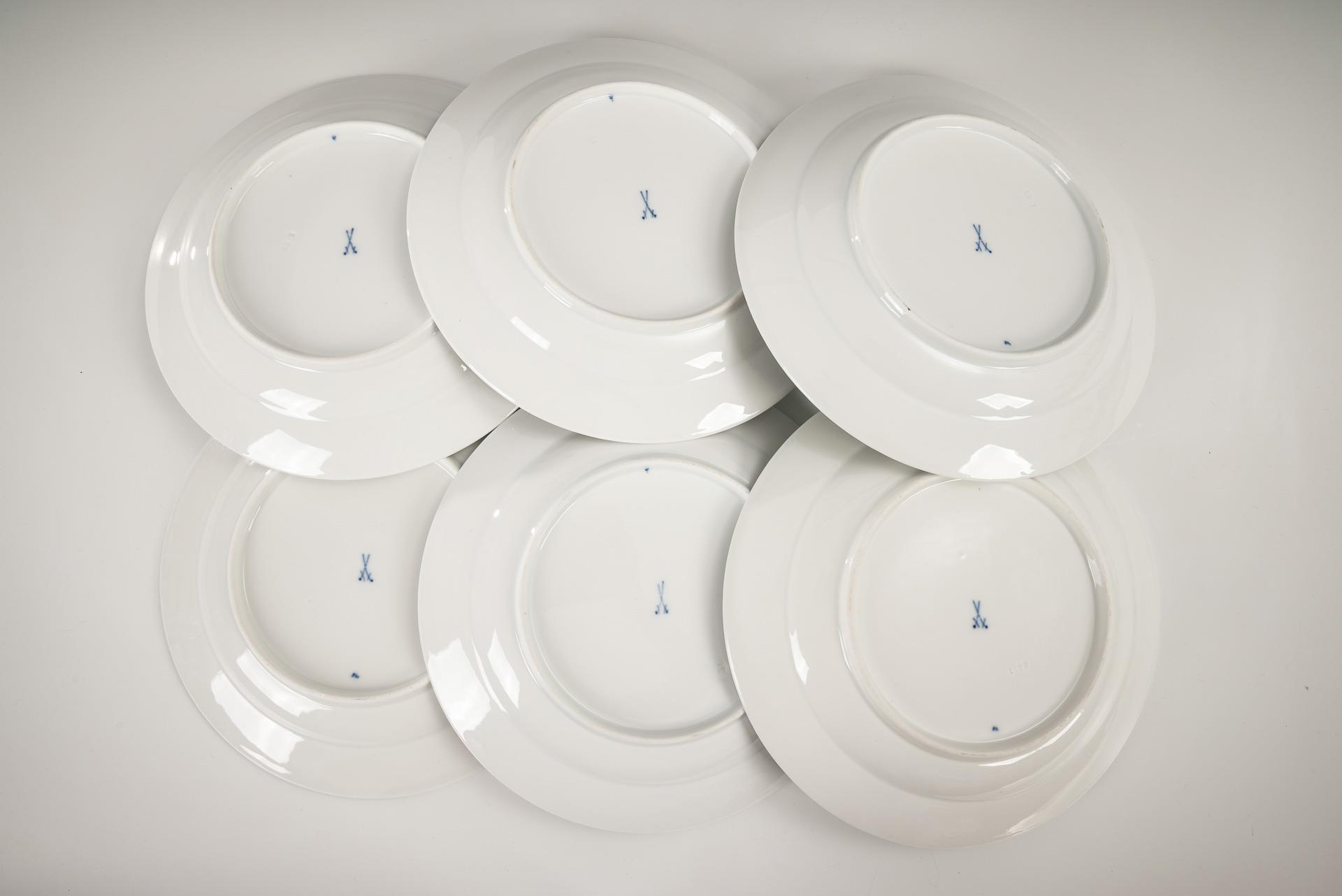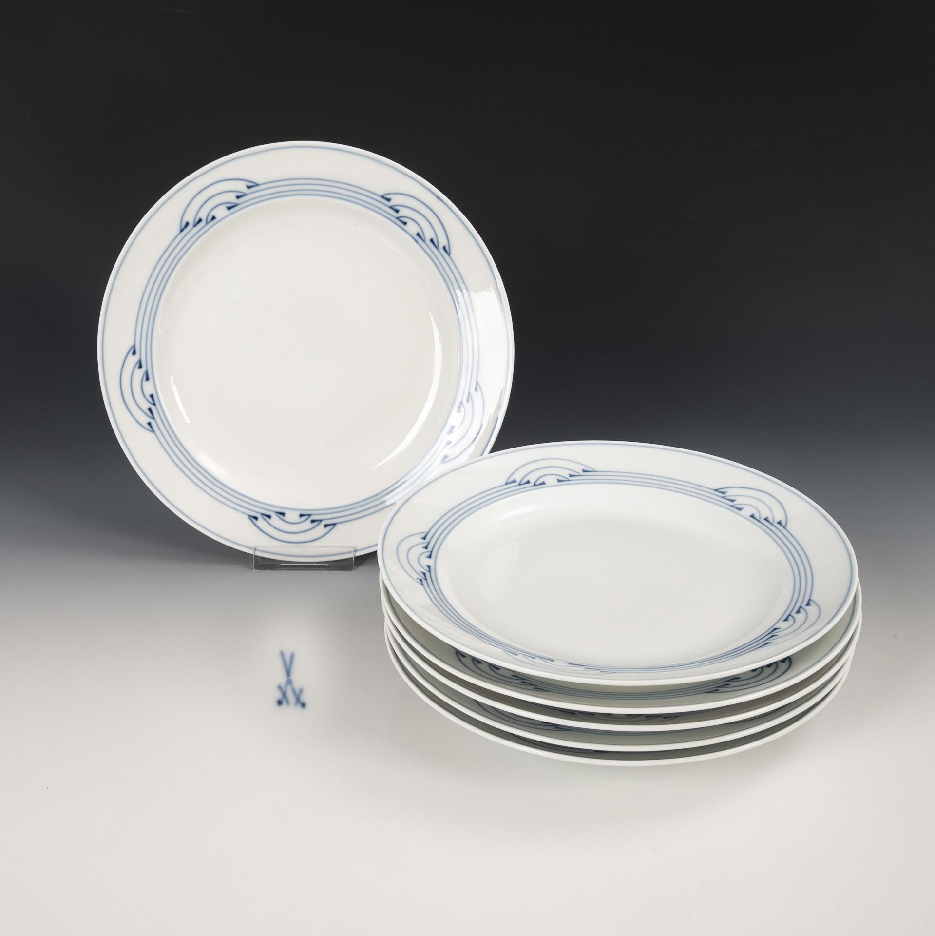 Aus dem sogenannten "Bügelservice". Glatte Teller mit unterglasurblauem, geometrischem Dekor.