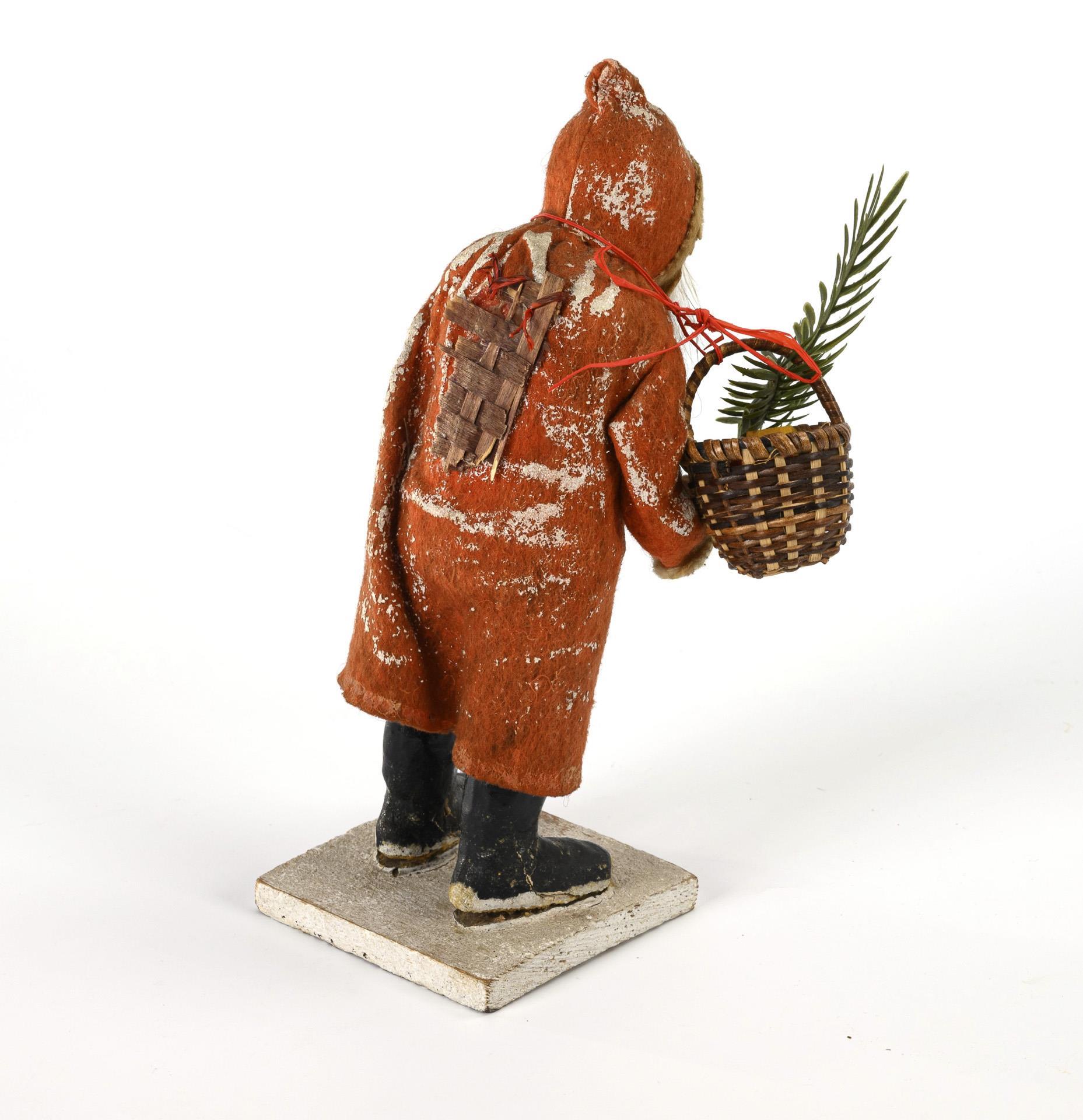 Massefigur mit rotem Filzmantel und weißem Bart aus Echtfell. Kiepe fehlend. Altersspuren, Körbchen und Tannenzweig ergänzt.