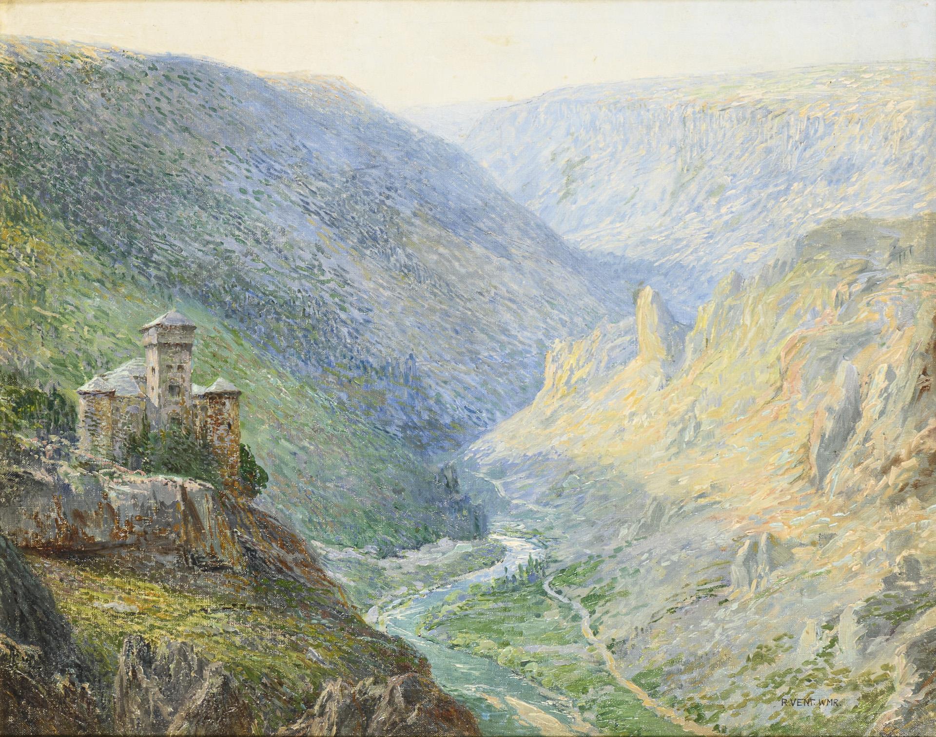 Tiefes Gebirgstal mit Flusslauf und Burg am steilen Hang am Morgen.