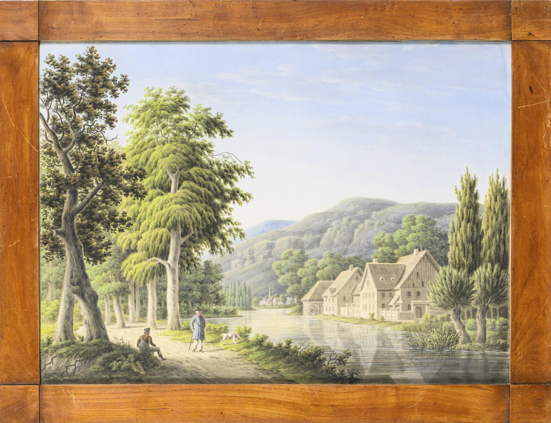 Flusslandschaft mit Wandersleuten