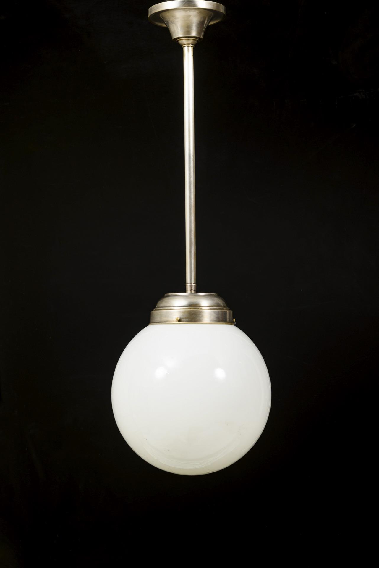 Messingblech vernickelt, farbloses Glas mit weißem Innenfang, Elektrifizierung mit Schraubfassung. H 89 cm, Ø 29 cm. 2,5 kg.