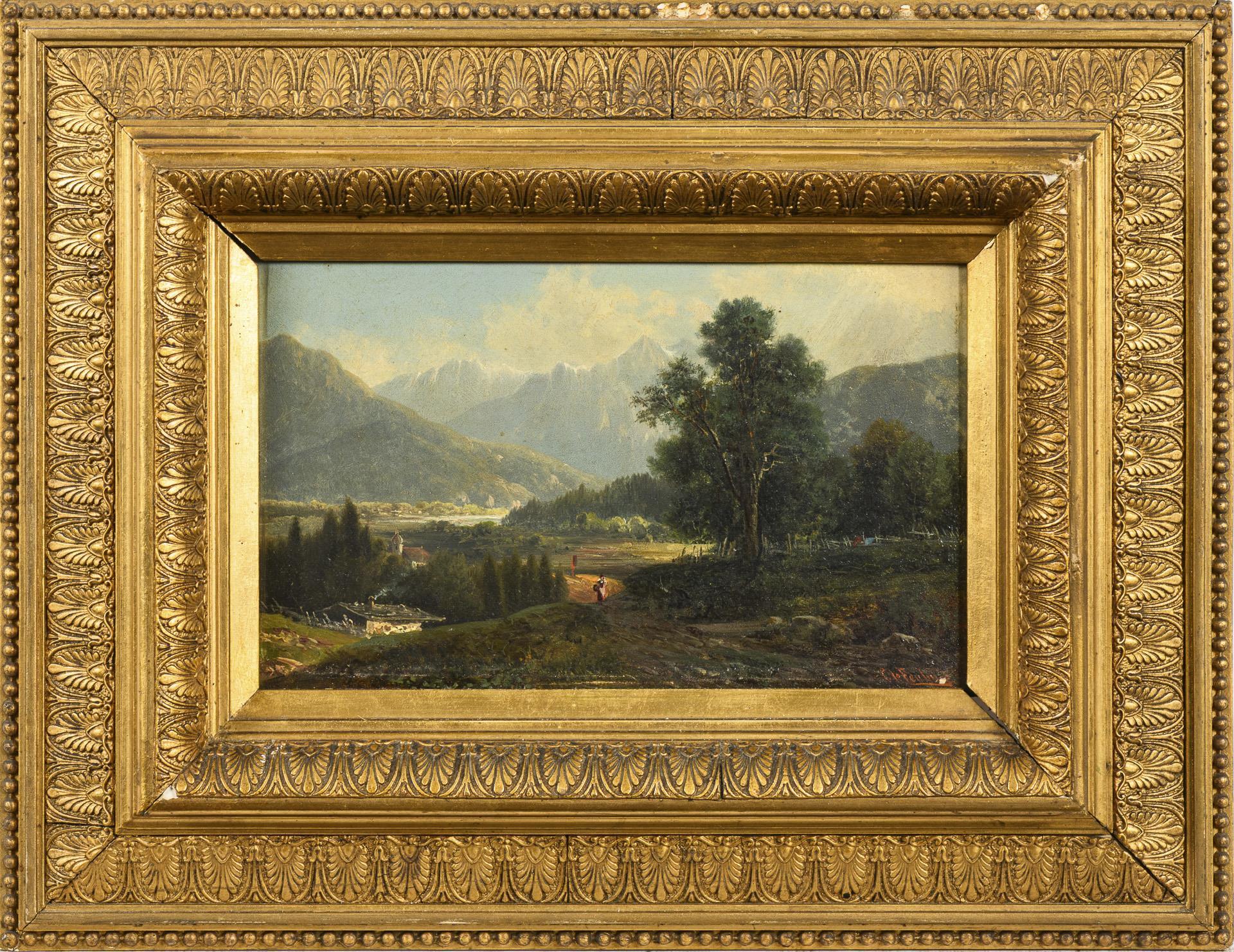 Weite Alpenlandschaft mit Staffagefigur nahe einer Kirche vor dem Gebirge.