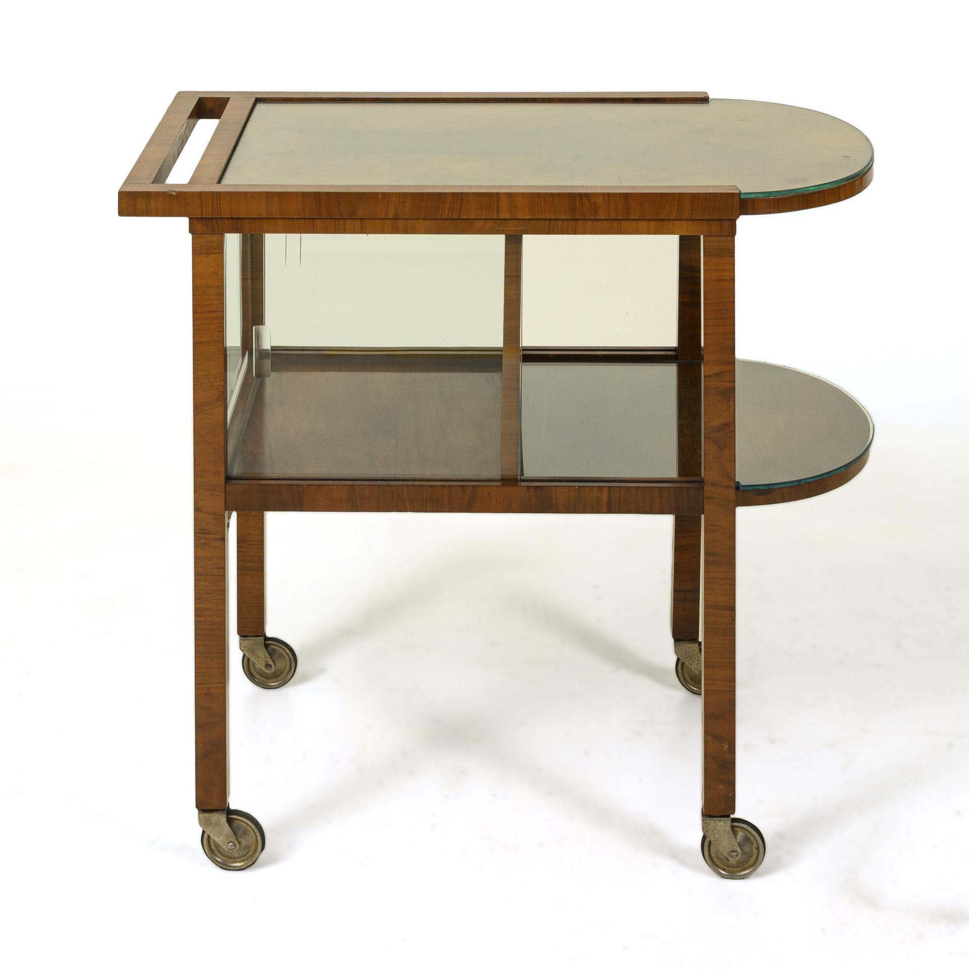 Rechteckiger Korpus mit gerundeter Schmalseite und abgesetzter Querstrebe als Griff, geteiltes mittleres Ablagefach mit offener Ablage und Vitrinenfach mit 2 seitlichen Glasschiebetüren, auf 4 geraden Beinen mit Rollfüßen. Dazu jeweils eine Glasauflage für die Deckplatte und das offene Mittelfach. Restauriert. Partiell kleine Furnierfehlstellen und Bereibungen, Glasauflagen leicht gechipped.