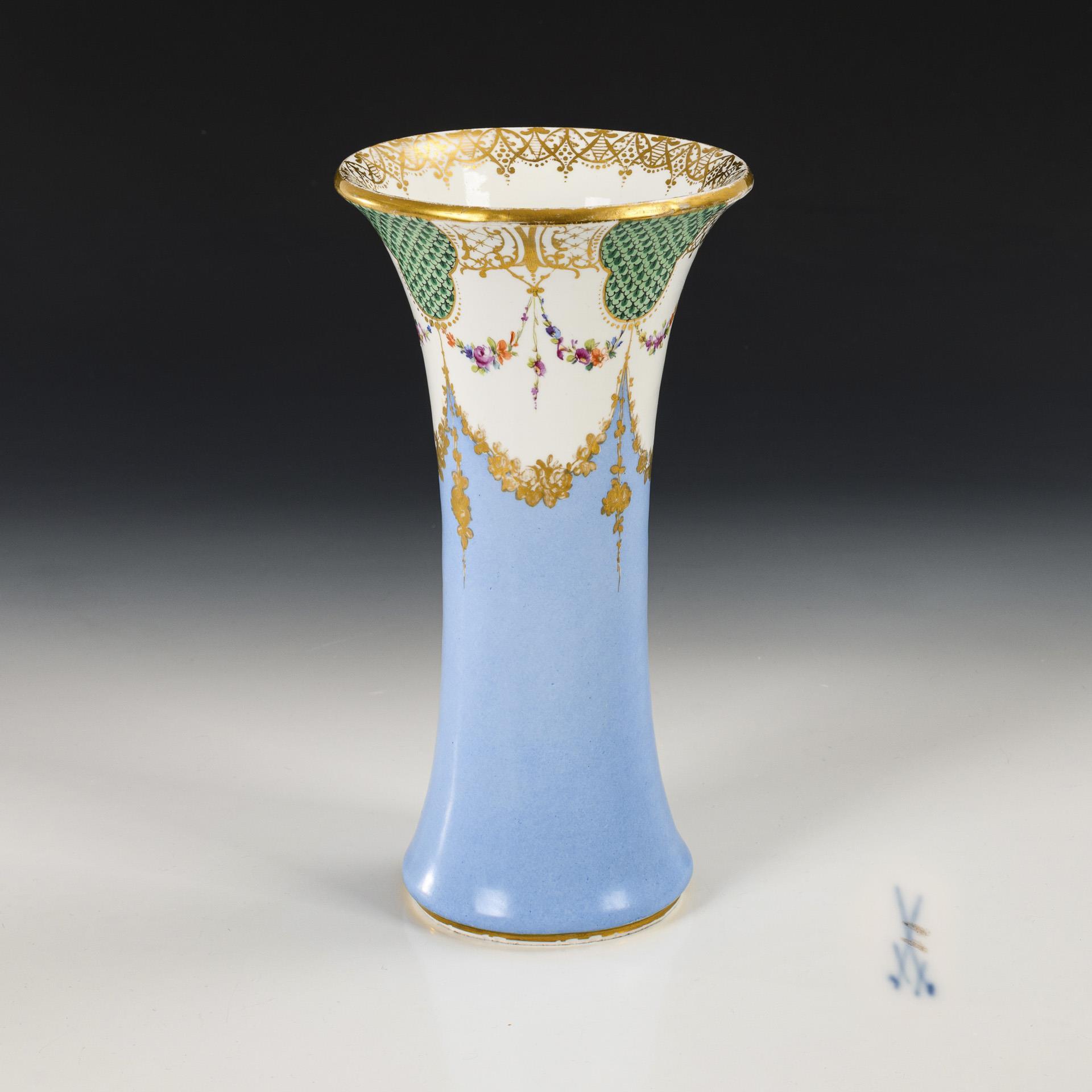 Flötenvase mit hellblauem Teilfond polychromen und goldradierten Blütenfestons sowie grünem Schuppenmuster in Kartuschen. Minimale Bestoßung am Stand.
