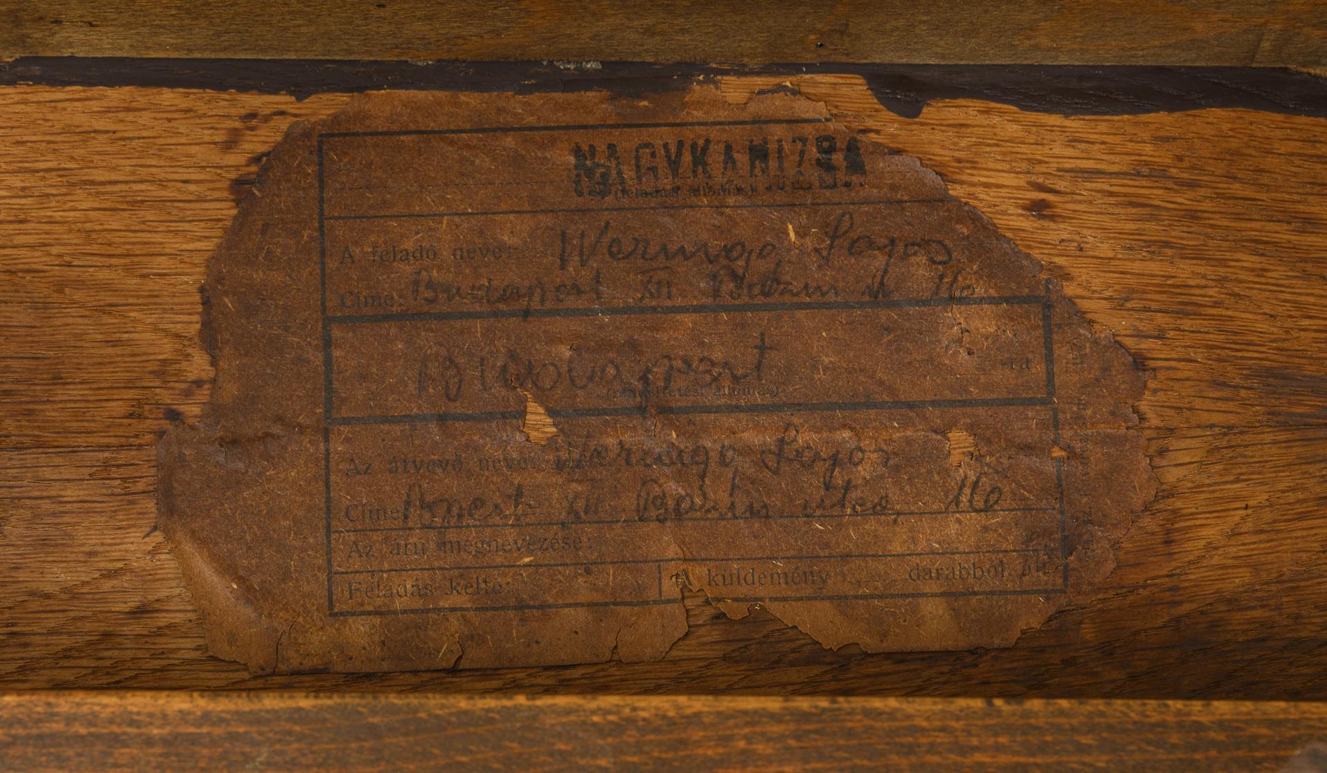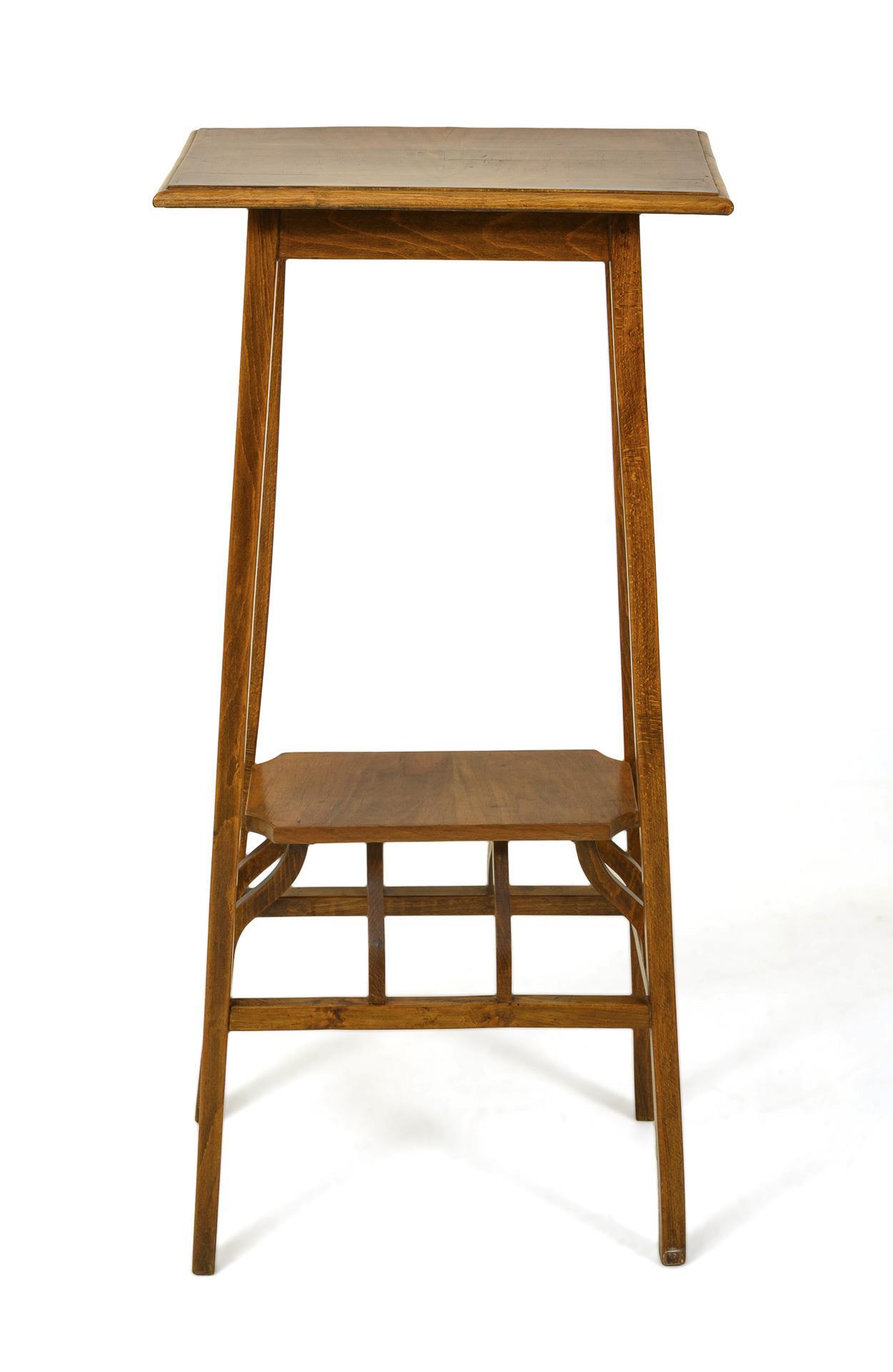 Rechteckige Deckplatte mit Profilkante, auf 4 hohen und leicht ausgestellten Vierkantbeinen mit Zwischenablage über einer Verstrebung mit geschwungenen Vertikalleisten. Deckplatte mit Wasserfleck, leicht rissig.
