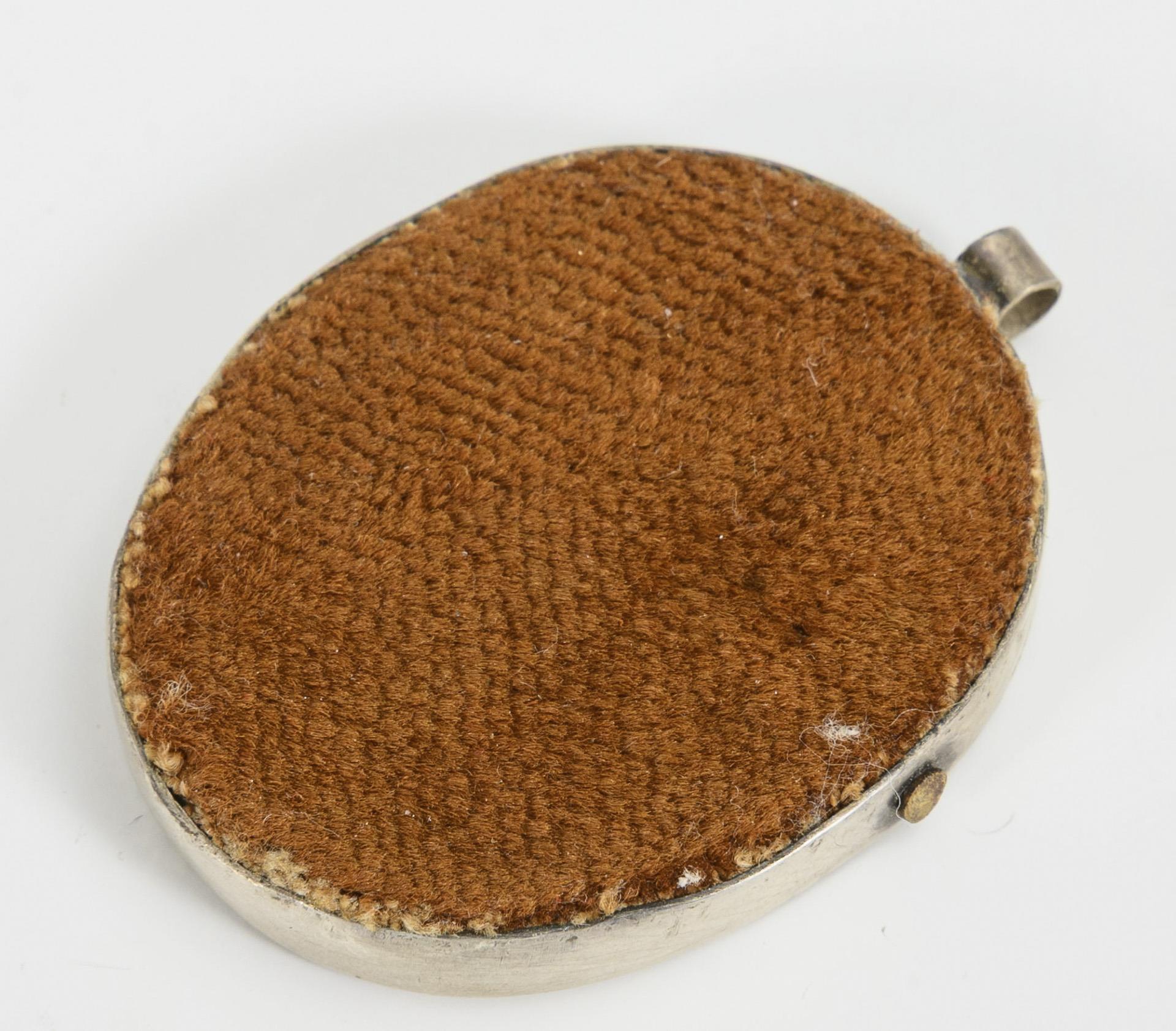 Ovale Halbfigur der Madonna mit dem bekleideten Jesuskind auf ihrem linken Arm. Metallrahmen mit Hängeöse. Alters-/Gebrauchsspuren am Rahmen und an der Malerei.