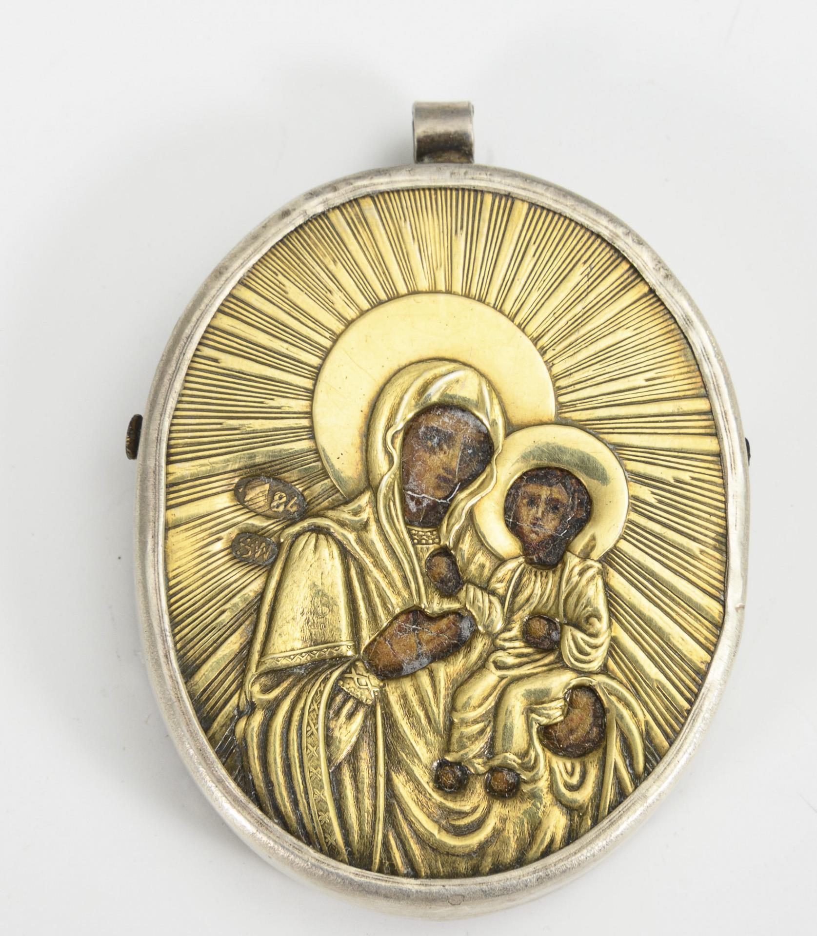 Ikone Silber vergoldet, Rahmen Metall versilbert, Tempera/Holz(?). 4 x 3,5 cm (ohne Öse). 10 g.