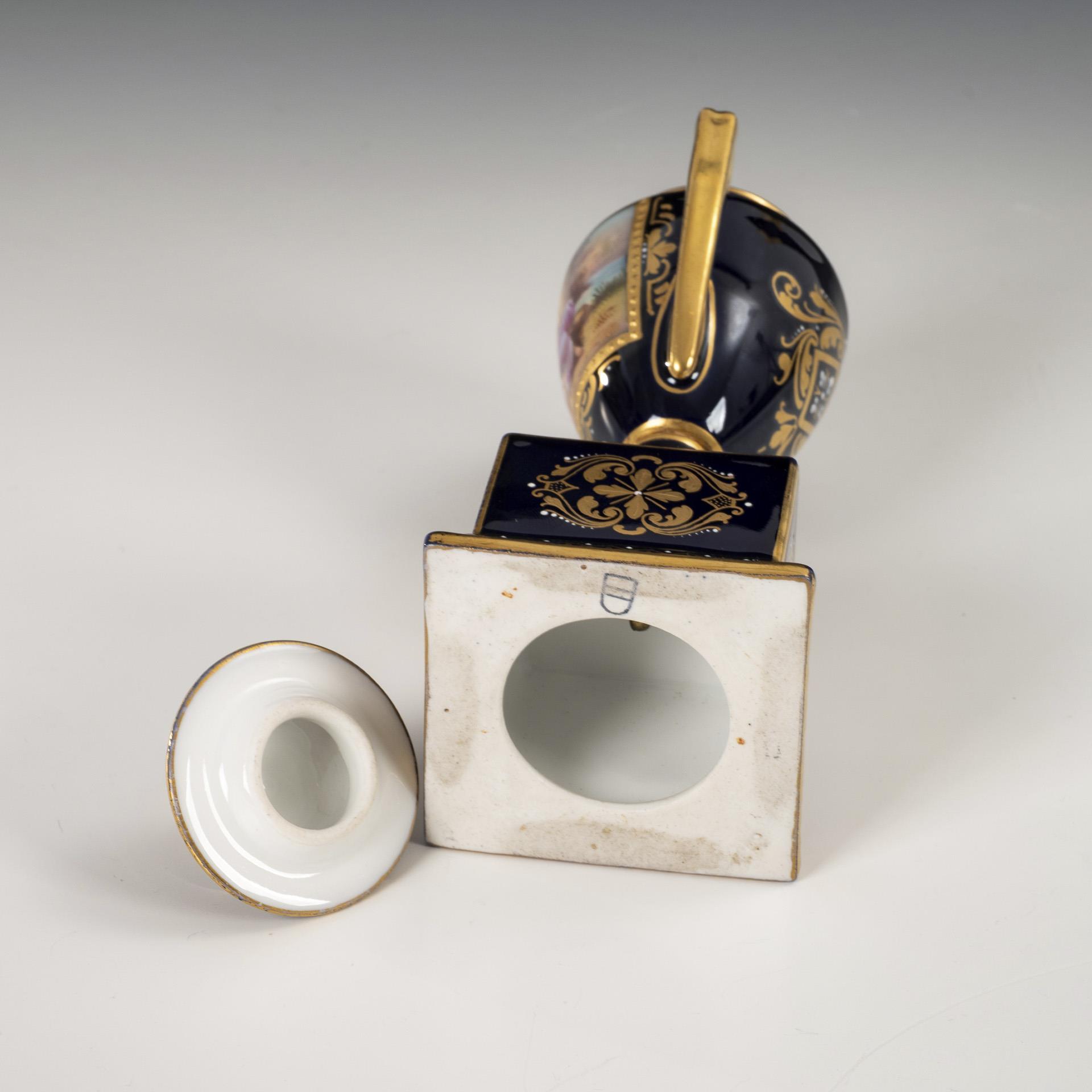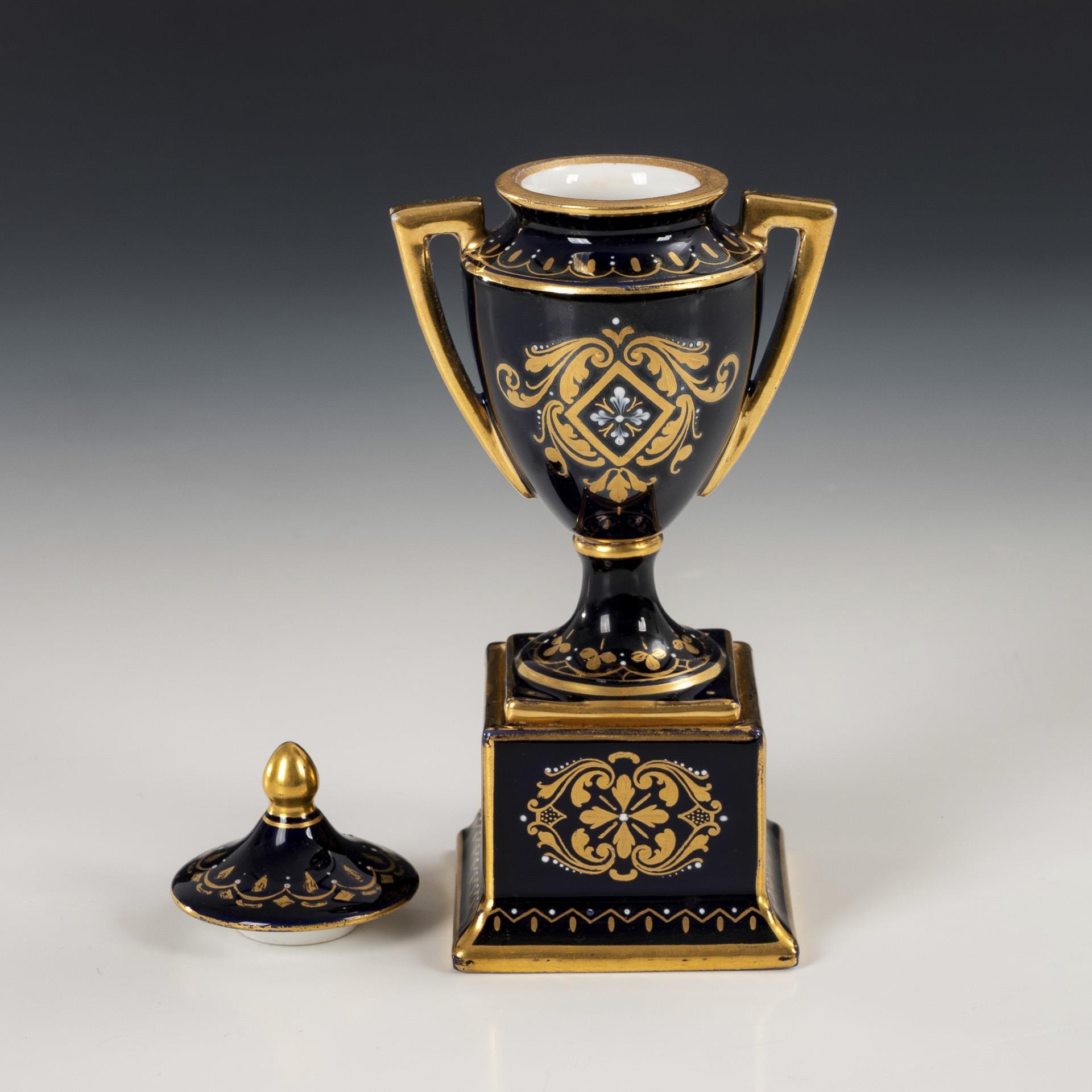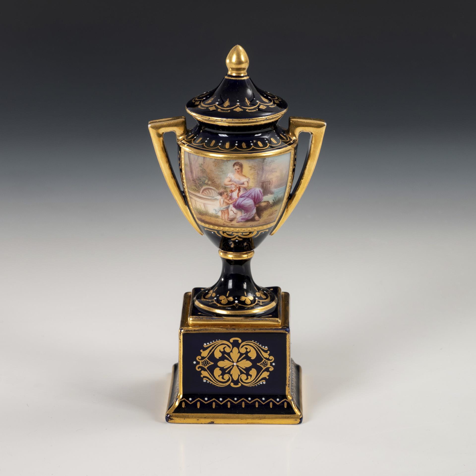Ovoider Korpus mit gewinkelten Henkeln, Knaufdeckel und Rundfuß, auf quadratischem Sockel. Kobaltfond mit vegetabiler Goldmalerei und Juwelenmalerei. Schauseitig eine goldgerahmte Rechteckkartusche mit der Darstellung einer Dame mit Amorknaben. Minimaler Goldabrieb.