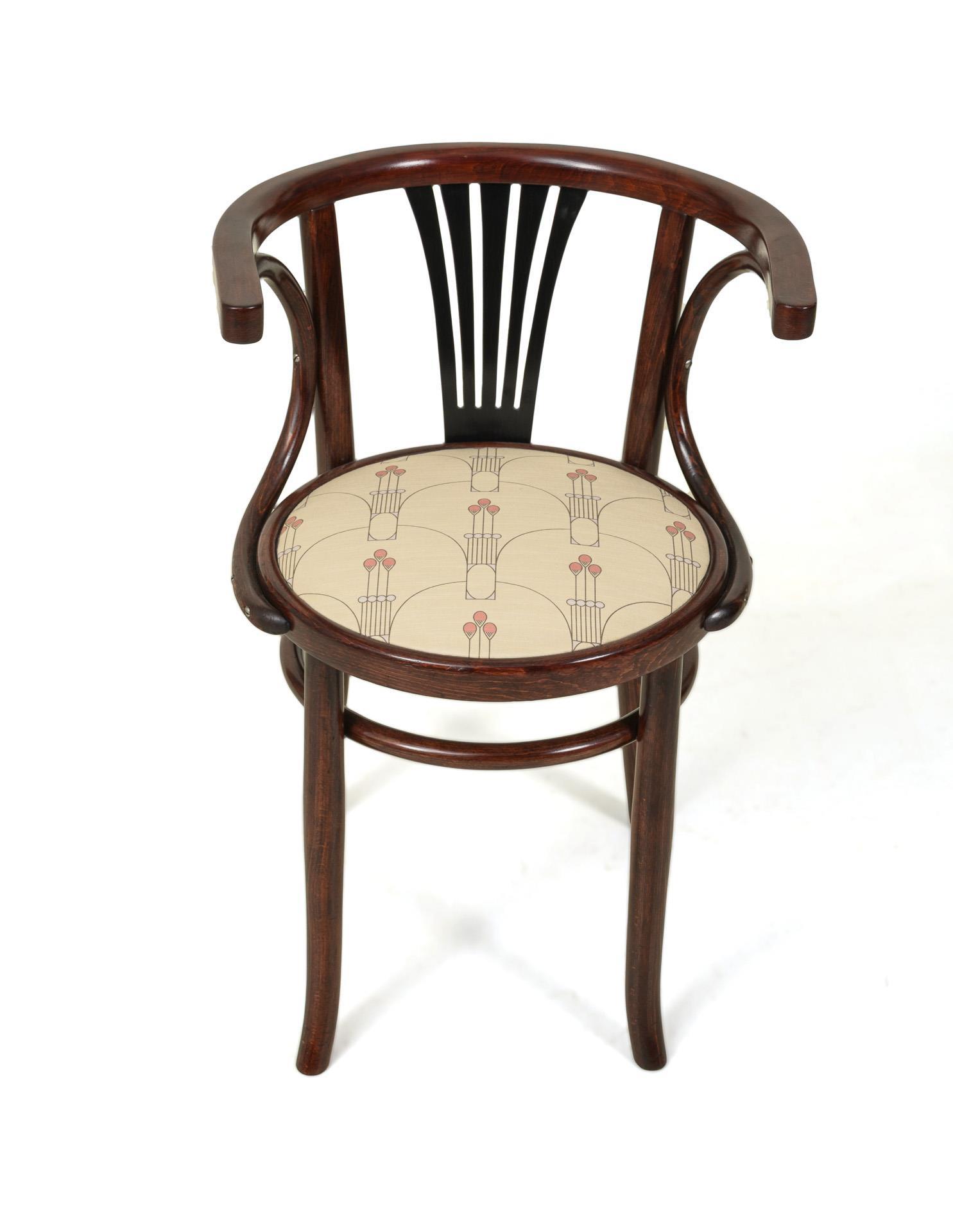 Gerundeter Jugendstil-Armlehnstuhl mit gefächert versprosster Rückenlehne und geschwungenen Seitenstützen, Polstersitzfläche mit hellem, stilisiert floral gemustertem Stoff nach einem Entwurf der Wiener Werkstätten, auf 4 konkaven Beinen mit Ringverstrebung. Restauriert, mit Ergänzungen.