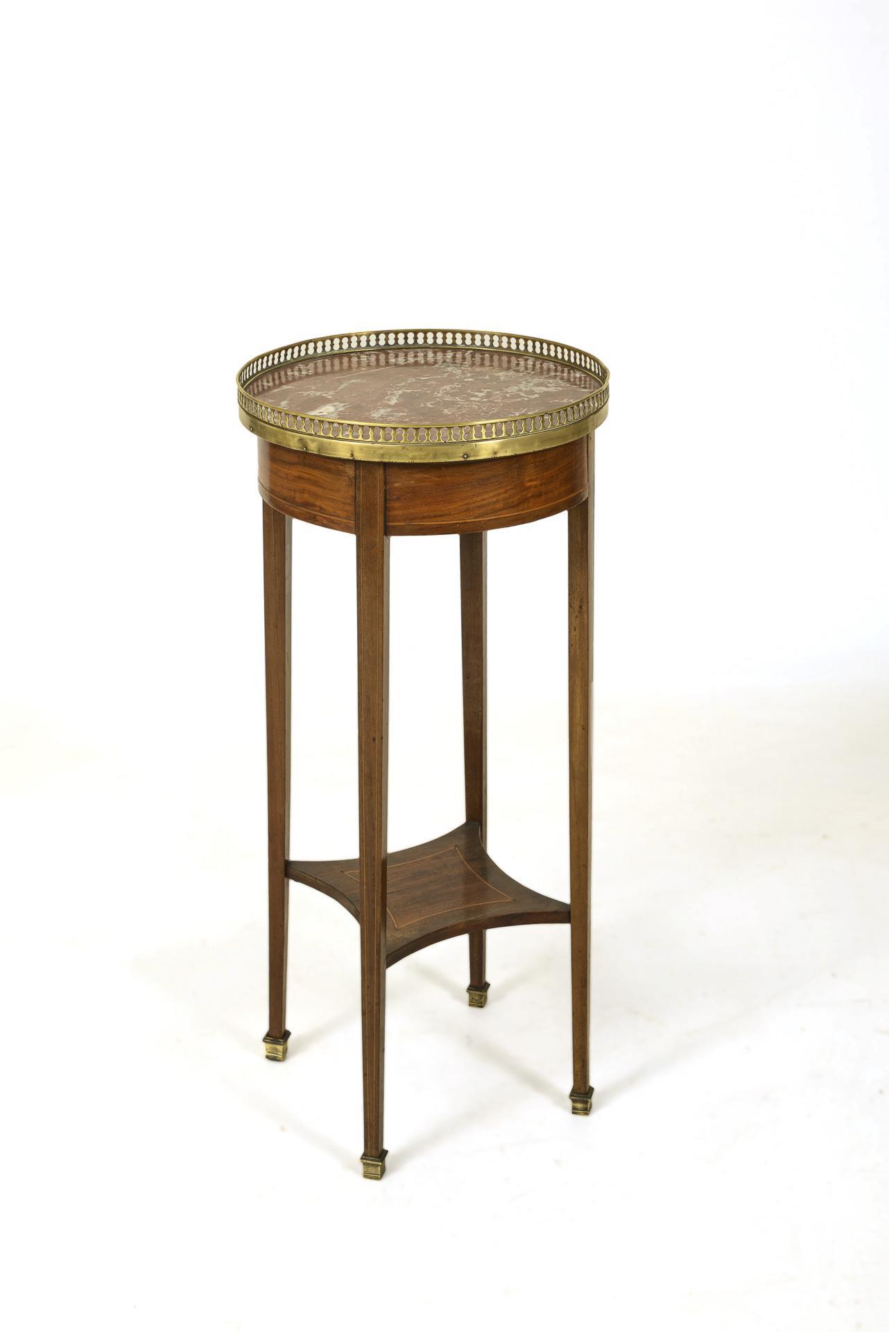 Mahagoni, furniert und gebeizt, helle Fadeneinlagen, rötlicher Marmor mit grauer Äderung, Messing. H 76 cm, Ø 35,5 cm.