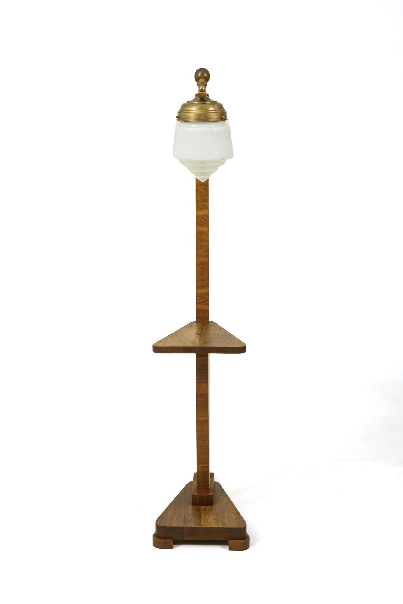 Nussbaum furniert, farbloses Glas mit weißem Innenfang, Elektrifizierung mit Kabelschalter und Schraubfassung. H 131 - 167 cm, Ø Schirm 15 cm. 4,9 kg.