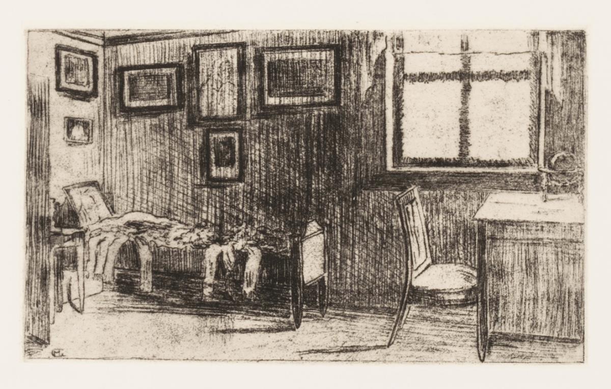 Interieur mit Bett, Tisch und Stuhl. Blatt 5 der Jahresmappe 1905 des Weimarer Radiervereins. Etwas stockfleckig.