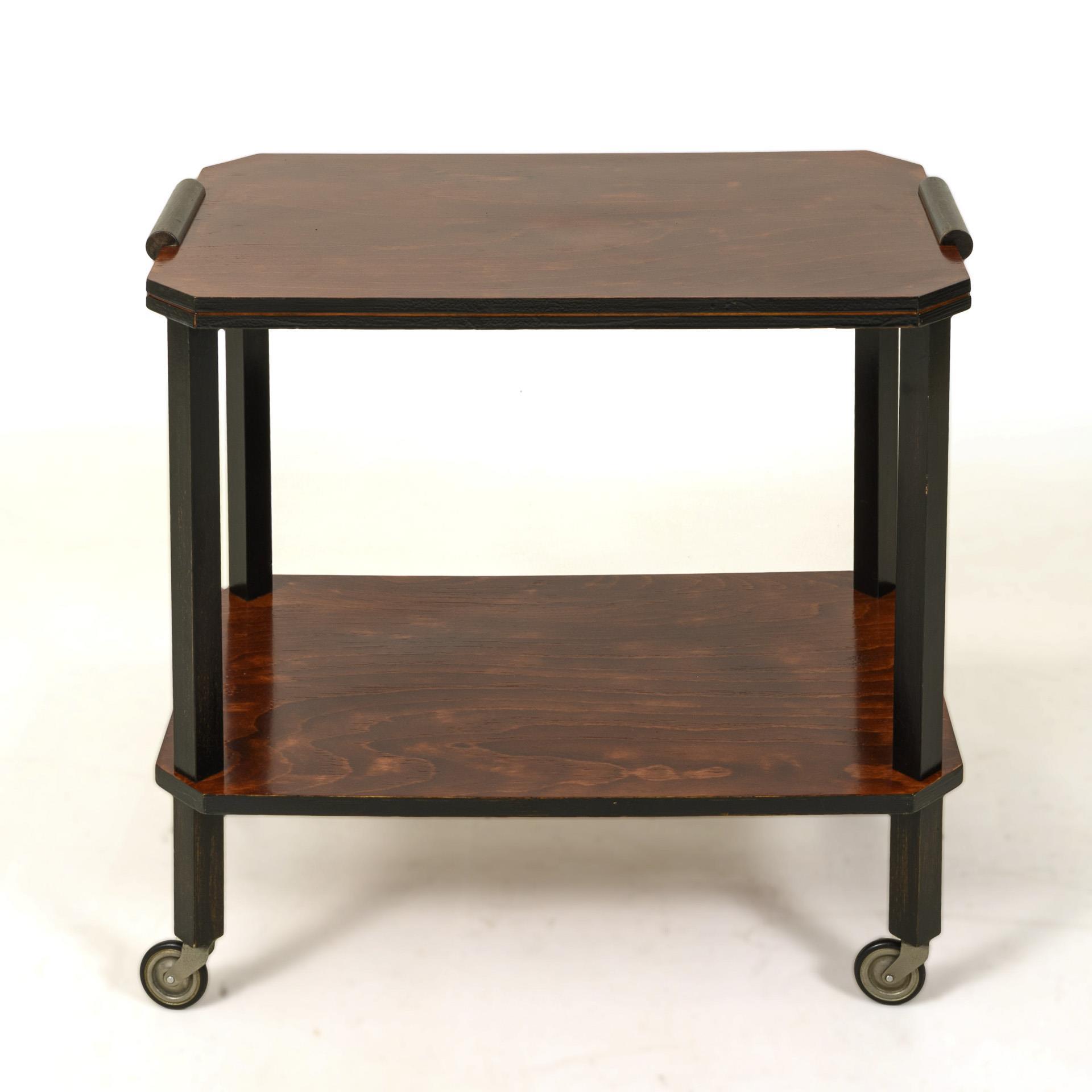 2-etagiger Rollwagen mit geschrägten Ecken im Stil des Art Déco. Obere Ablagefläche mit gerundeten Handhaben und Profilkante, auf 4 Vierkantstreben mit Rollfüßen.