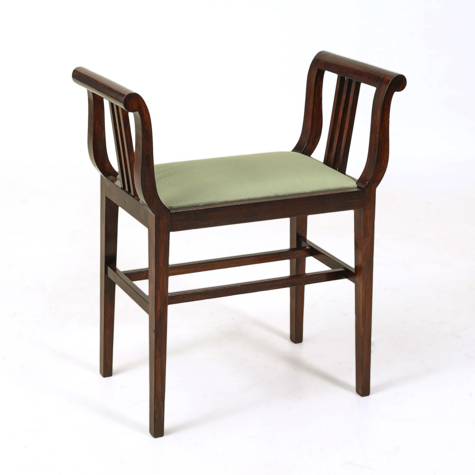 Im Stil des Biedermeier gefertigte Polsterbank mit hellgrünem Stoffbezug, seitlichen Lyrastützen mit 3 Vertikalstreben, auf 4 verstrebten, konischen Beinen. Restauriert, mit Ergänzungen.