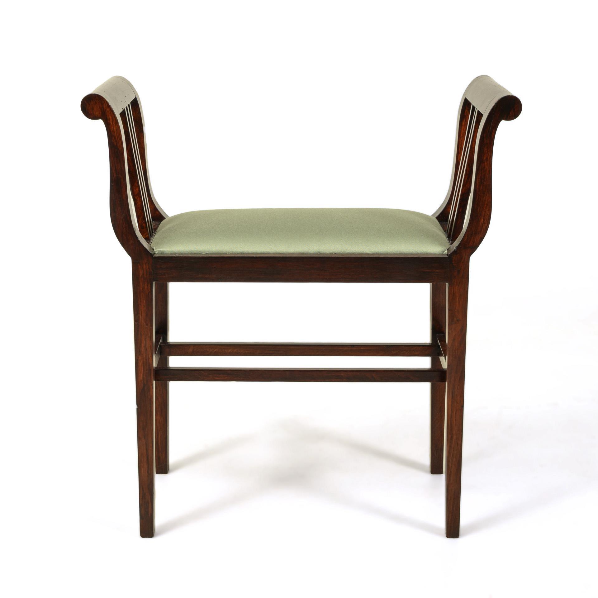 Im Stil des Biedermeier gefertigte Polsterbank mit hellgrünem Stoffbezug, seitlichen Lyrastützen mit 3 Vertikalstreben, auf 4 verstrebten, konischen Beinen. Restauriert, mit Ergänzungen.