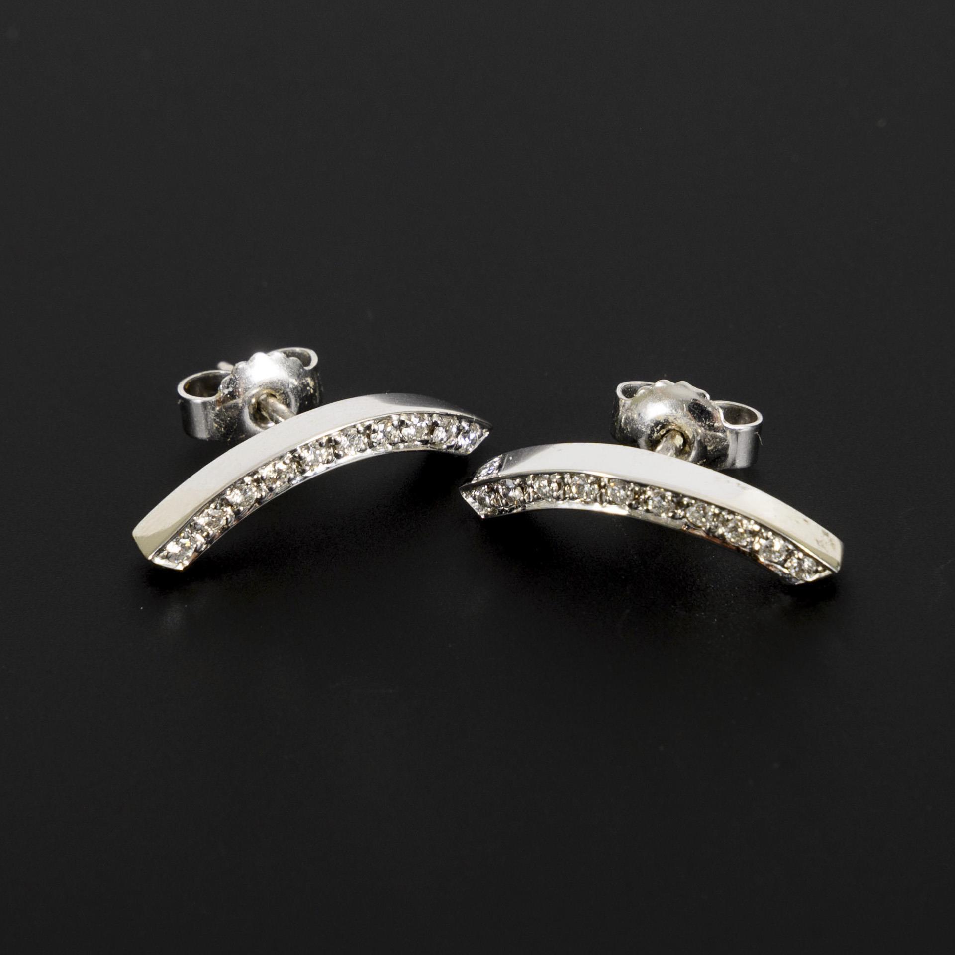 Sichelförmiges Ohrsteckerpaar mit einem Besatz aus je 10 kleinen Brillanten. Passend zu Kat.-Nr. 386.