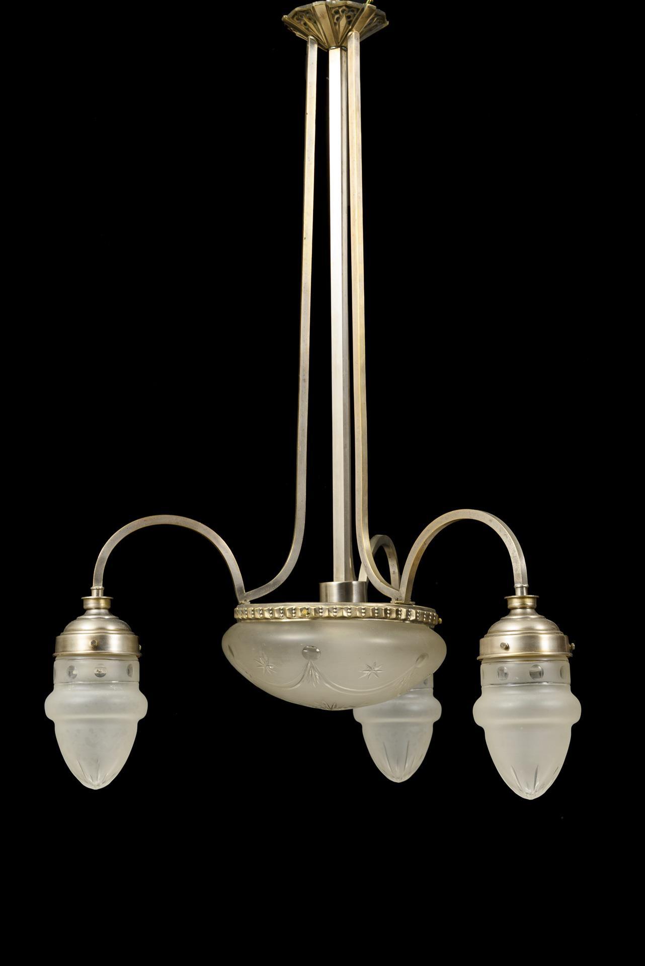 Zentrale Glasschale mit Stern-, Girlanden- und Linsenschliff, Haltering mit Relieffries, 3 Bogenarme mit zapfenförmigen Schirmen. Zentraler Vierkantschaft mit 3 Begleitstreben zum reliefverzierten Baldachin. Funktion nicht geprüft.