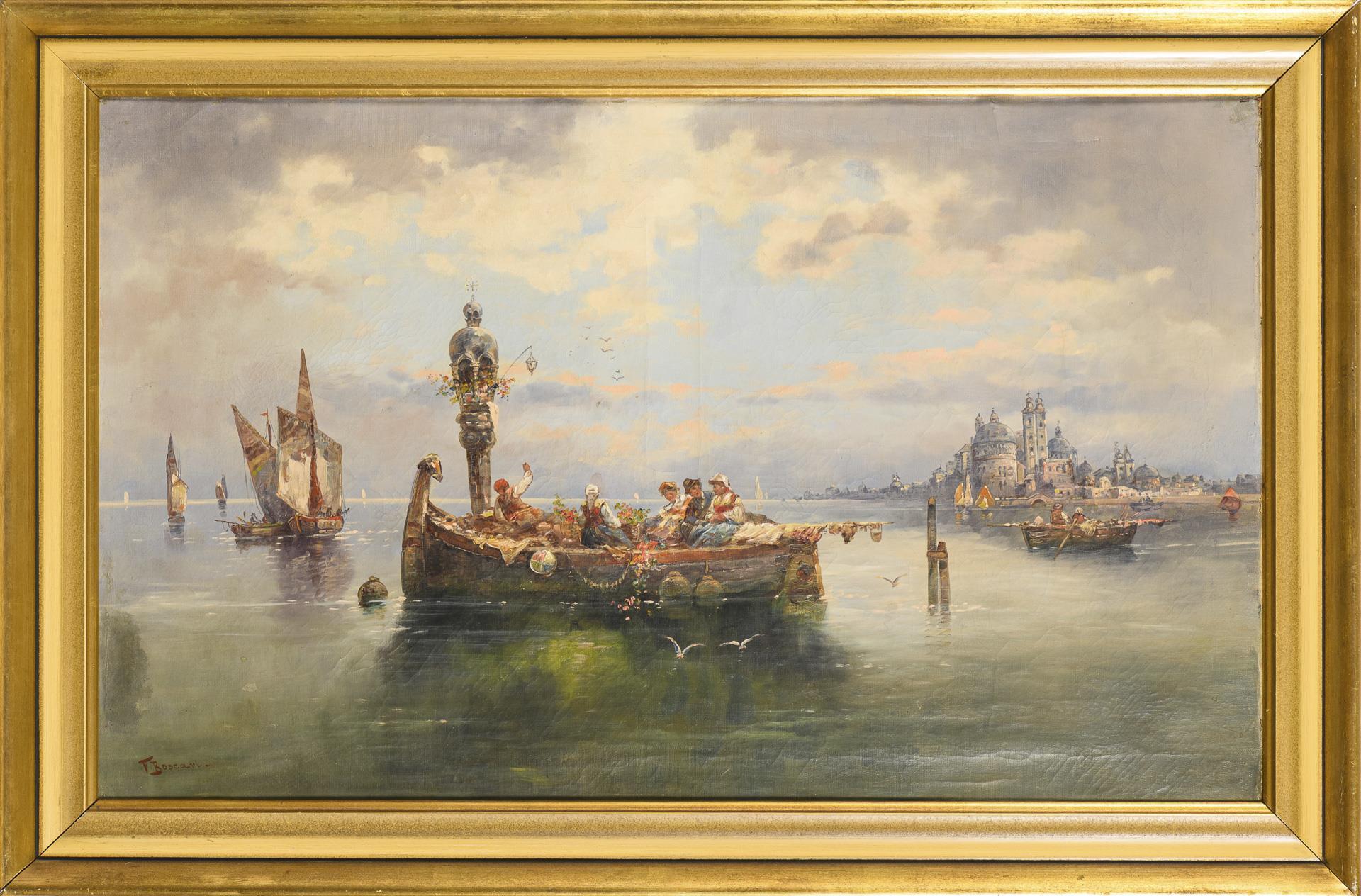 Viele Boote mit Personen auf dem ruhigen Wasser nahe der italienischen Stadt. Sehr kleine restaurierte Stellen mit Hinterklebungen.