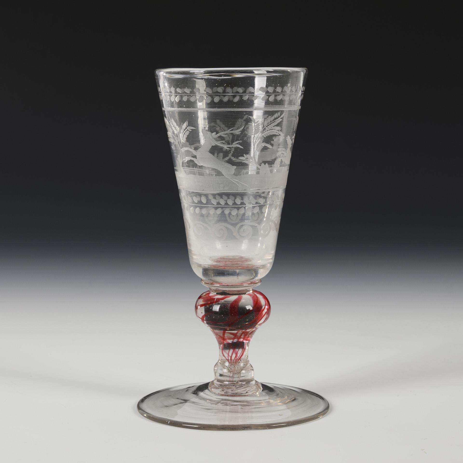 Konischer Kelch, Balusterschaft mit eingeschmolzenen, gedrehten Rubinglasfäden, Scheibenfuß; Abriss. Auf der Kuppa zwischen Blattranken gravierte Hunde und Hirsche.