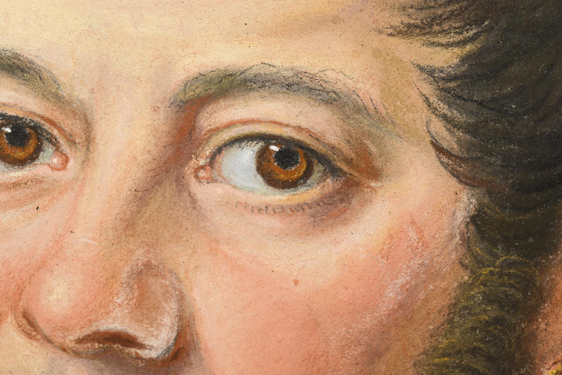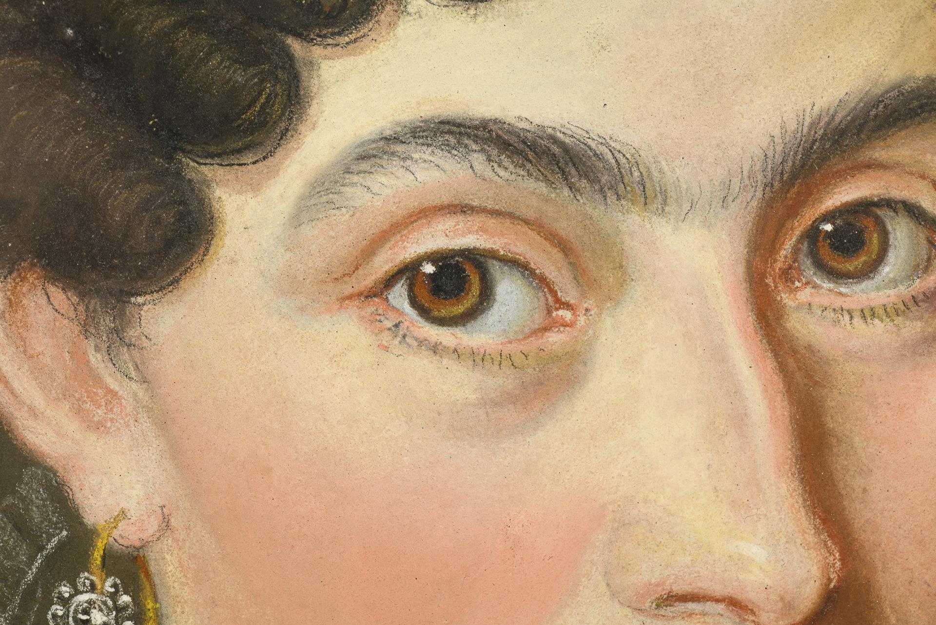 Porträt eines Mannes mit Backenbart und schwarzem Anzug in oval gemaltem Bildausschnitt sowie Bildnis einer Frau in rotem Kleid mit Goldschmuck und dunklem Haar in oval gemaltem Bildausschnitt. Je Altersspuren.