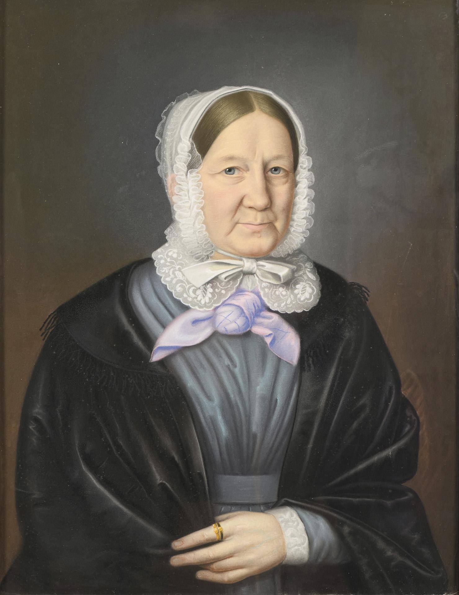 Porträt der Frau im grauen Kleid mit schwarzem Mantel und weißer Spitzenhaube.