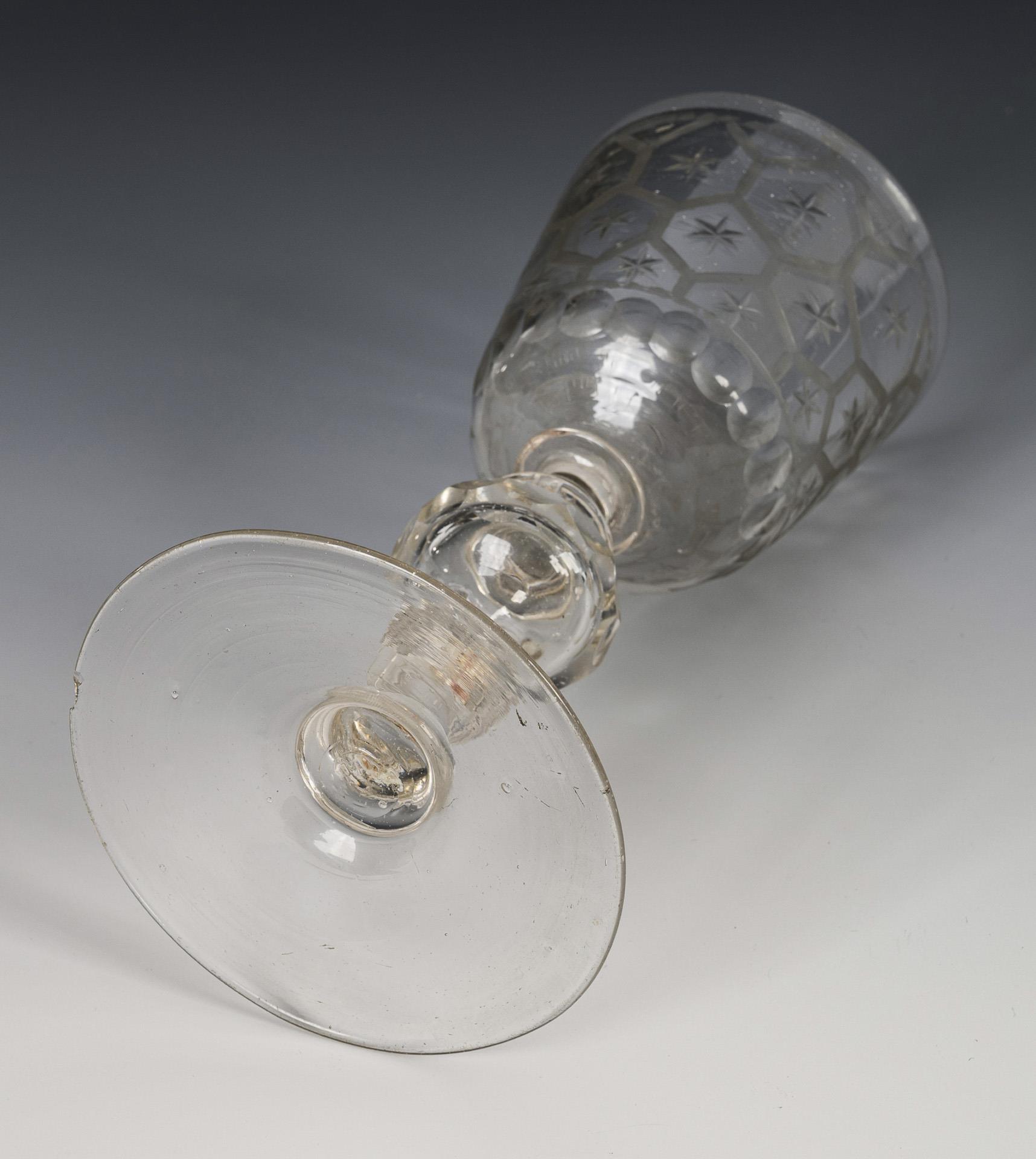 Konische Kuppa mit Wabengravur sowie Sternen- und Olivenschliff, mehrfach gegliederter Schaft mit wabenfacettiertem Hohlbaluster und Scheibennodi, Scheibenfuß; Abriss. Bestoßung am Fußrand.