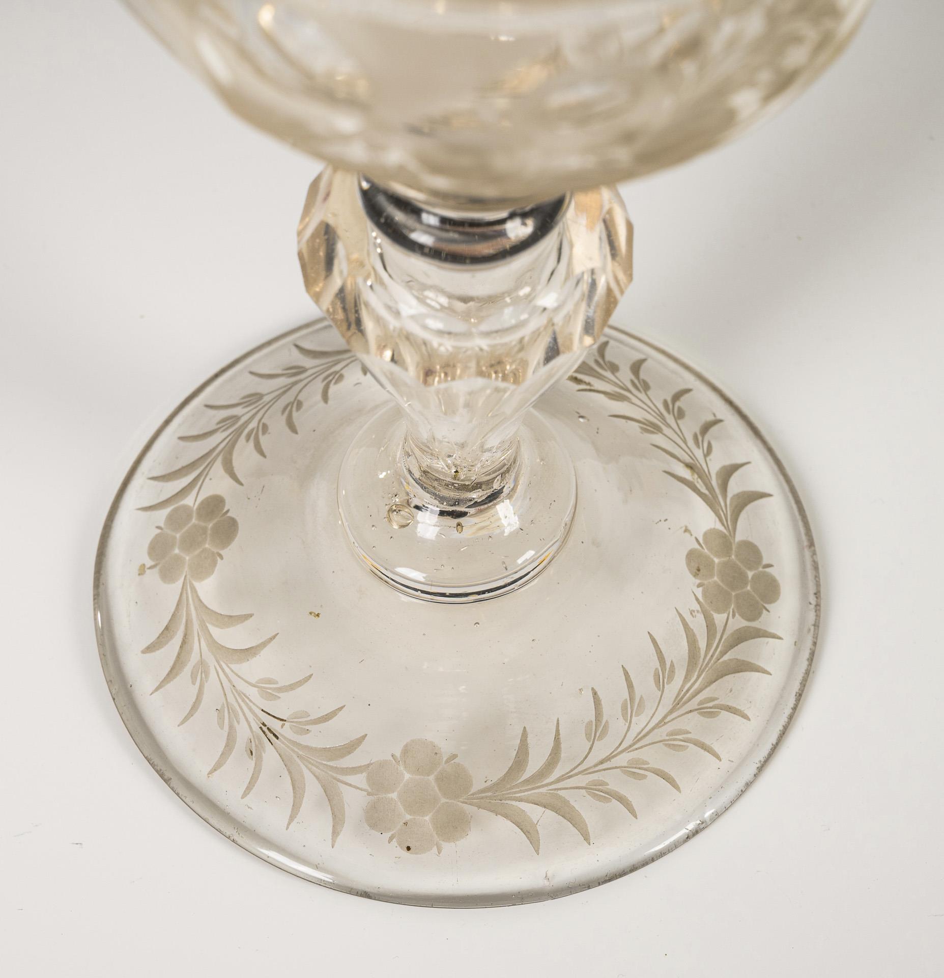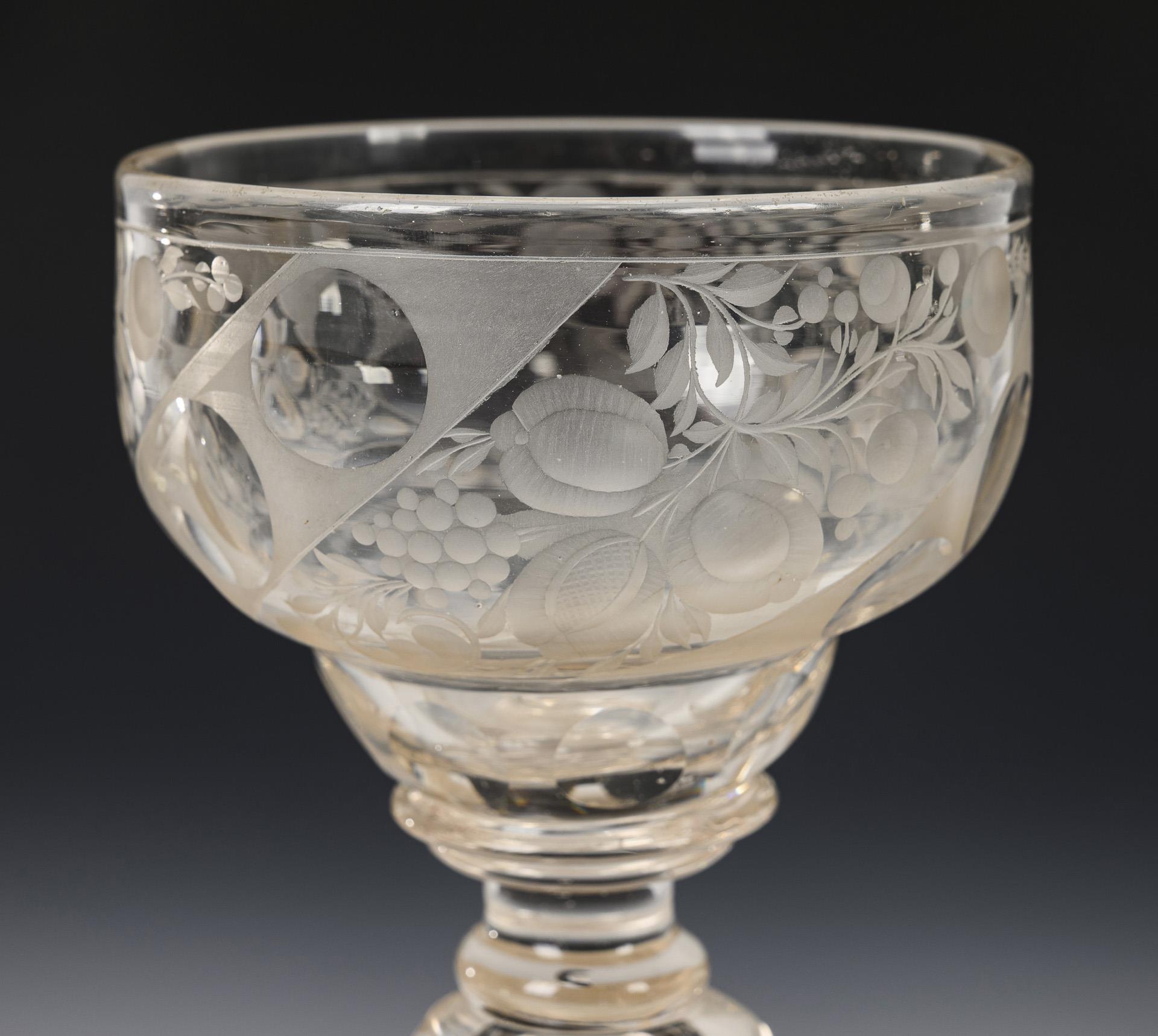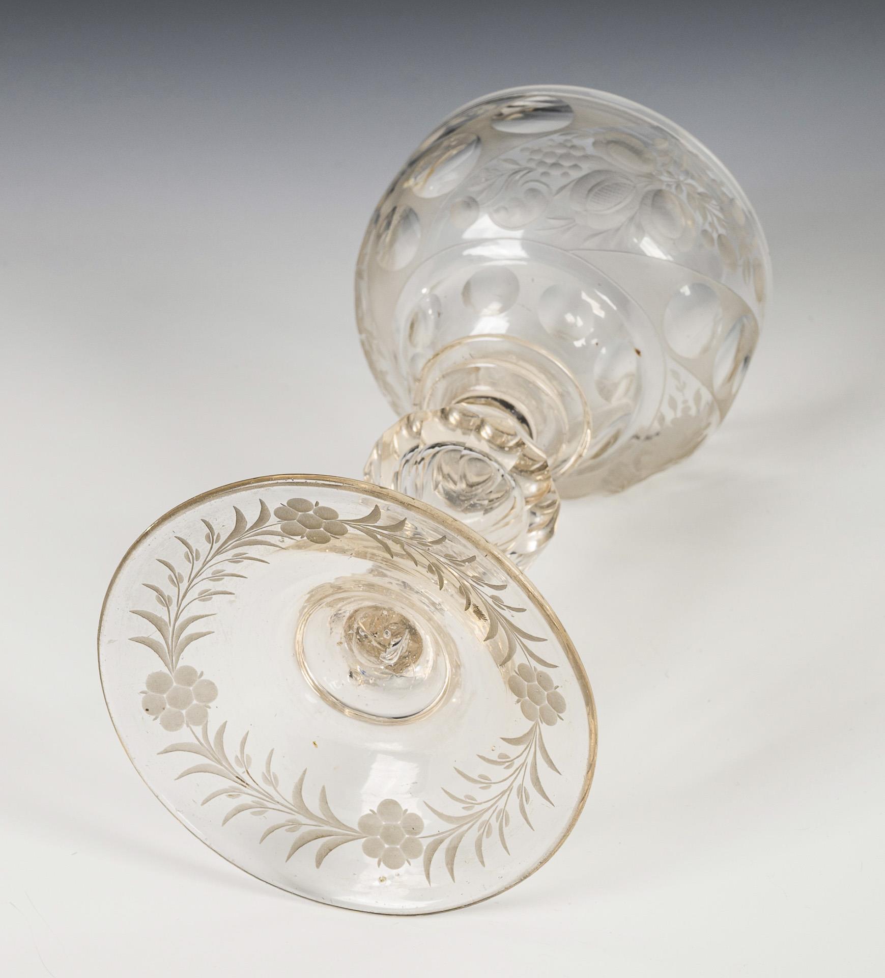 Schalenförmige Kuppa mit Linsenschliffbändern sowie geschnittenen Blumen und Früchten, wabenfacettierter Hohlbalusterschaft, leicht ansteigender Fuß mit gravierter Blatt- und Blütenbordüre. Ohne Deckel.