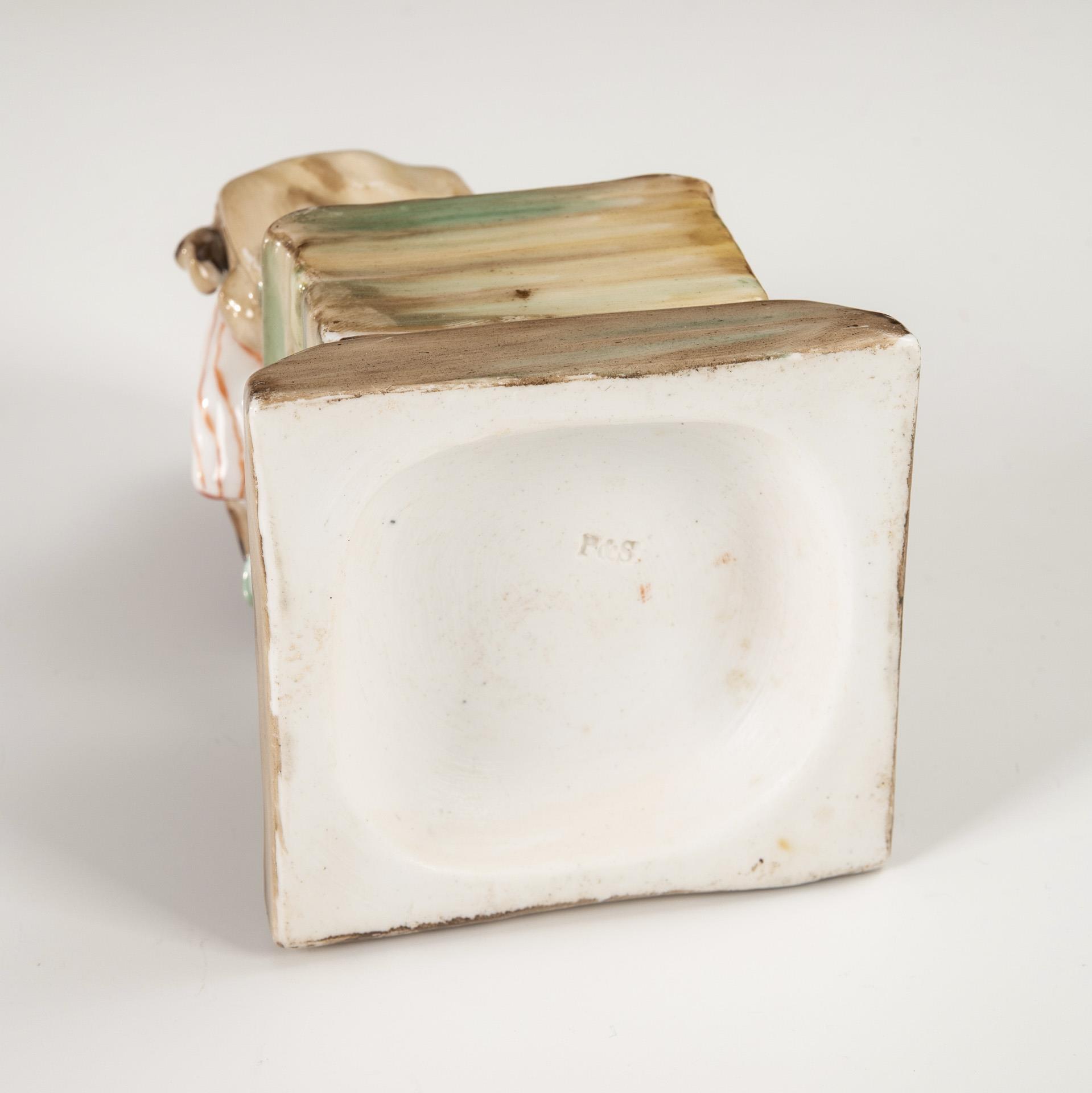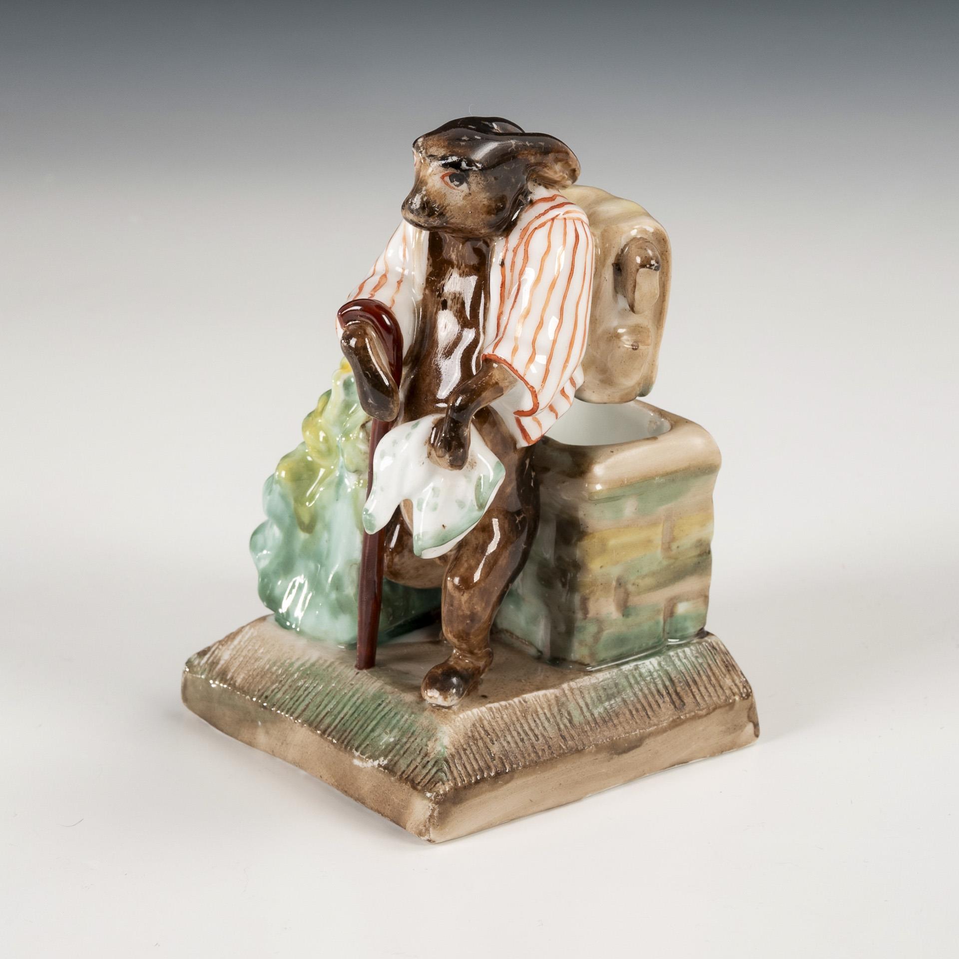 An einem Brunnen als Fidibushalter stehender Hase mit Stock und Rucksack. Haarriss im Stock.