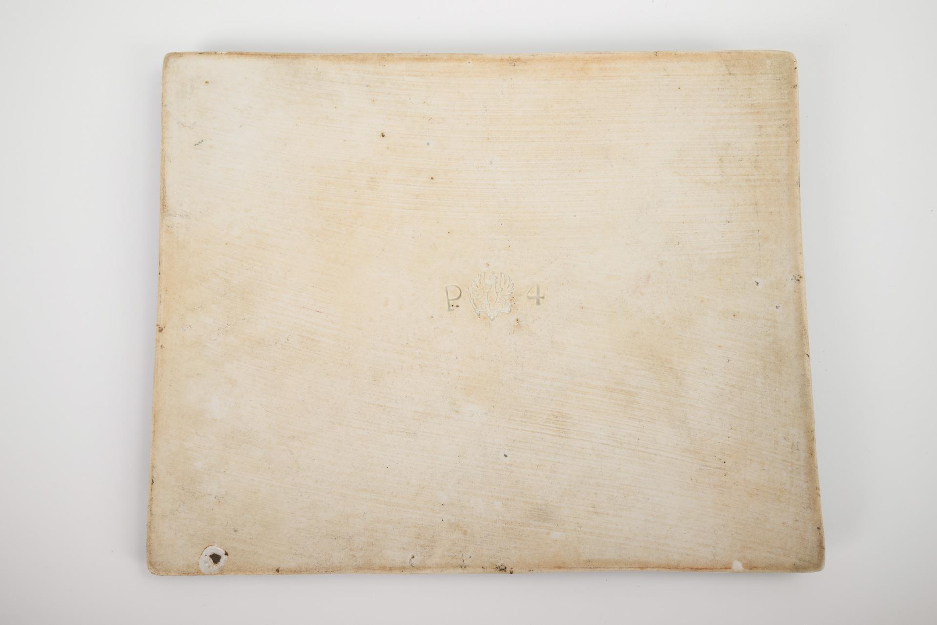Rechteckige, kleine Platte mit der Darstellung eines Jägers, eine Flinte über der linken Schulter tragend.