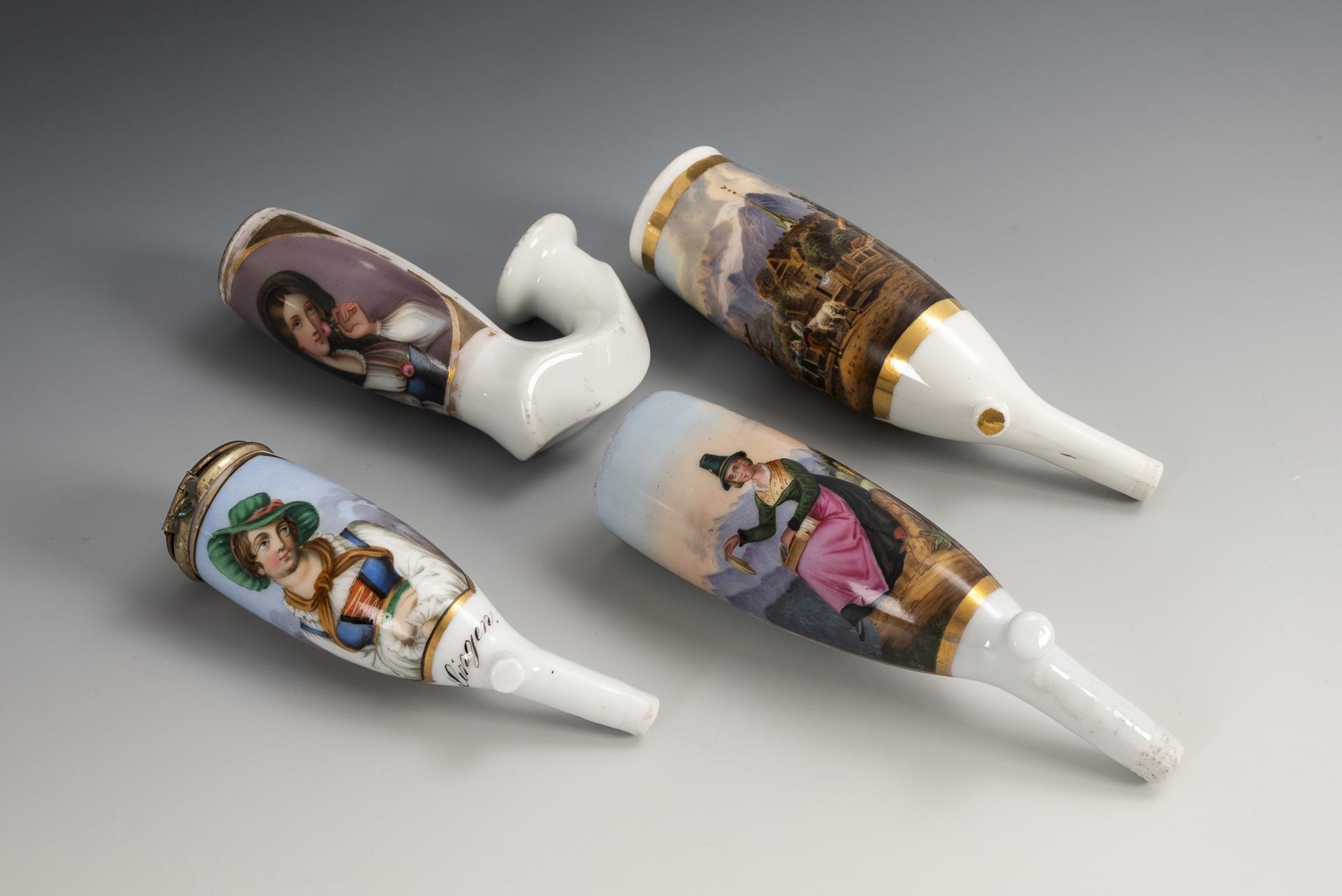 1x Dame in Tracht, Handschuhe feilbietend. / 1x Bildnis einer Dame in Tracht mit Rose. / 1x Bildnis einer Dame in Tracht, bezeichnet "Lingen". / 1x Ansicht eines Bergdorfes mit Pferden und Personenstaffage. Partieller Goldabrieb.