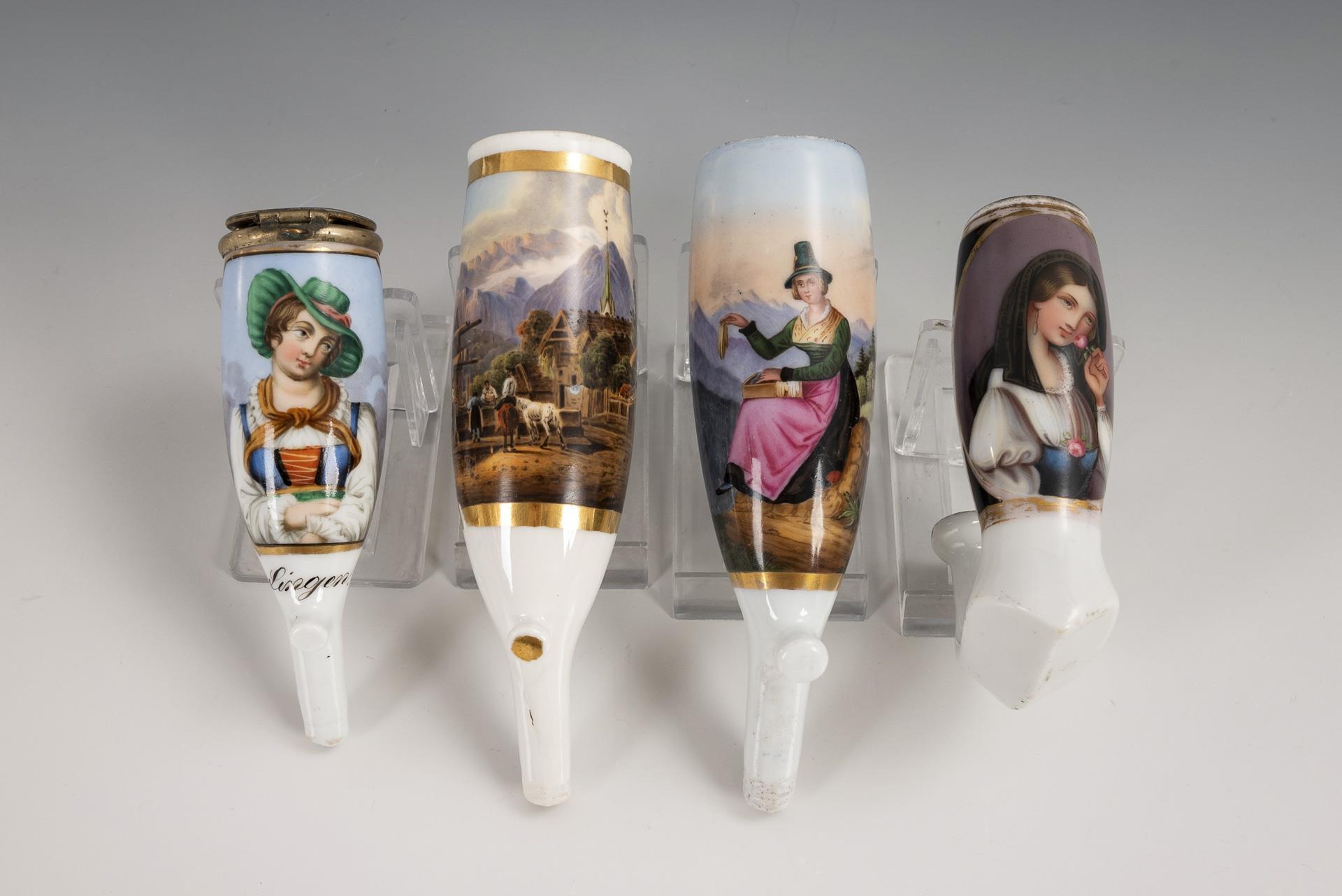 4 bemalte Pfeifenköpfe.