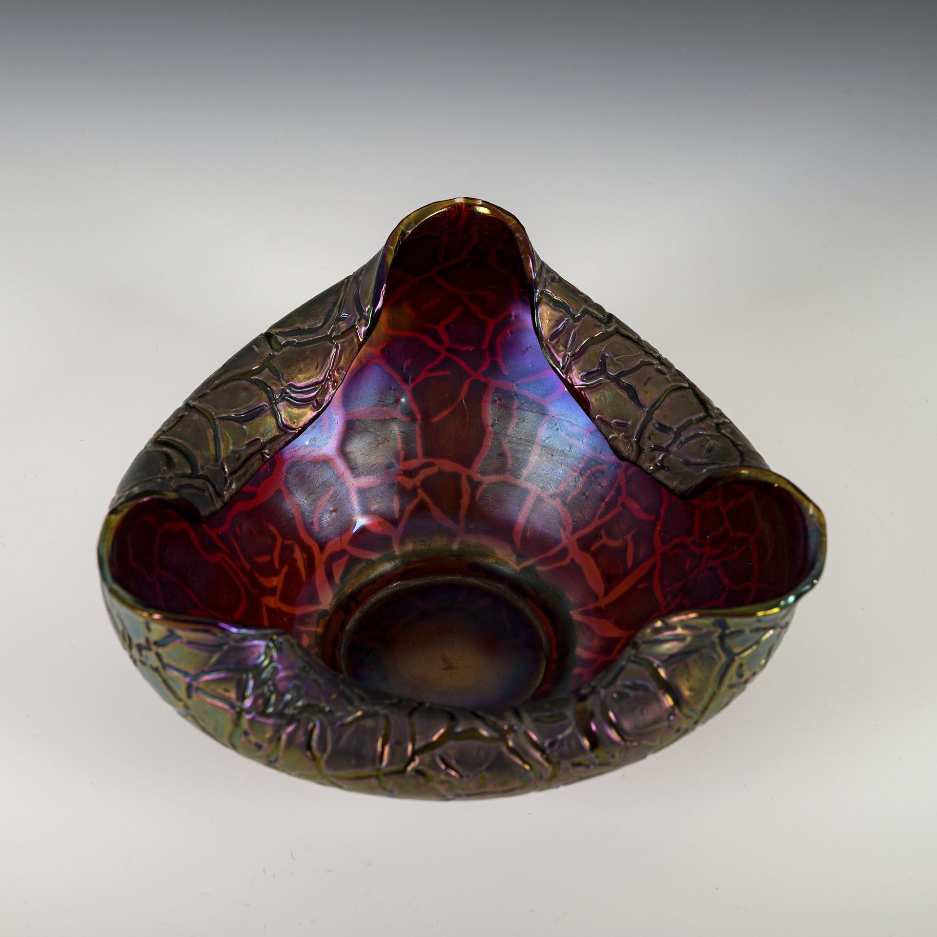Schale mit dreifach nach innen gelappter Mündung. Herstellungsbedingt kleine Beschleifungen am Fuß (für diese war ursprünglich eine Metallmontierung vorgesehen).