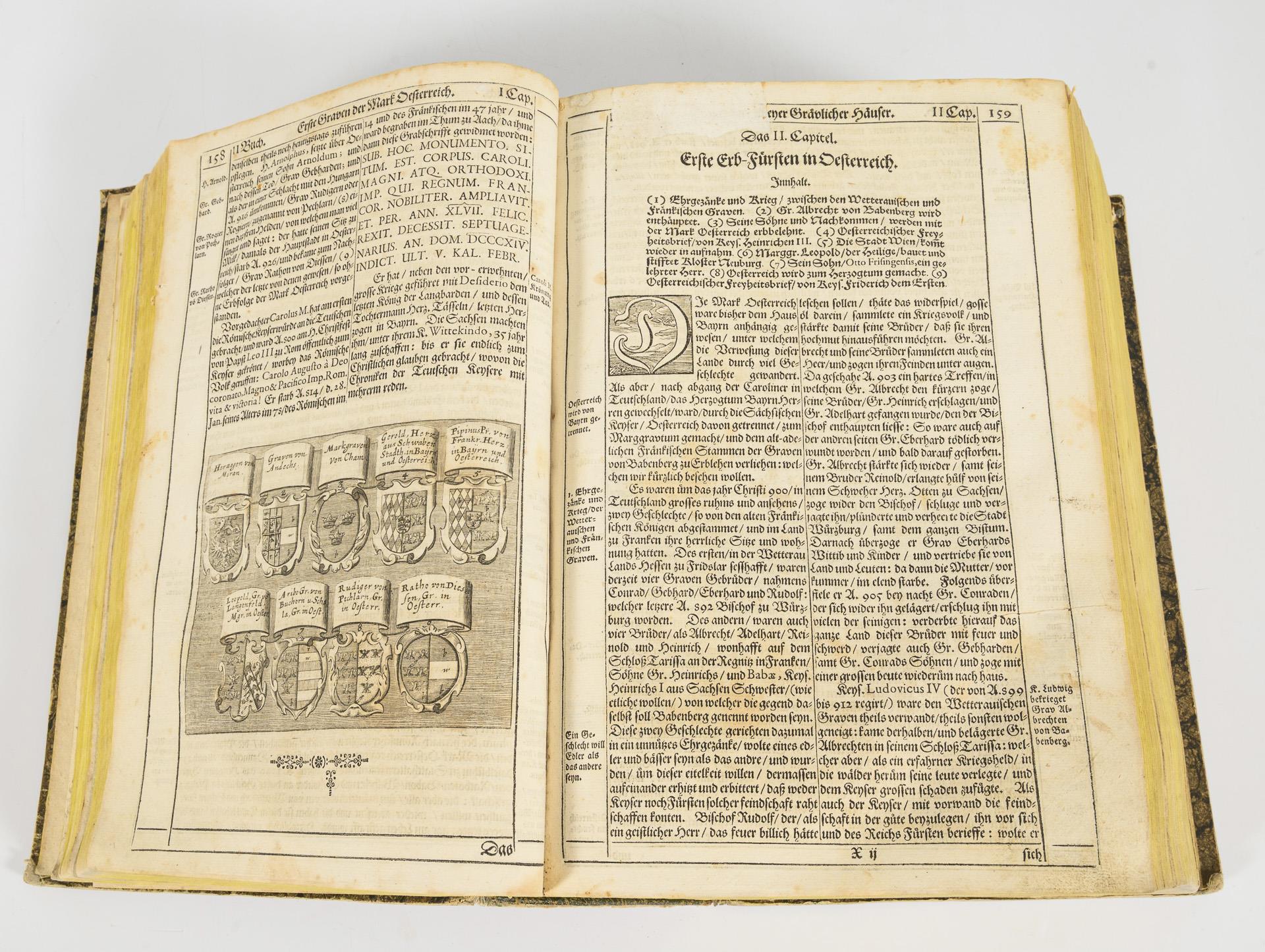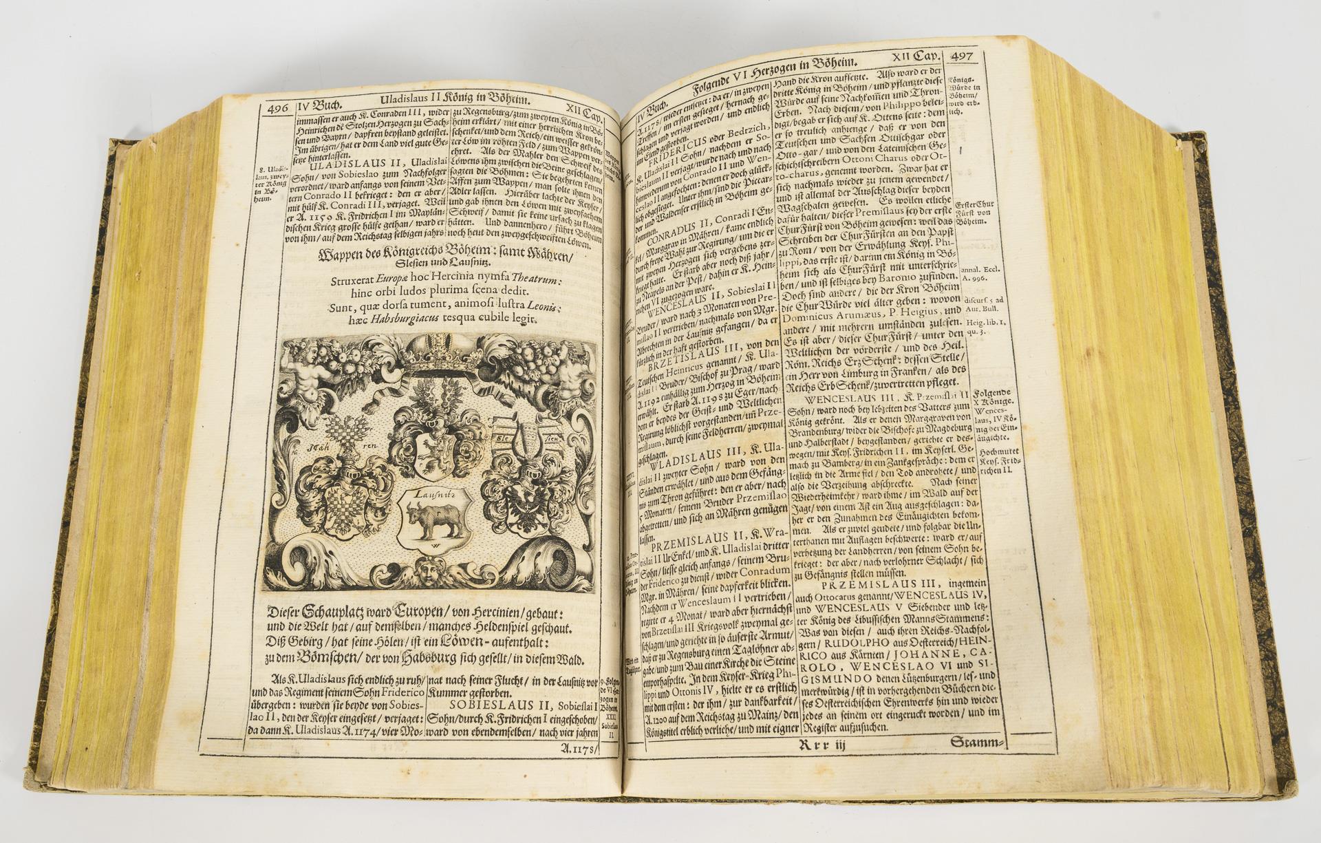 Überarbeitet von Sigmund von Birken. Titelkupfer (hinterklebt), Titelblatt (Rand hinterklebt), (36), 1416, (34) Seiten und zwei gefaltete Blätter, im Pappeinband mit Gelbschnitt. Zahlreiche Textabbildungen. Neben Personalgeschichte auch ein Kapitel über den Buchdruck und dessen Auswirkungen. Block im oberen Bereich alt beschnitten, einige Seiten gelegentlich hinterklebt, Blatt 767 mit Textverlust, es fehlen die Seiten 57/58, 241/242.