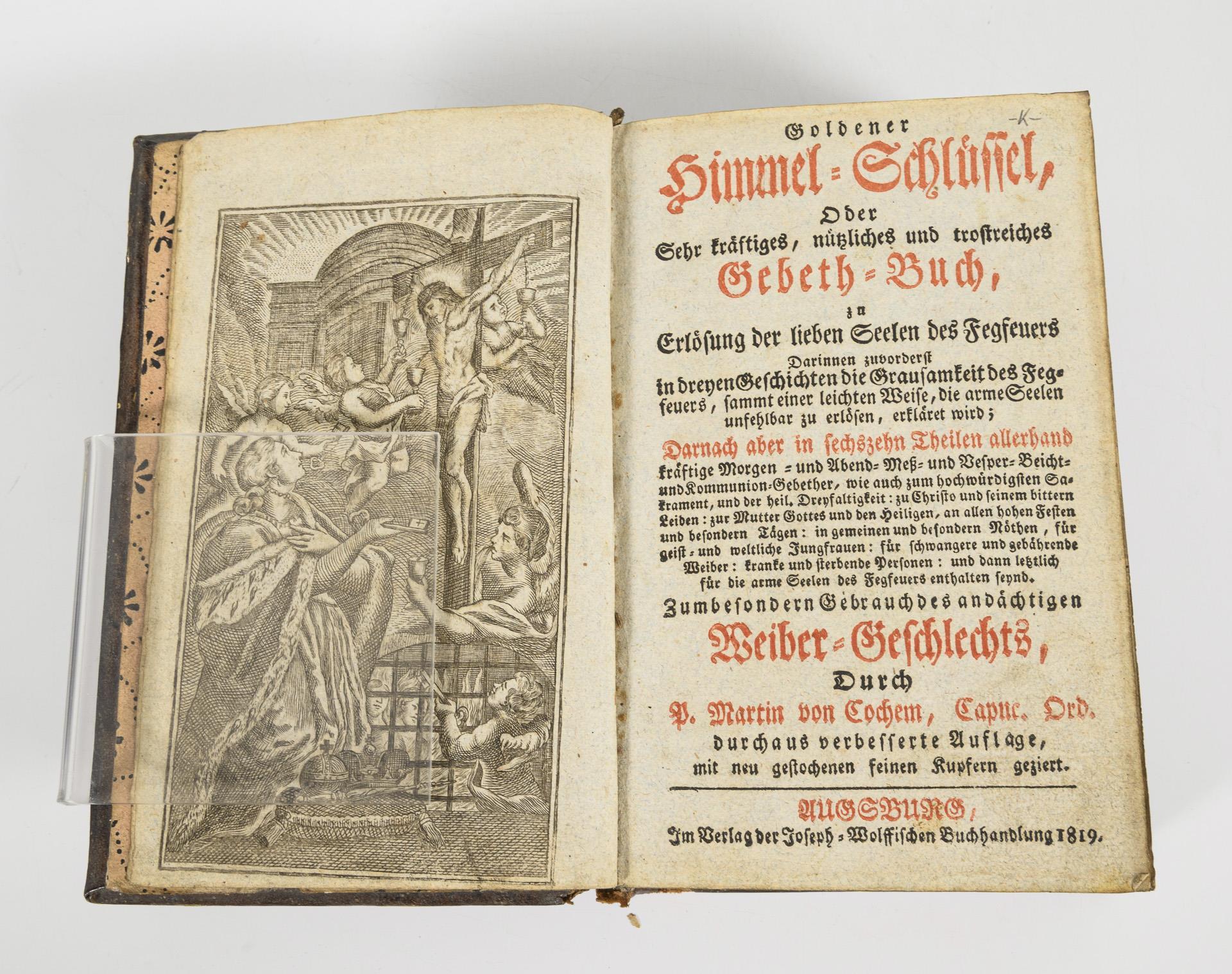 Gottfried Arnolds ... Paradischer Lust-Garten, Erfüllet mit Andächtigen Gebehten ...", Stendal und Gardelegen, in Verlegung Ernst Heinrich Campen, 1717. (26), 688, (8), 192 Seiten im Ledereinband. 16 x 7,5 cm. / Martin von Cochem: "Goldener Himmel-Schlüssel, Oder Sehr kräftiges, nützliches und trostreiches Gebeth-Buch, zu Erlösung der lieben Seelen des Fegfeuers ...", Augsburg, Im Verlag der Joseph-Wolffischen Buchhandlung 1819. 756, (11) Seiten, im geprägten Ledereinband. 18 x 12 cm.