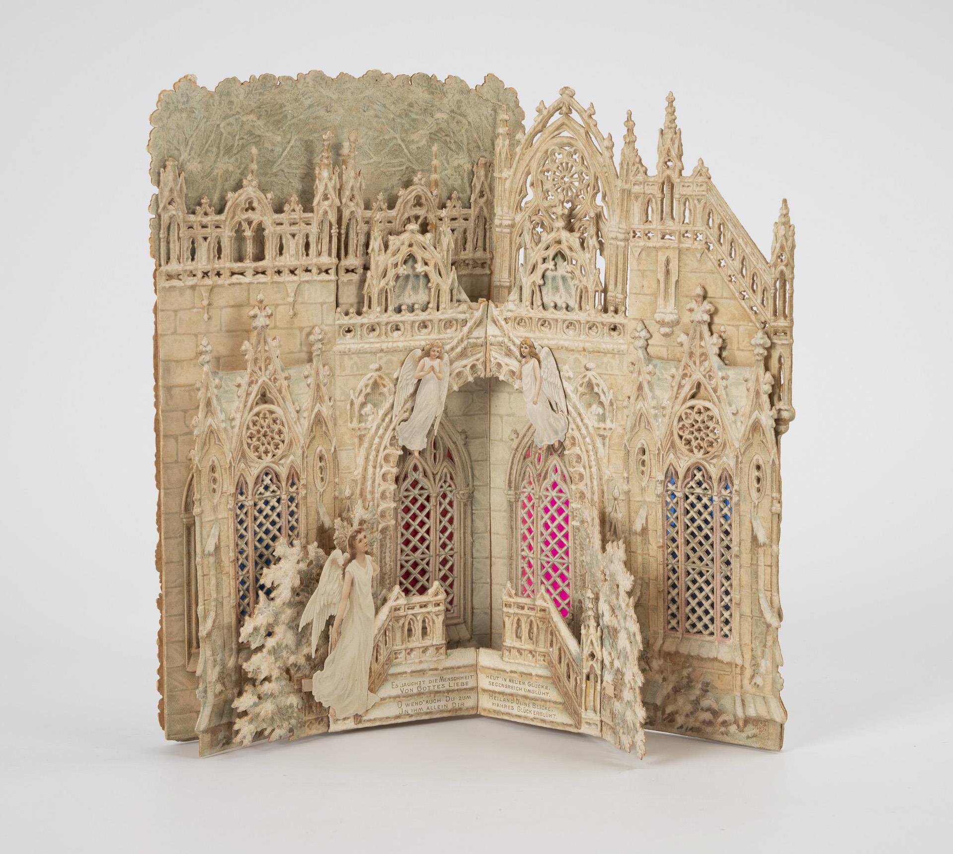 Alte aufstellbare Weihnachtskarte in Architekturform von 1898, verschiedene Oblaten mit Weihnachtsmännern, Kinderbuch mit Weihnachtsgedichten (Reprint), Aufsteller und Sammelbildchen. Dazu ein "Album für illustrirte Postkarten" mit ca. 60 Weihnachts- und Oster-Karten. Teils mit Altersspuren und kleinen Defekten.