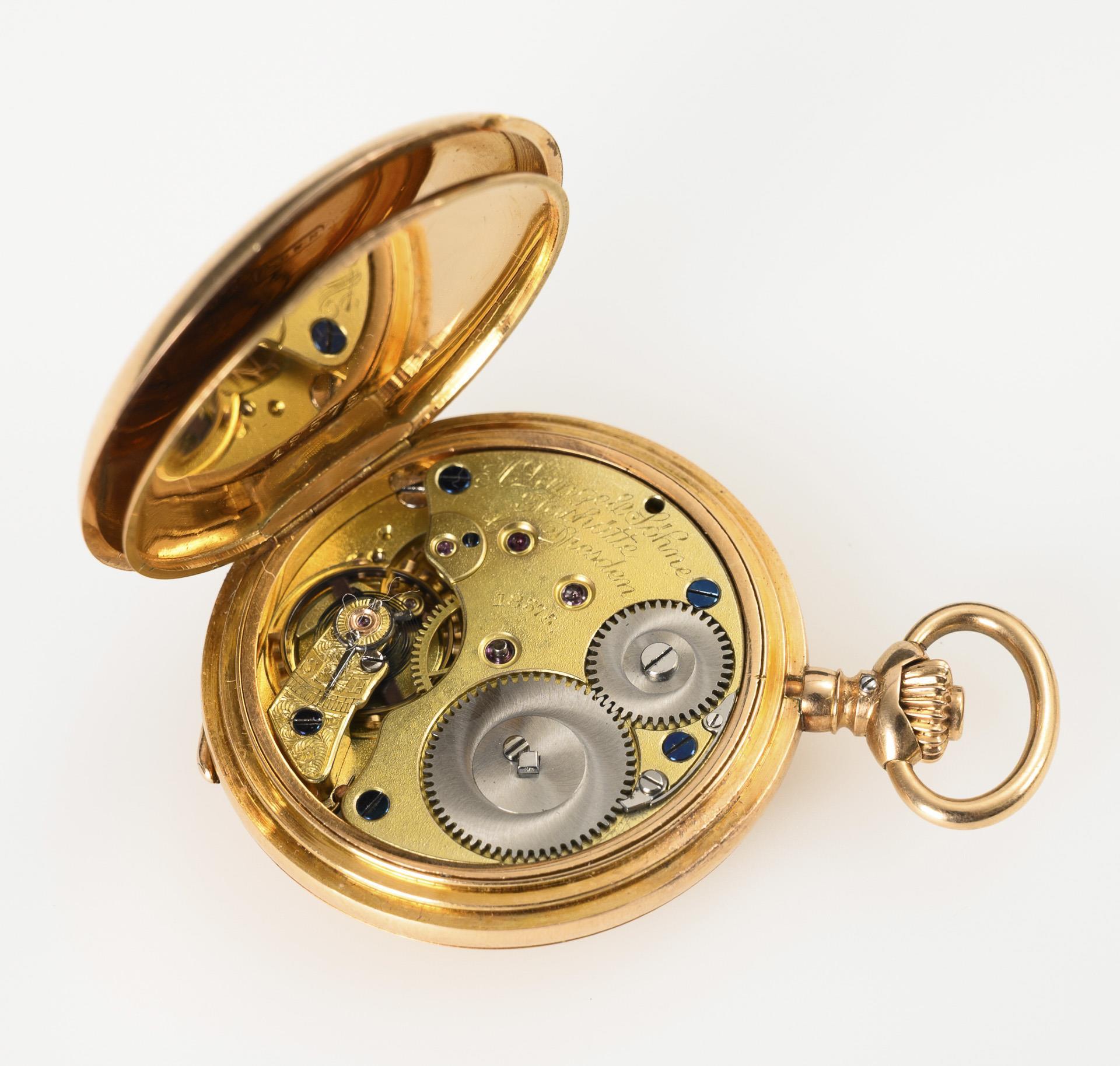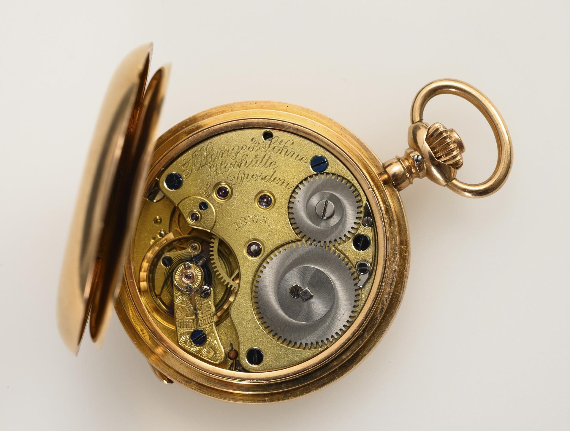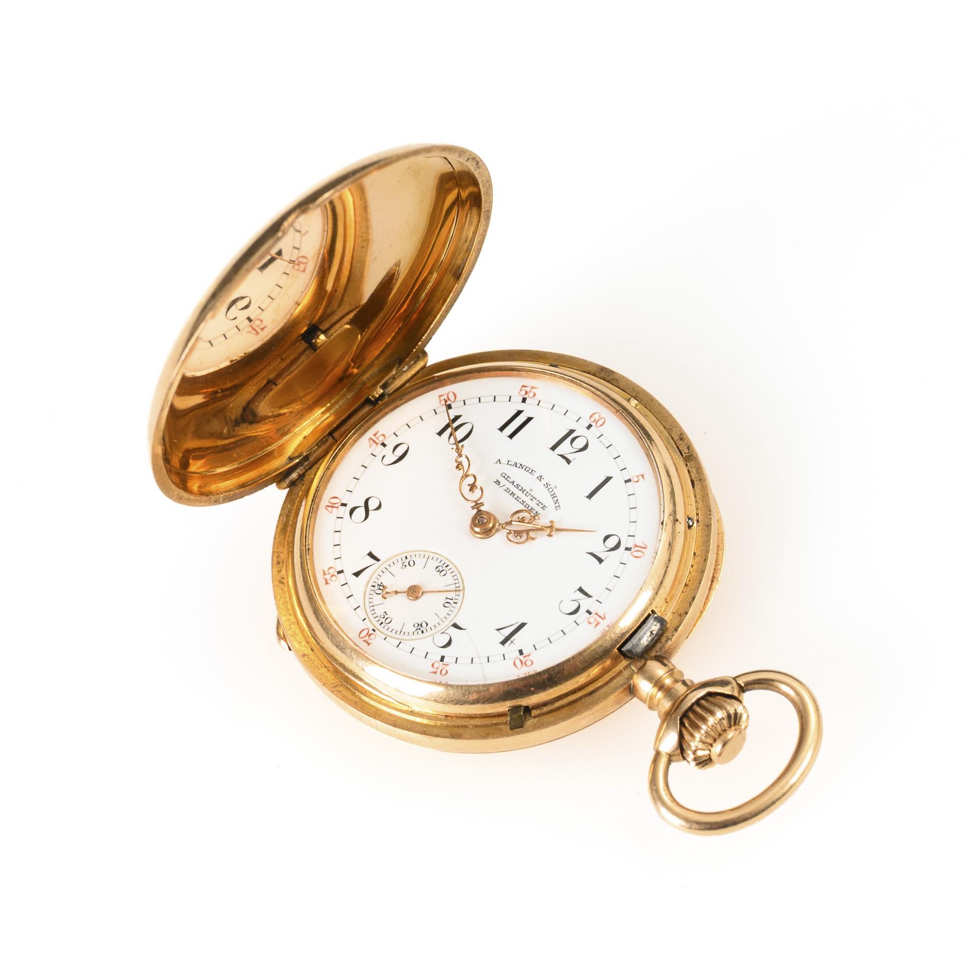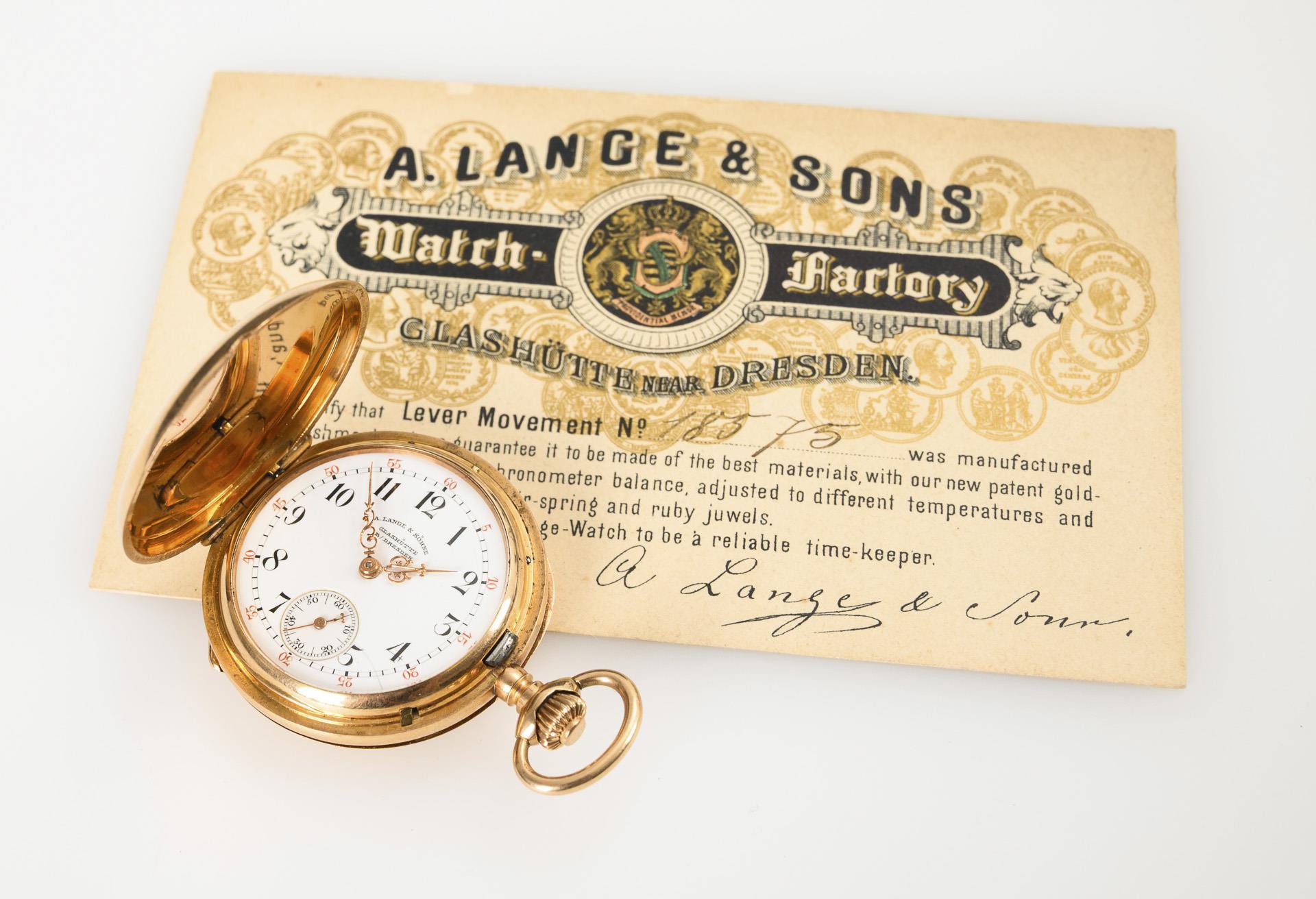 Gemarktes und gekörnt vergoldetes Dreiviertelplatinenwerk mit Glashütter Goldankerhemmung, gebläuter Breguet-Spirale und Schrauben, Schraubenkompensationsunruh, Steinen, Kronenaufzug. Im Kurzzeittest funktionstüchtig. Weißes Emailziffernblatt mit schwarzen arabischen Stunden und roten arabischen Minuten, Minutenkranz, kleiner Sekunde und Louis XV-Zeigern, bezeichnet "A. Lange & Söhne Glashütte b/Dresden".