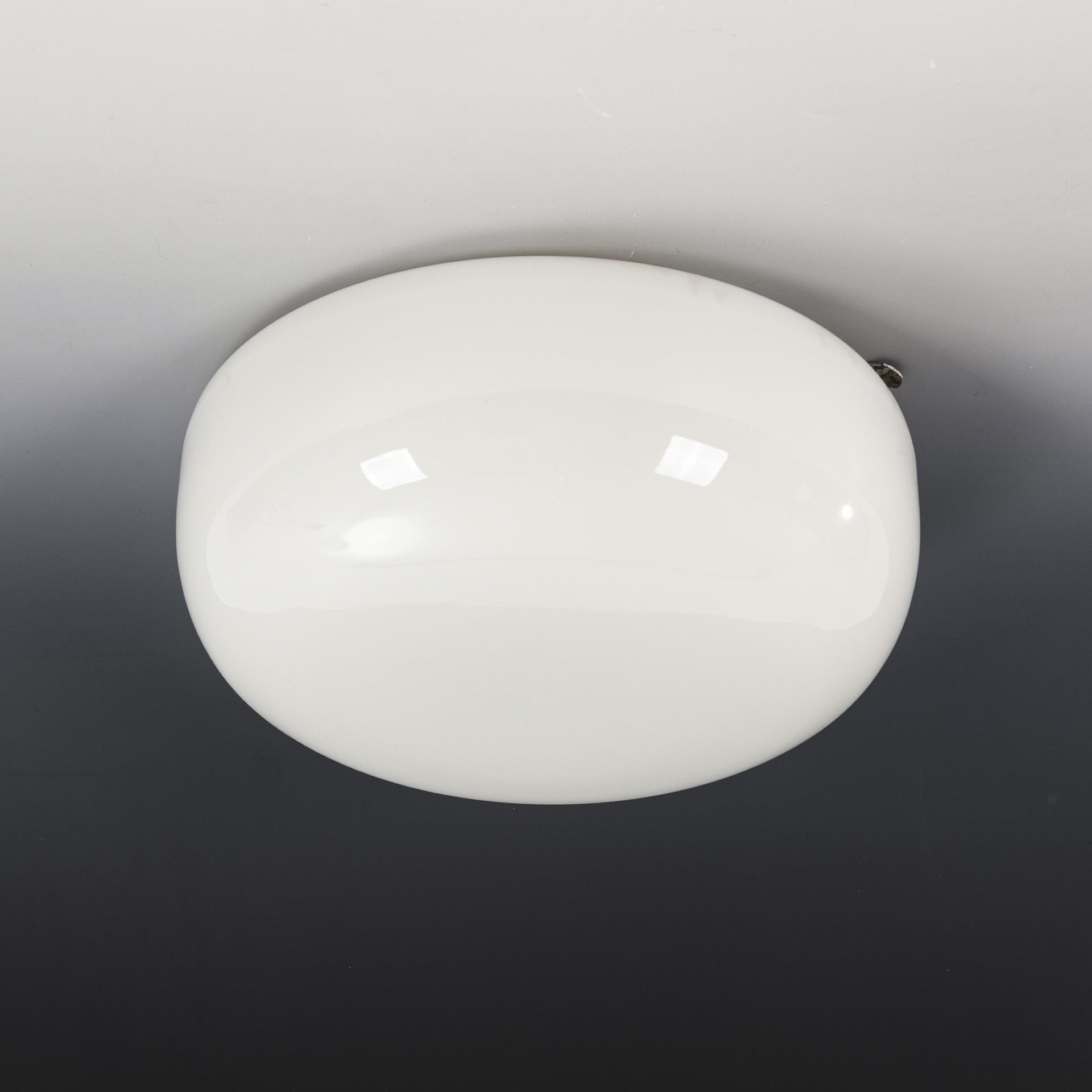 Farbloses Glas mit weißem Innenfang, Eisenblech mit silberfarbenem Überzug, Elektrifizierung mit 2 Schraubfassungen. Ø 29 cm, H 13 cm. 1,4 kg.