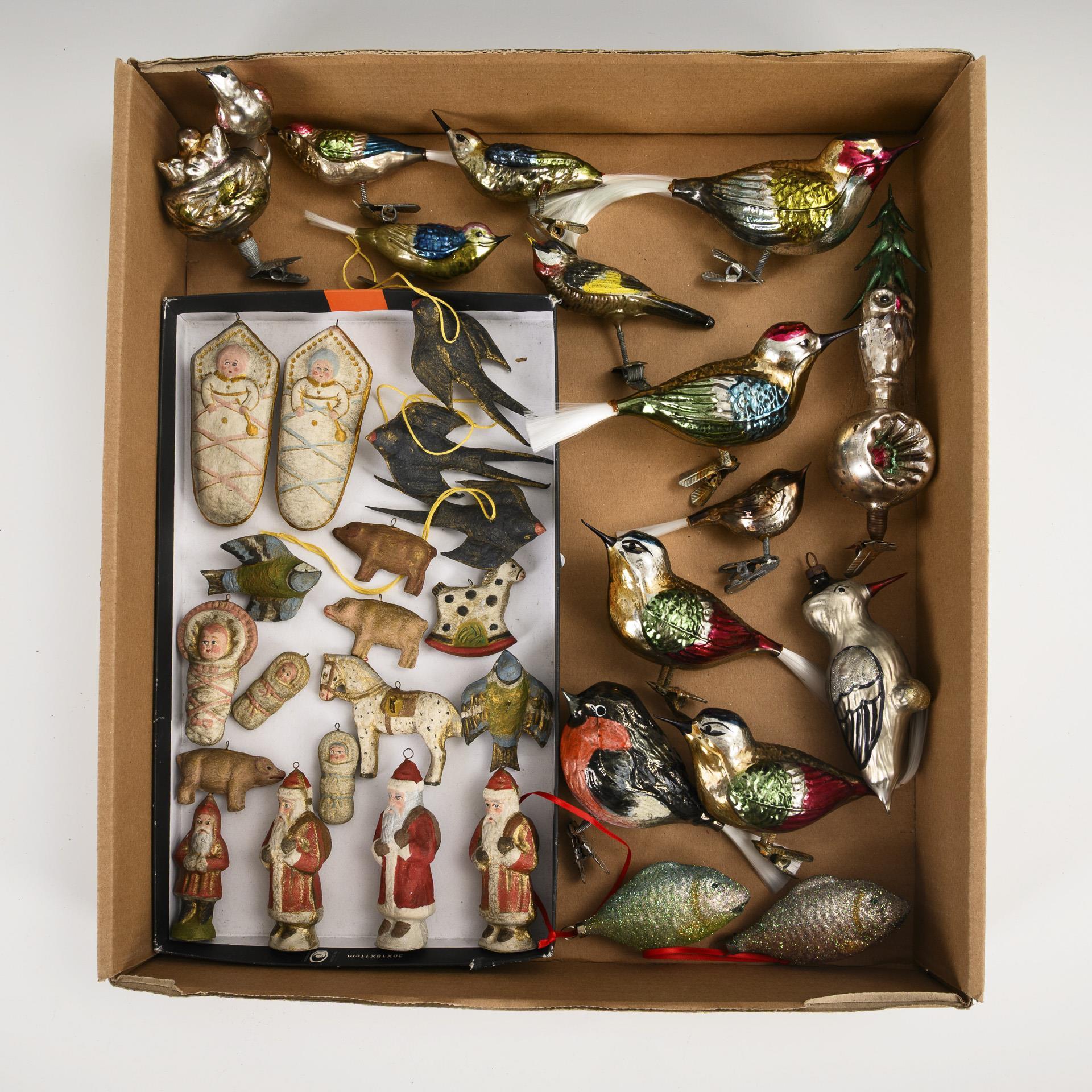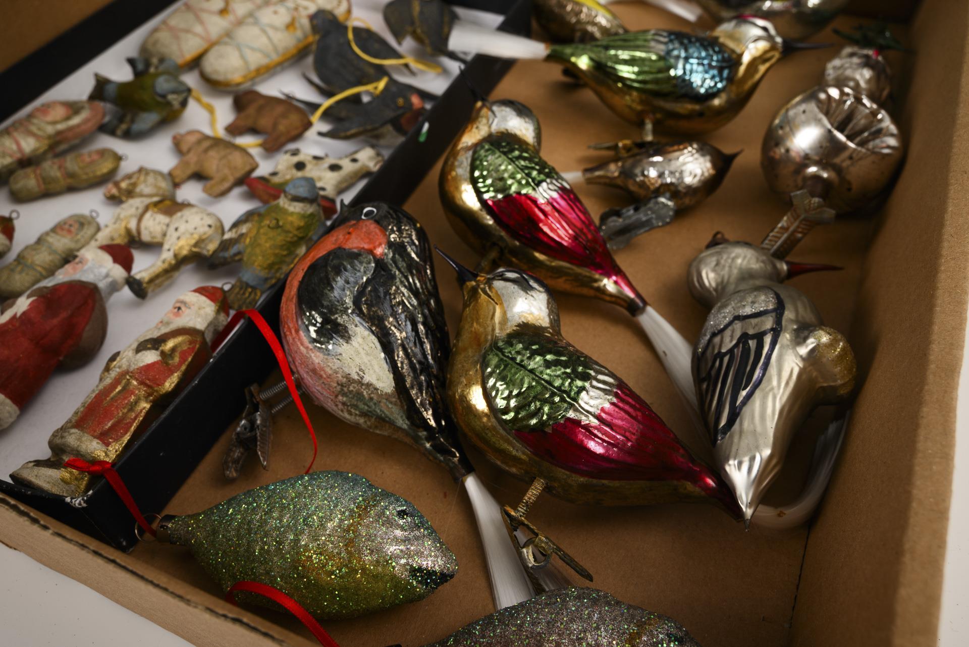 13 Vögel, 2 Fische mit Glimmer und ca. 18 Teile Baumschmuck in Art der Dresdner Pappe (Schweine, Wickelkinder, Weihnachtsmänner etc.). Teils leichte Altersspuren.