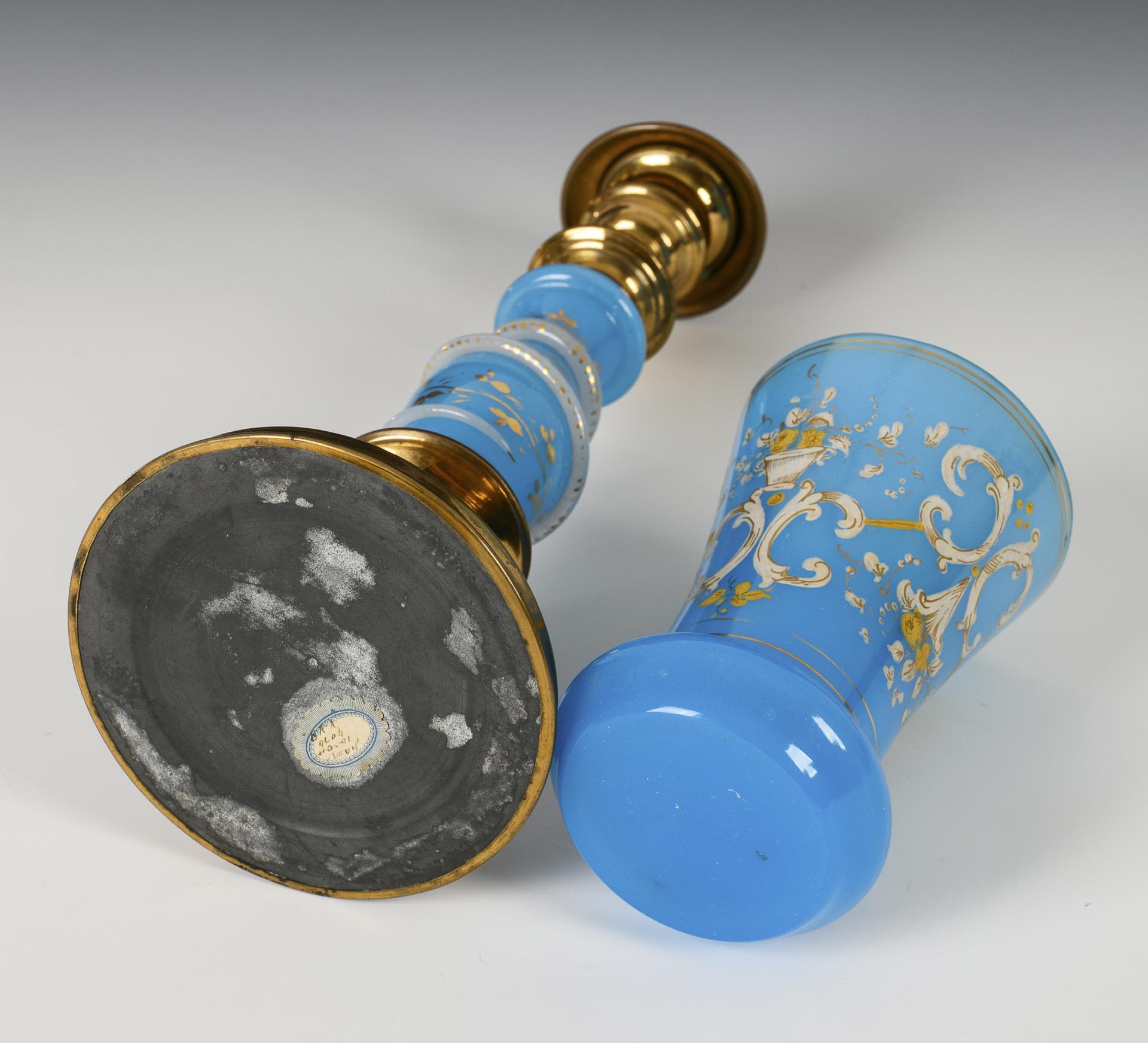 Hellblaues und 1x weißes Alabasterglas, Goldstaffage, 1x Emailmalerei. Leuchter (H 25 cm), Becher (H 12,5 cm).