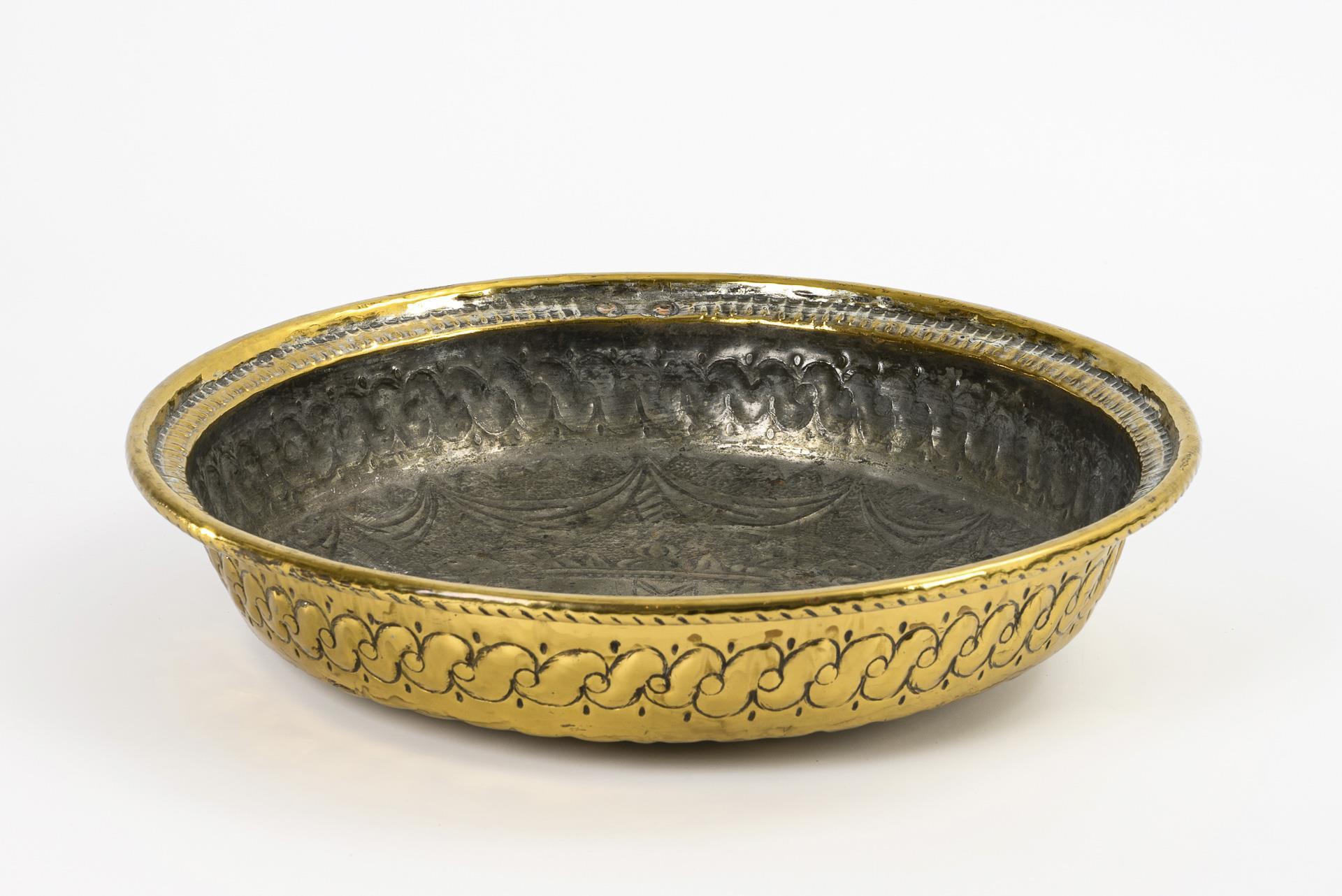 An Beckenschlägerschüsseln erinnernde große Schale mit reichem Ornament sowie zentralem Wappen (mittiger Rautenpfahl), das von Löwen gehalten wird. Minimale Alters-/Gebrauchsspuren.