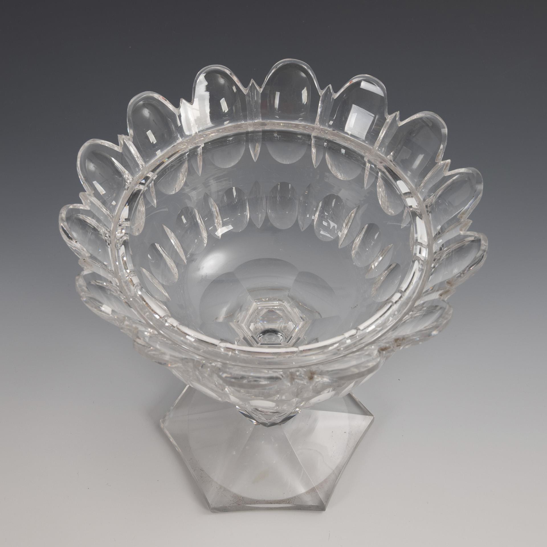 Halbkugelige Kuppa mit mehrpassigem Rand, Oliven- und Kerbschliffkranz, facettiertem Schaft mit eingestochener Luftblase und sechseckigem Fuß; ausgekugelter Abriss. 1x wenige, minimale Randbestoßungen und 3 minimale Fußbestoßungen.
